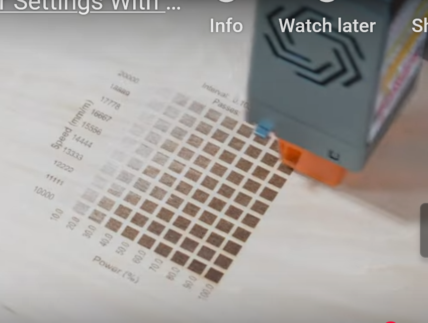 I bring the laser into this discussion because the Lightburn software that controls it has a really nice feature I'd never seen before. When you cut a new material for the first time, just like on a CNC router, you have to determine the optimal feed rate and power levels (lasers vary the power output as vs. the the spindle rpm's). You input the minimum and maximum power you want displayed on the chart and the minimum and maximum feed rate. Then the laser produces a series of small squares that have been etched using the increasing travel speed across the bottom of the chart and the increasing power level going up the side of the chart. If you had 5 feed rates, and 5 power levels you would get 25 small squares showing the results of the intersections of the various speeds and power levels.