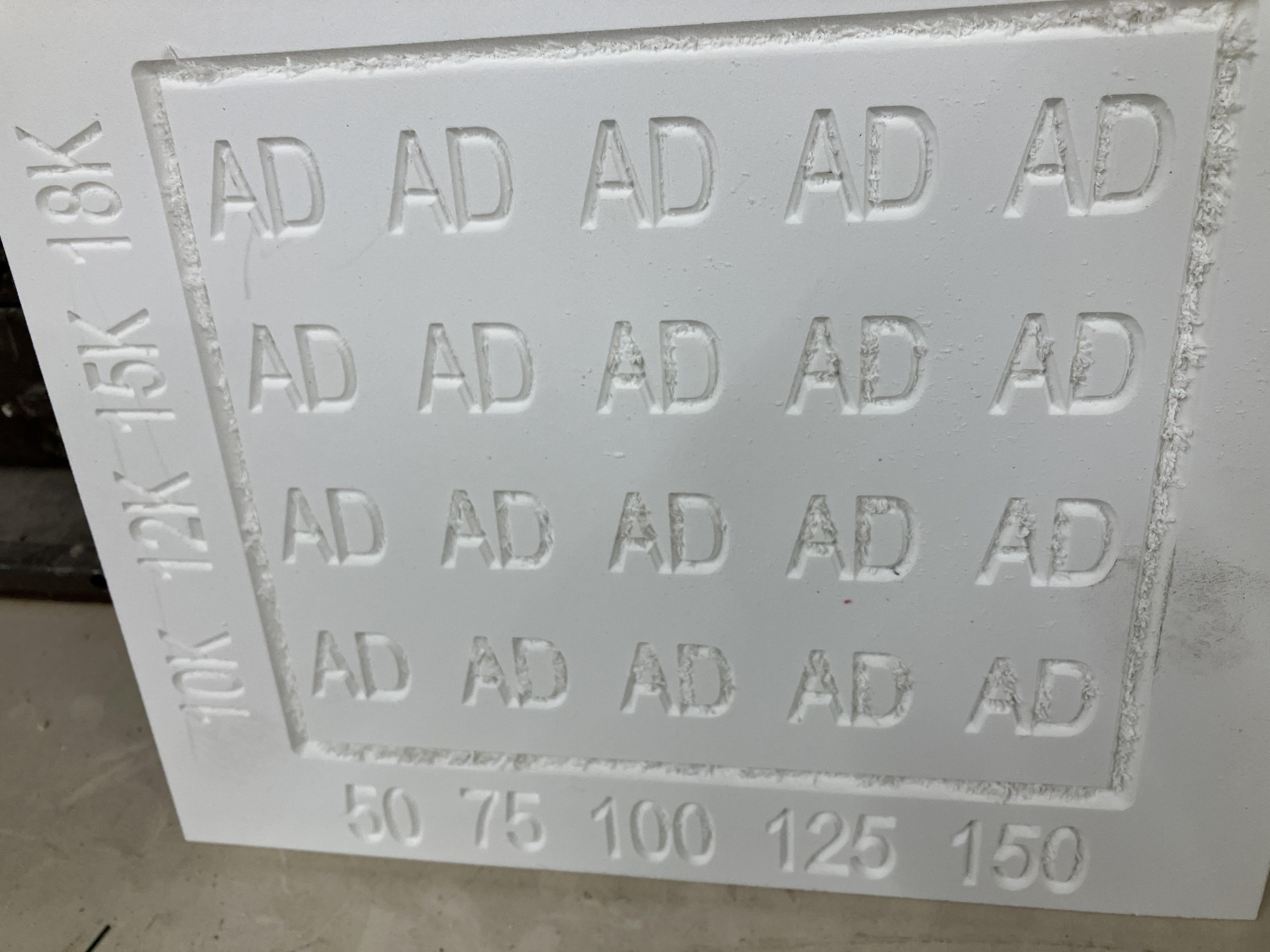 Well, today it occurred to me to create a similar V-groove chart in PVC to see what feed rate/rpm combination gave me the best results. I used two letters that tend to accumulate a lot of heat welded chips to the carved line: A and D. Low and behold, I didn't get the results I expected.