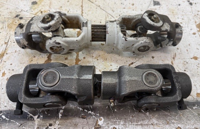 The 2 yokes with the splined shaft are ok. But the other 2 are bent and I doubt are fixable. I've looked online, called a few molder service and repair companies (including Ackhust) with no luck, and gone to a local auto parts store. The auto part clerk thought the U joints were Spicer 1350's, which were inexpensive and readily available so I ordered a couple.