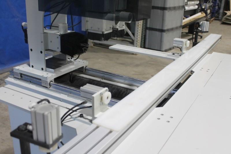 Work Table: (2) NC Controlled extruded aluminum support rails with (6) Non-Marking manually positioned pneumatic panel clamps.