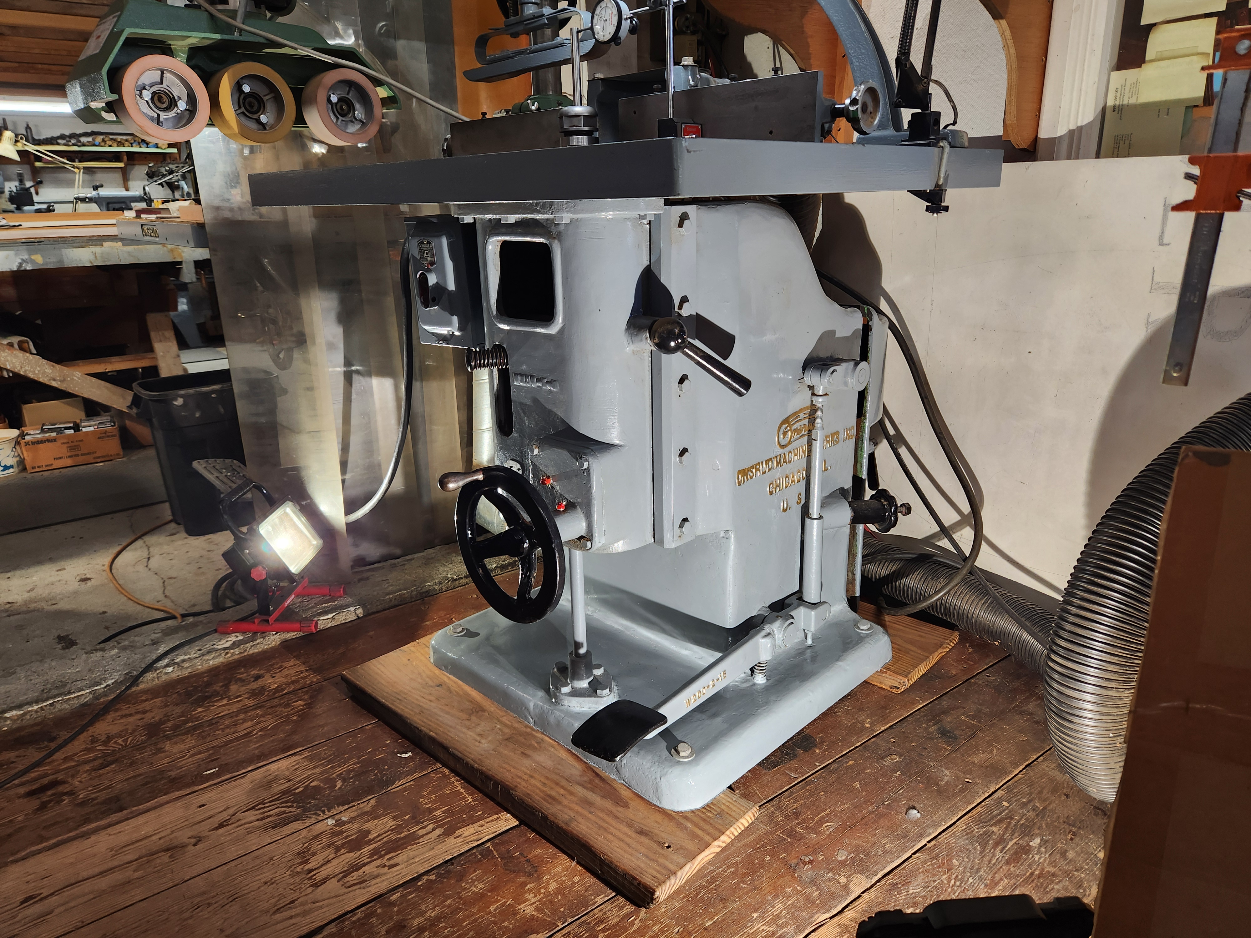 Onsrud W-200 Router/Shaper, 5hp?, 230volt, 3 Phase. Reconditioned and in Excellent shape and comes with a Like/New Steff-Maggi Stock Feeder. Operated in a one man shop who is now retiring. The Router/Shaper is currently set up as a router, but comes with a 1" arbor for shaper heads. The Collet Chuck has been indicated within .001". Router/Shaper comes with 1/4", 1/2", and 3/4" Collets. Comes with at least (100) 3/4" shank router bits and cabinet with slide out shelves. The profiles of the cutters seem to be mostly Victorian style. The Router/Shaper also comes with two boxes of router bits. Also comes with another heavy duty Fence, that I never got around to mounting. The rack of router bits that is on the side of the cabinet does not come with Router/Shaper. Comes with Machine Light. Asking $2900.00. I have a fork lift for loading. 401-824-6585