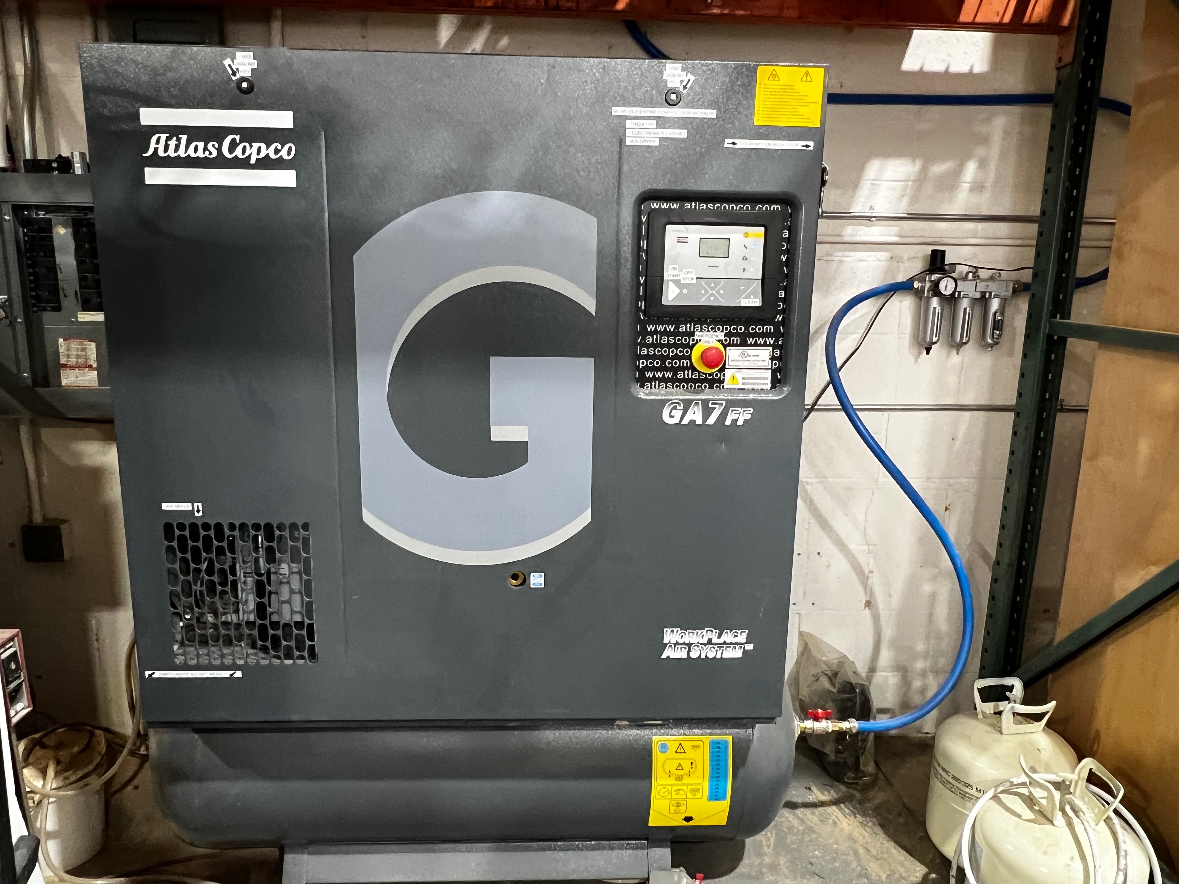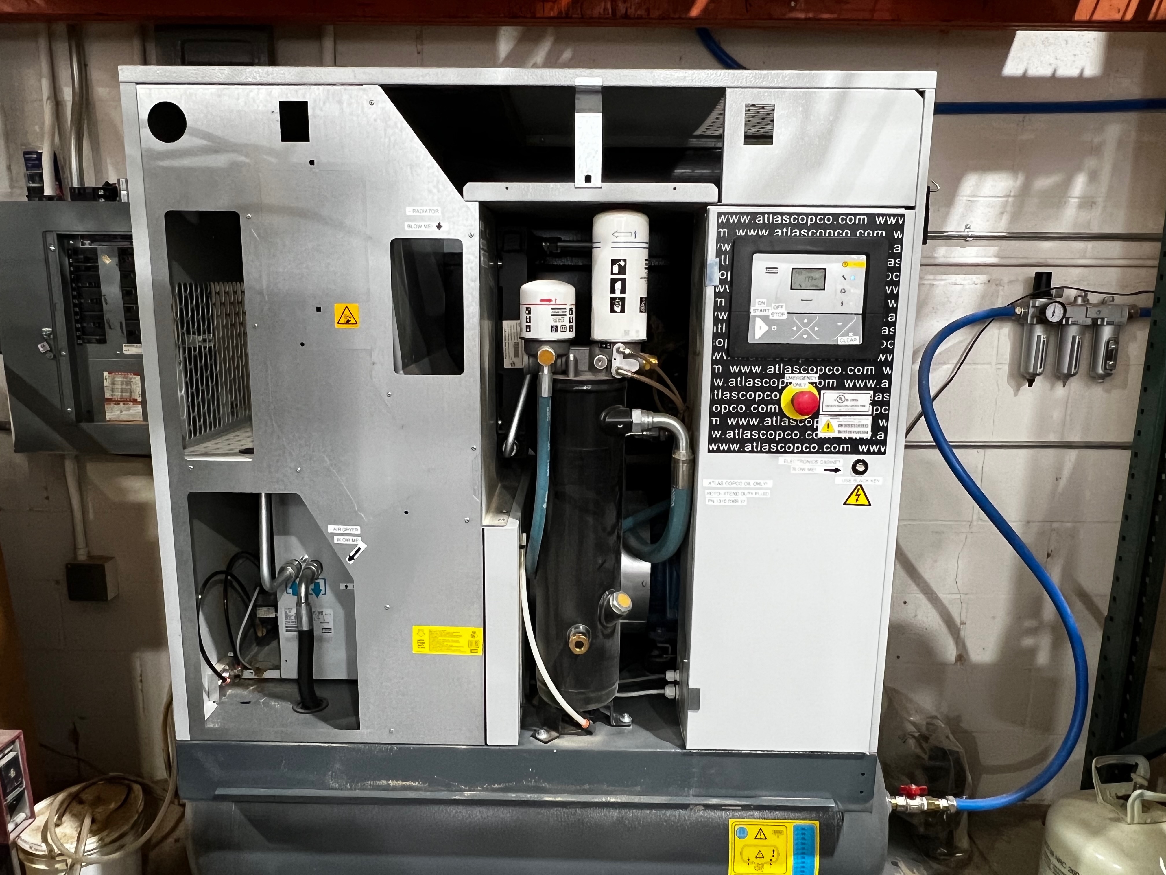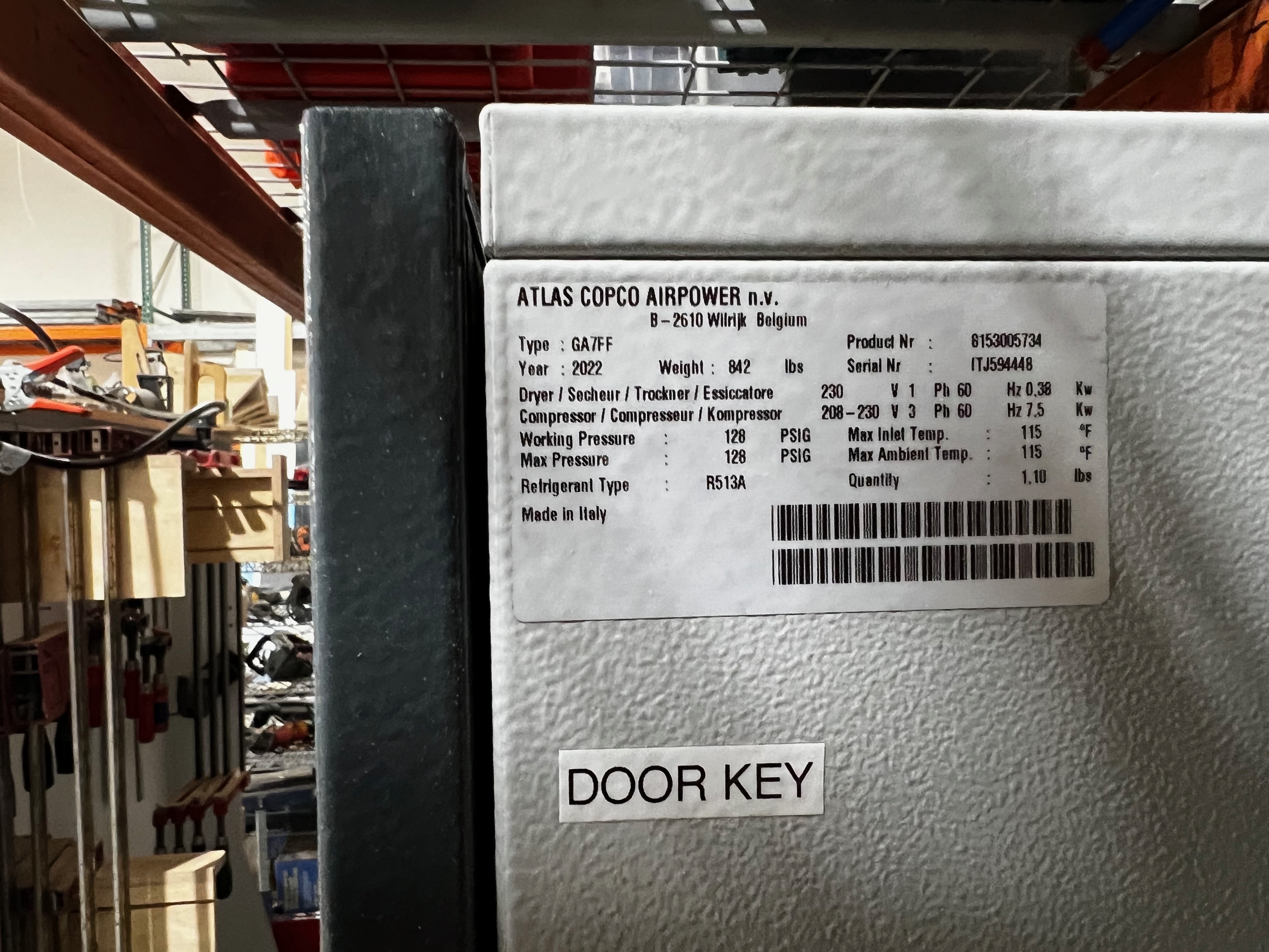 Selling a 2022 Atlas Copco GA7FF-125 rotary screw air compressor in excellent working condition. This is a 10 HP, tri-voltage (208230/460V) machine designed for continuous-duty operation in demanding shop environments. Fully enclosed, quiet-running cabinet with Elektronikon controller and built-in refrigerated air dryer.