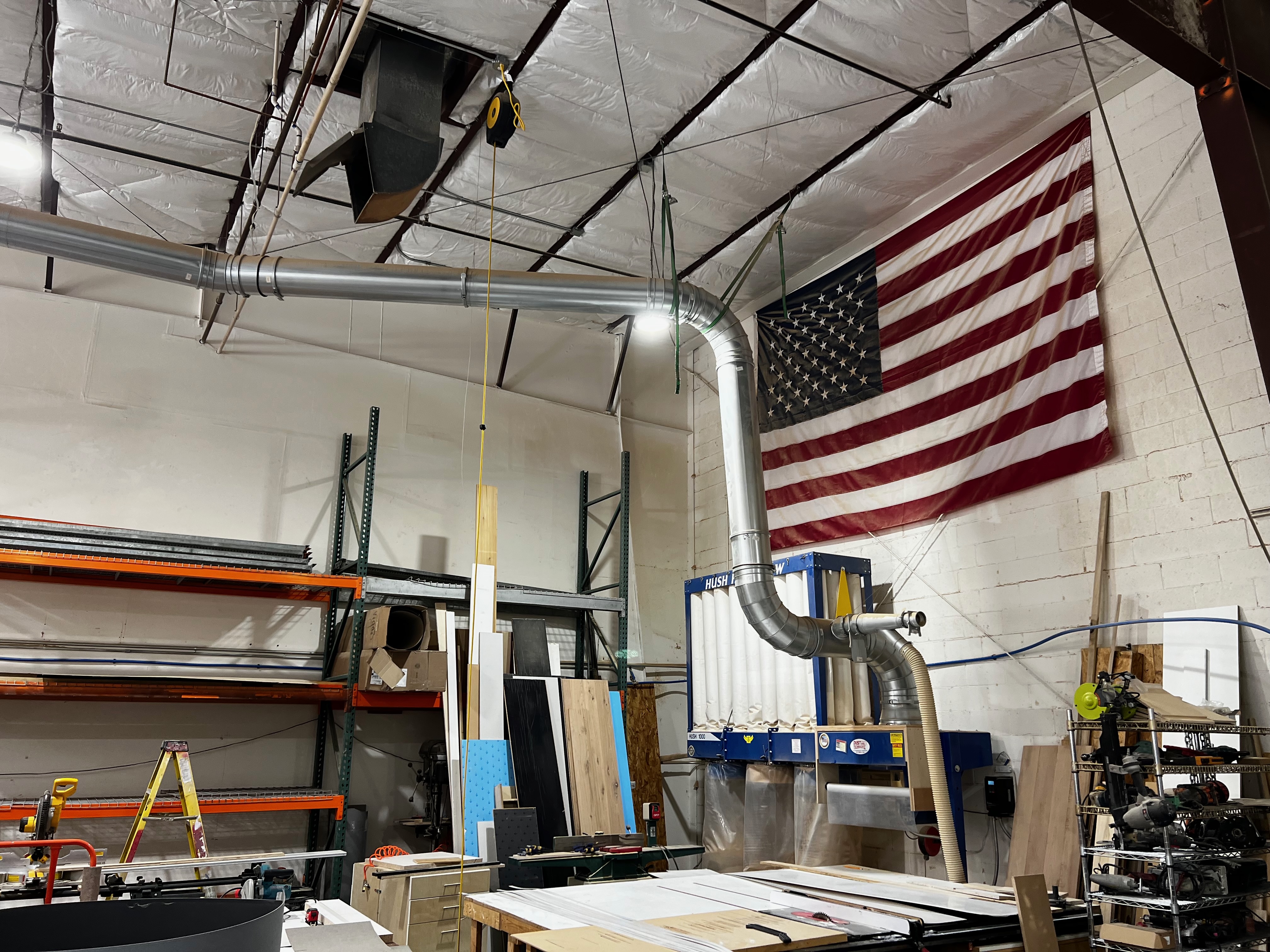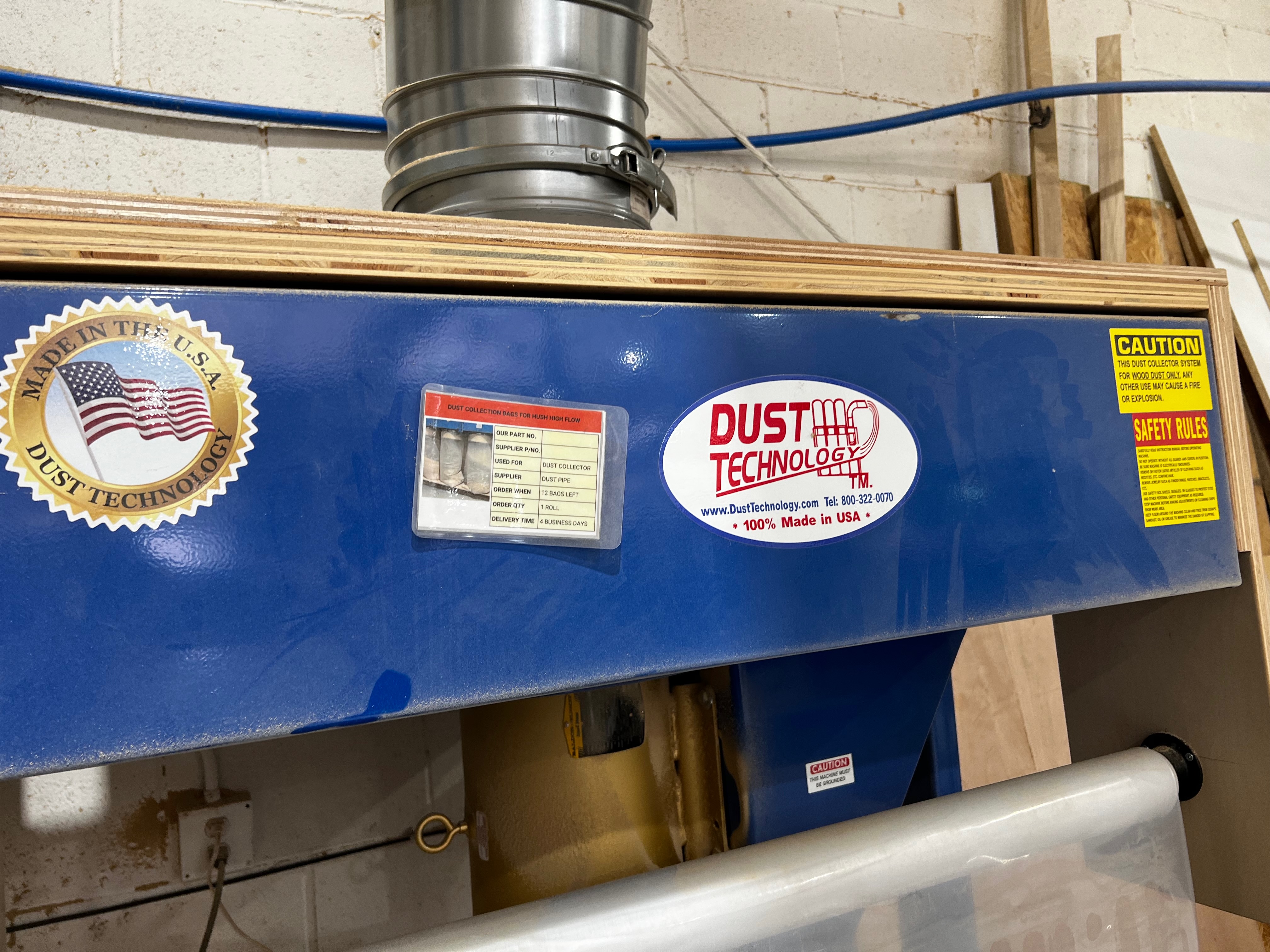 Dust Technology DTHHF-1000 HUSH series high-performance dust collector. Delivers 4,450 CFM at 16 W.G., powered by a 10 HP Baldor motor and controlled by an integrated VFD for remote soft-start. Designed for quiet operation with a noise-reducing impeller and baffled airflow for even bag fill. Excellent for CNC routers, widebelt sanders, edgebanders, and multi-machine setups.