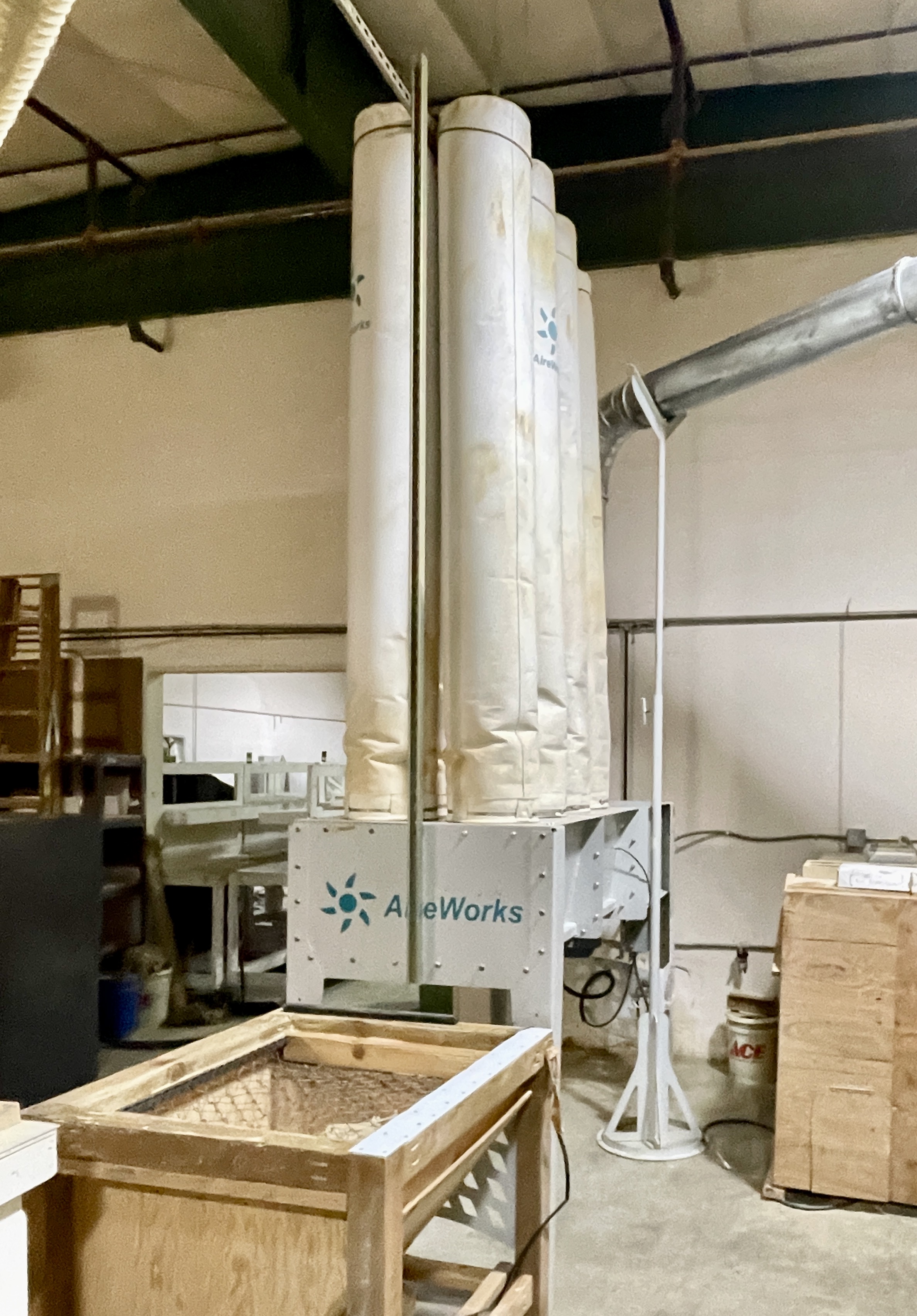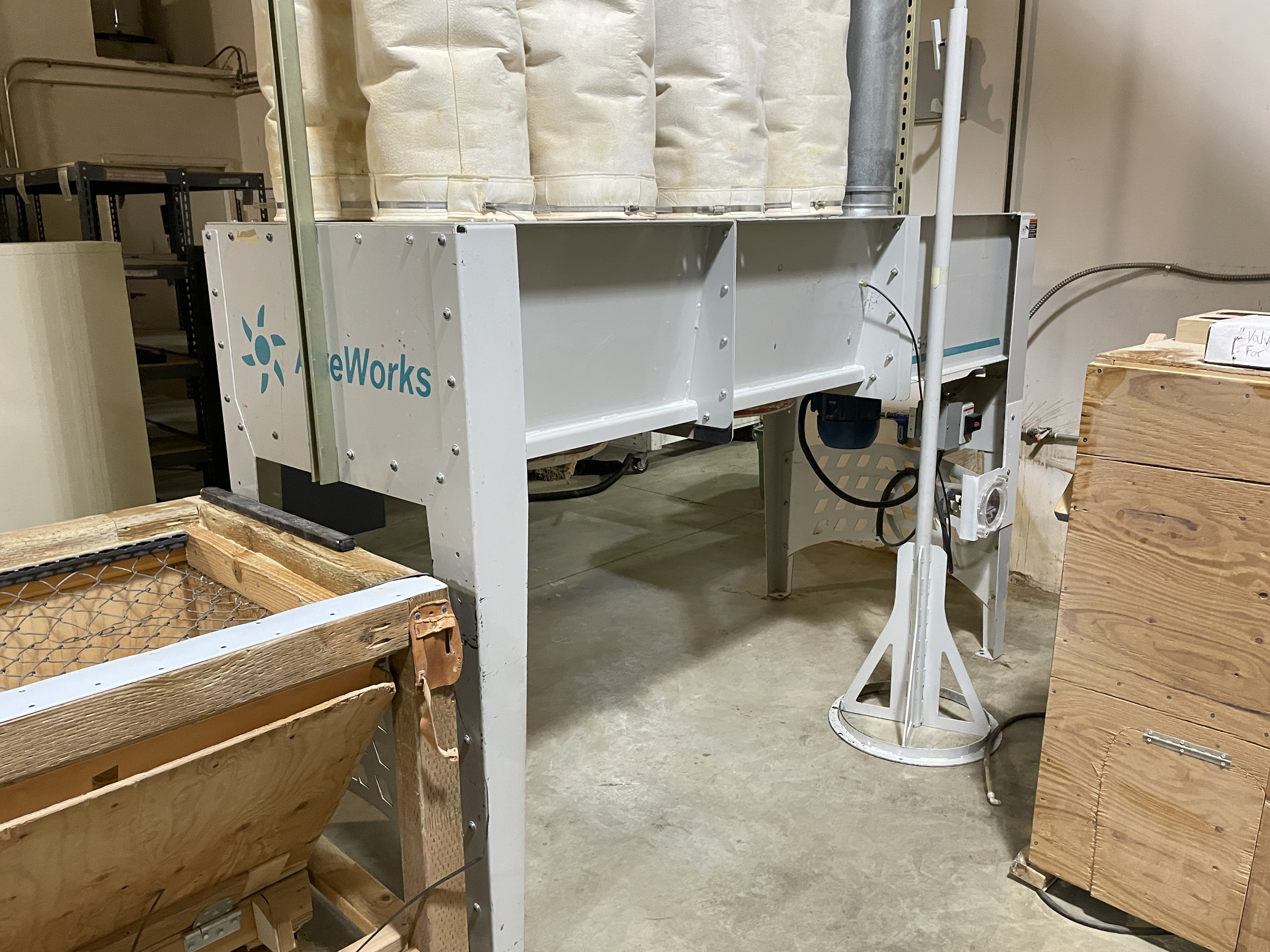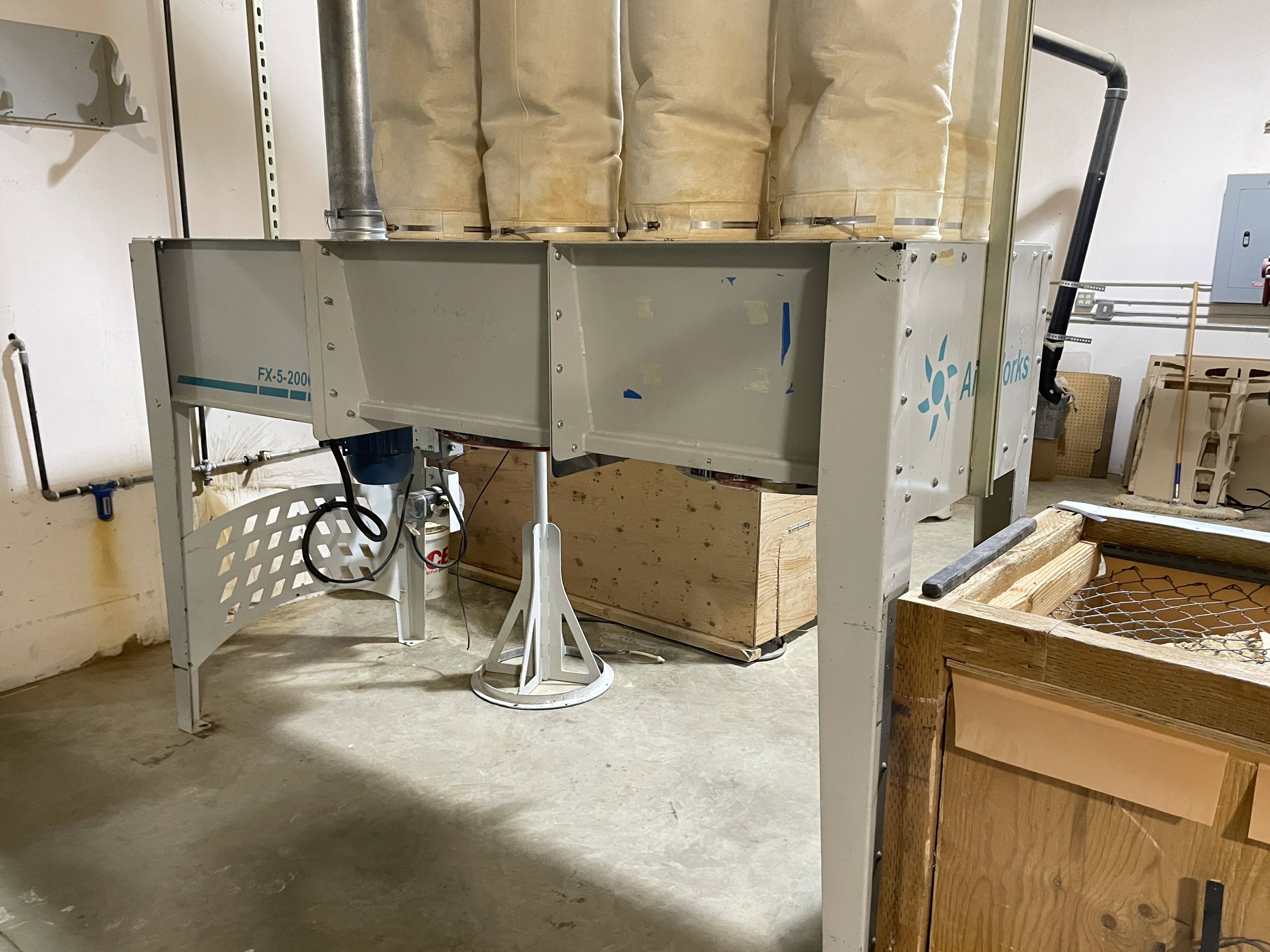 Aireworks FX-5-2000 dust collector. 5HP, 2,000 CFM, with six 12"x 8' High Efficiency filter bags up and (2) plastic dust collection bags. The filter bags have 125 Sq. Ft. of cloth filter area and 16.7:1 air to cloth ratio with 40 Gal. of collection capacity. WEG 5HP TEFC motor with Heavy Duty machined & balanced impeller, 230 / 460 volts three phase. Measures 95"L x 40" W x 13'H. The collector is ready to load.