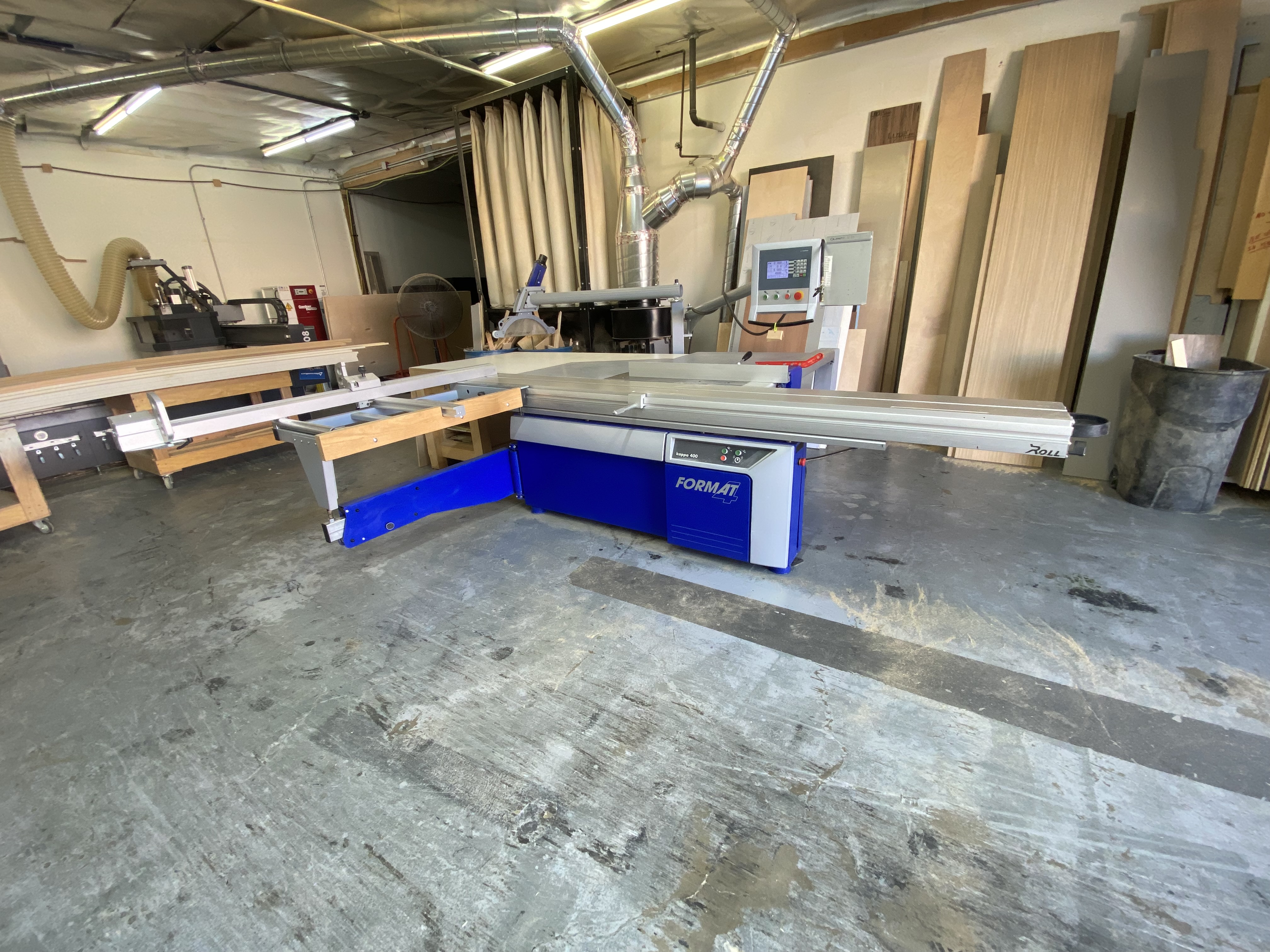 Felder Format-4 Kappa 400 x-motion (2016) Premium European sliding table saw with full electronic height, tilt, and rip-fence control via touchscreen. 3200 mm X-Roll sliding table, 7.5 HP main motor, 1.5 HP scoring, 1250 mm rip capacity, 045° tilt, imperial scales, and crosscut fence with stops. Includes 2-axis scoring unit, Easy-Lock blade system, outrigger table, overhead guard, dado flange, and integrated remote switches. Excellent condition low hours, smooth travel, clean and fully operational. Professionally packed and skidded for pick-up or shipping. Delivery quote available upon request.