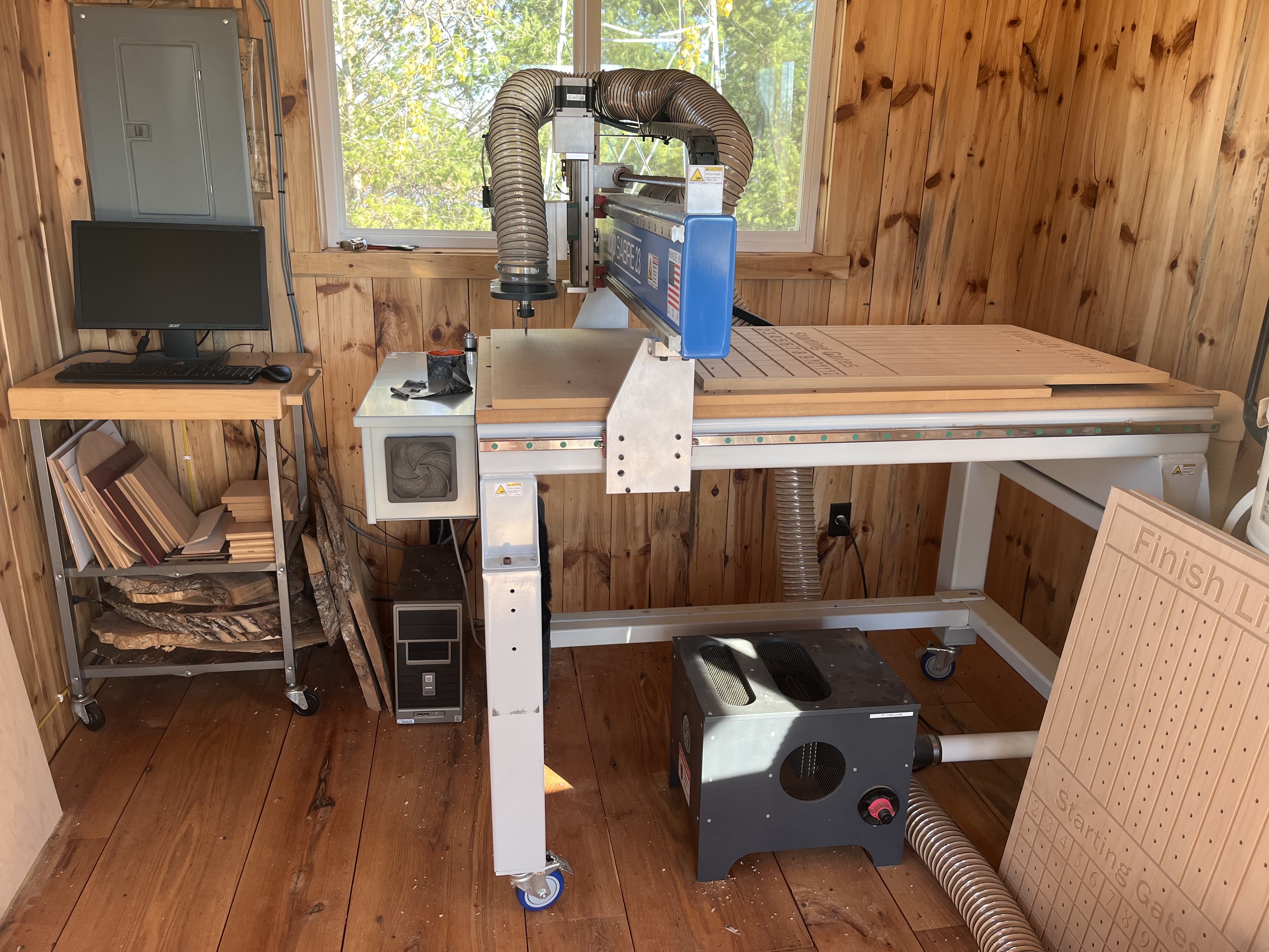 I am selling our shop saber 23 equipped with vacuum hold down. I have attached the original order sheet as well. This machine comes with the tooling on the list as well as other bits from Vortex tooling. The machine only has 40-50 hours on it. It also comes with the computer with VCarve on it to run the machine. Shipping would be an extra cost