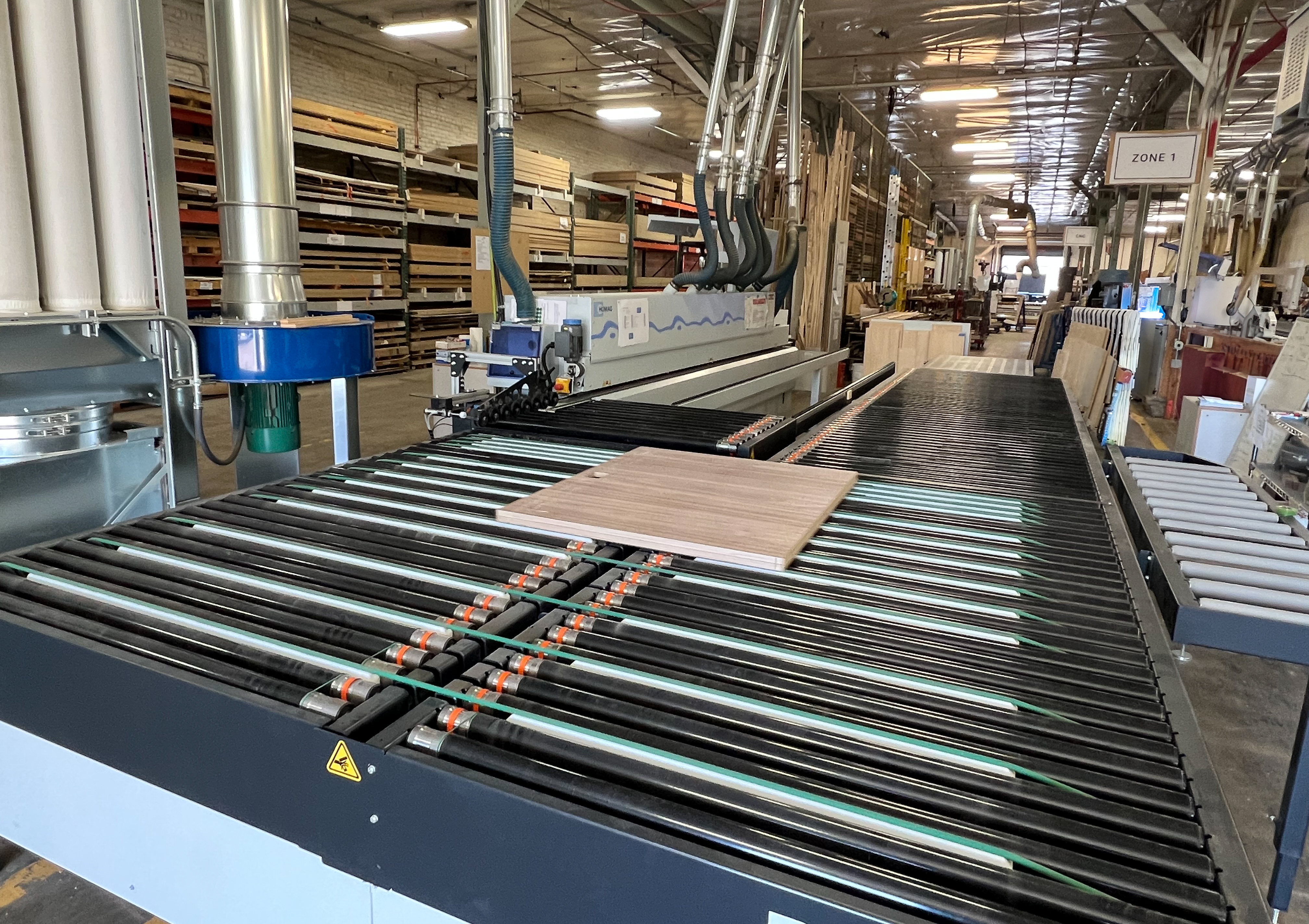 2022 Doucet SRH-48L-31-T left hand return conveyer. Equipped with pneumatic actuated downstroke transfer belts which raise and lower to transfer the receiving panel to the return conveyor rollers. The return conveyor was taken out of service due to the replacement of the edgebander it was ordered for. The return conveyor is in very good condition and has been lightly used.