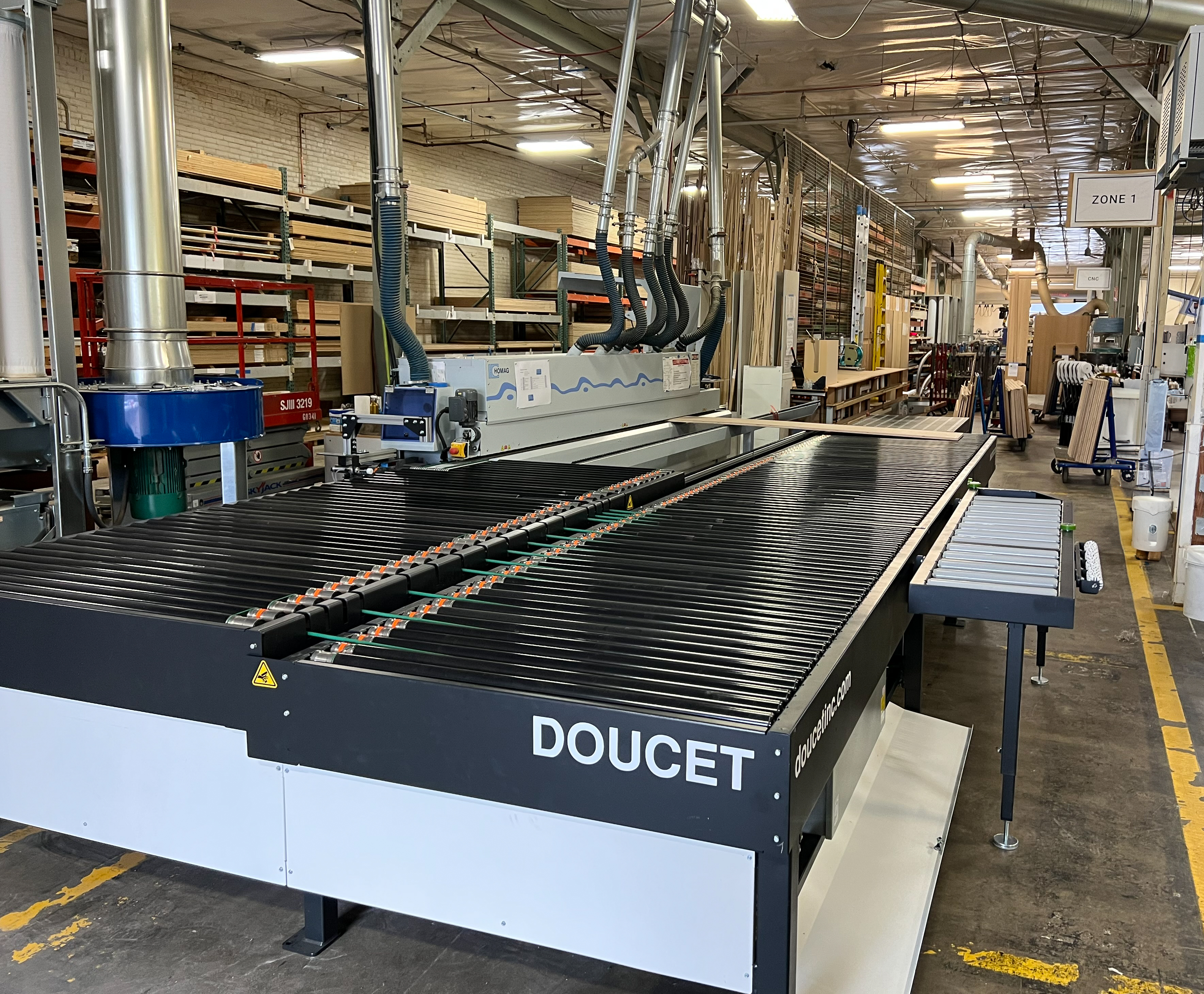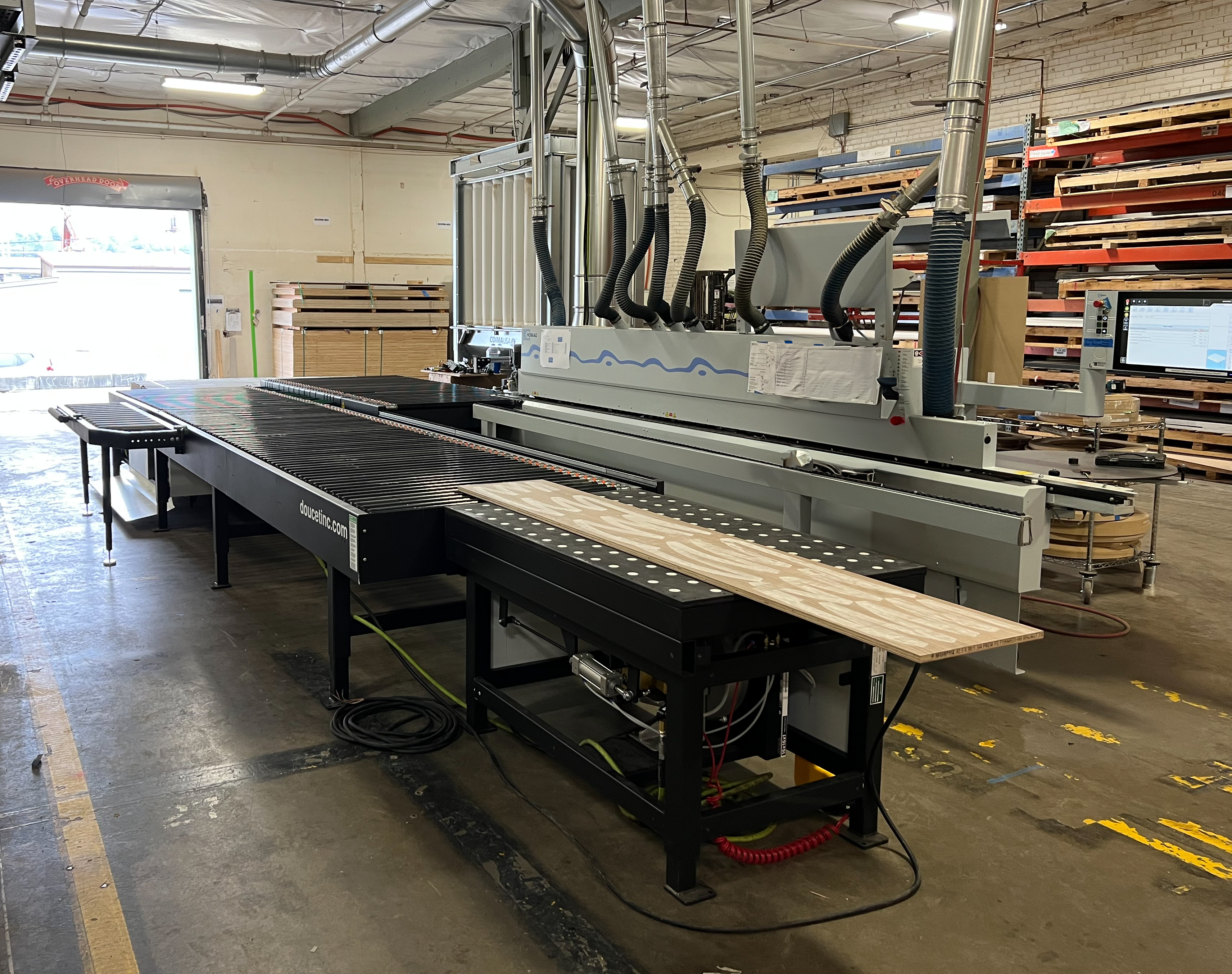 2022 Doucet SRH-48L-31-T left hand return conveyer. Equipped with pneumatic actuated downstroke transfer belts which raise and lower to transfer the receiving panel to the return conveyor rollers. The return conveyor was taken out of service due to the replacement of the edgebander it was ordered for. The return conveyor is in very good condition and has been lightly used.
