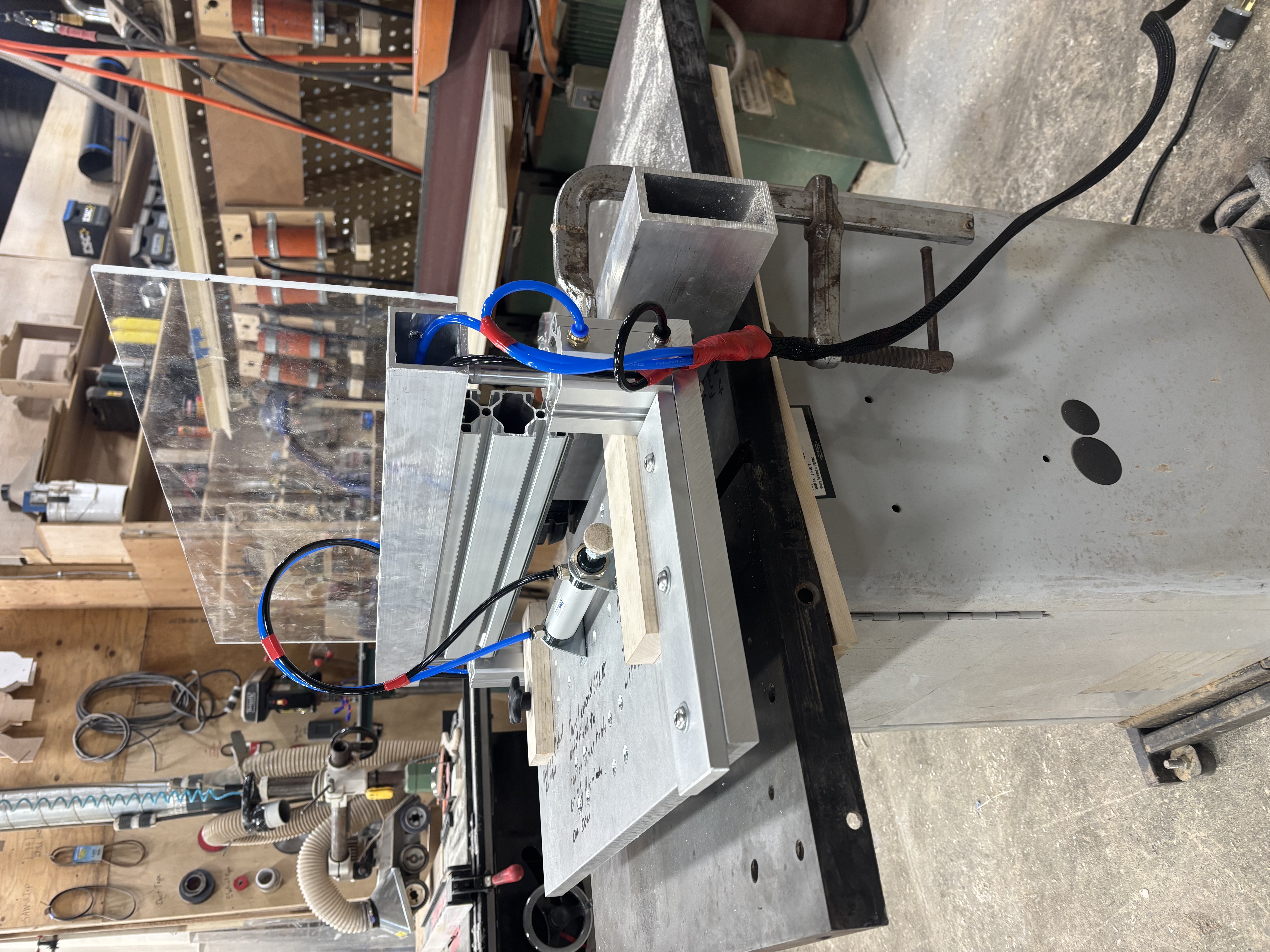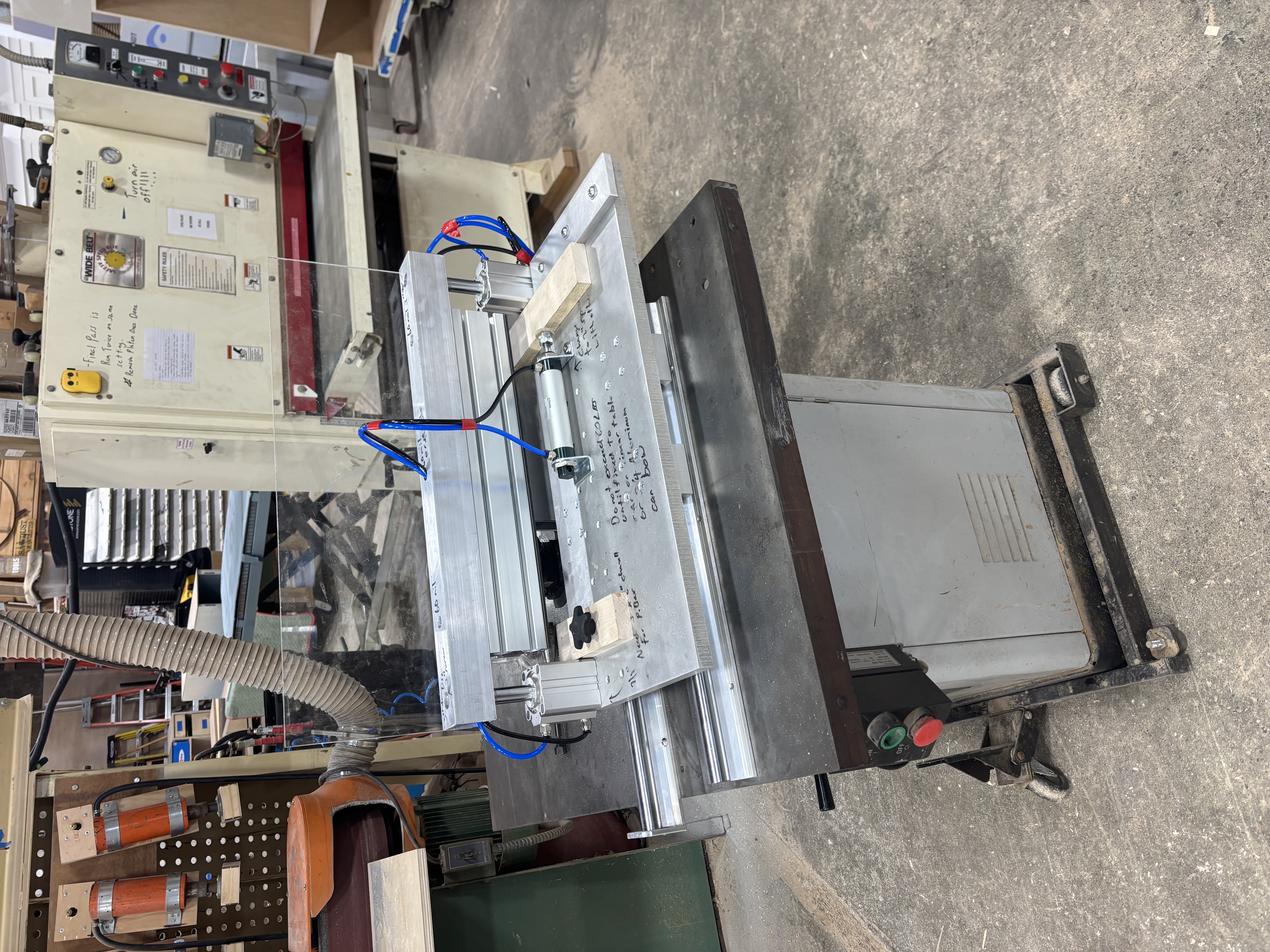 -Pressure bar with removable aluminum extrusion foot so jigs and fixtures can easily be attached for special applications. 2.25'' standard clamping capacity. Rubber pad on shoe to firmly hold parts. Shoe can easily be adjusted to allow for thicker material of over 5'' in under 5 minutes. Custom clamp heights and width at your request! We specialize in making new tables for old and new machines. Send us your specs or give us a call and we can build the ultimate sliding table just for you.