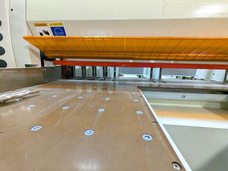 High Speed rack & pinion saw carriage; brushless A/C motor (saw carriage speeds: 0 - 446 FPM); pusher speeds: 0 - 330 FPM; automatic side aligner ensures tight cut tolerances: 2.8" - 48" aligning zone); variable: 0 - 3,900 RPM; 19-1/2" wide rear phenolic table for crosscutting narrow strips; (1) 2' x 8' fixed front load air table; (2) 2' x 5' movable front load air tables.