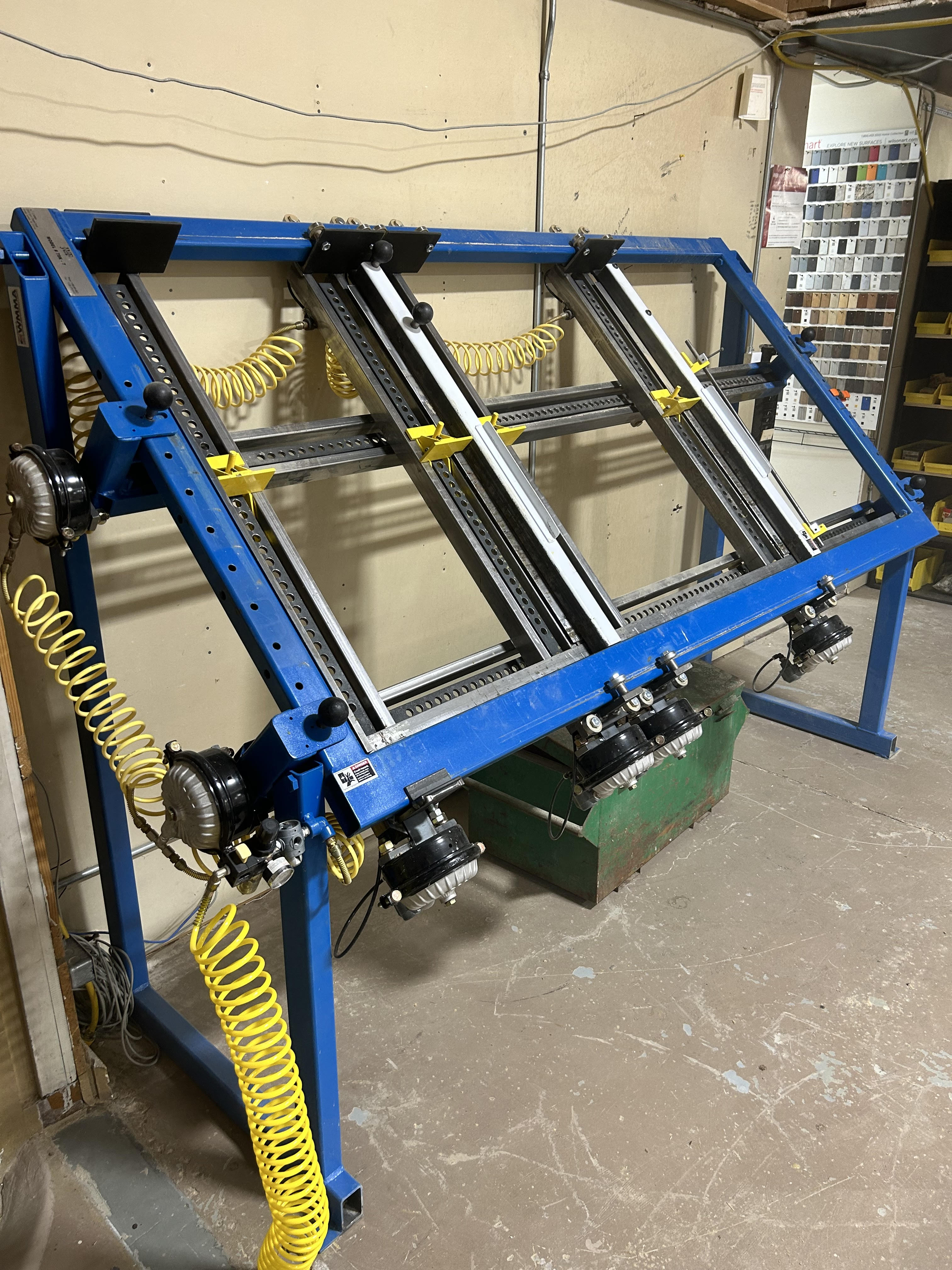 Squares and clamps a door or panel with pneumatic pressure