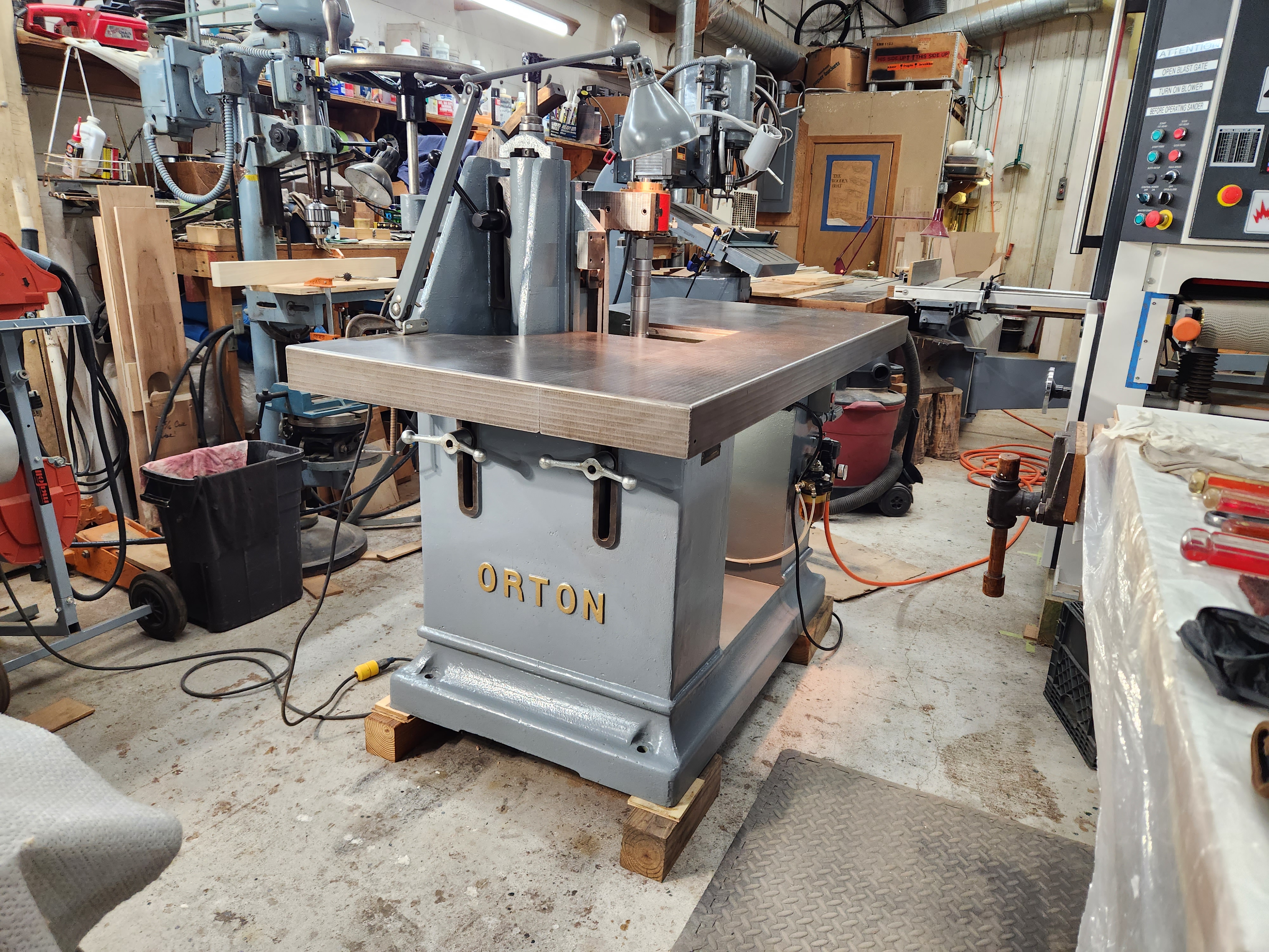 Orton Type "F" Ship Shaper/Router,40' x 60" Table Size, 7-1/2 hp, 230 Volts, 3 Phase, Oil Mist Lubrication. Excellent Condition. Machine has been Completely Rebuilt. Can be used as a Shaper or Router. Comes with a Mandrel with Top Bearing Attachment so Machine can be used as a Tilting Spindle Shaper. Can also be used as a Tilting Spindle Router with Collet Chuck Attachment with 1" HSS Spiral Cutter and Template Guide. Heavy duty Spindle with Brown and Sharpe #11 Tapered Socket in Spindle. Spindle was Indicated within 001". Spindle Tilts 30 degrees forward and 45 degrees backward. Great for Cutting Changing Bevels into Wood and Aluminum. This Shaper/Router has been operated in a One Man Shop who is now beginning to retire. This Machine is also highly used in the Maritime and Aerospace Industry. More Photos Available. Approx. weight 3000lbs. Awesome Machine!