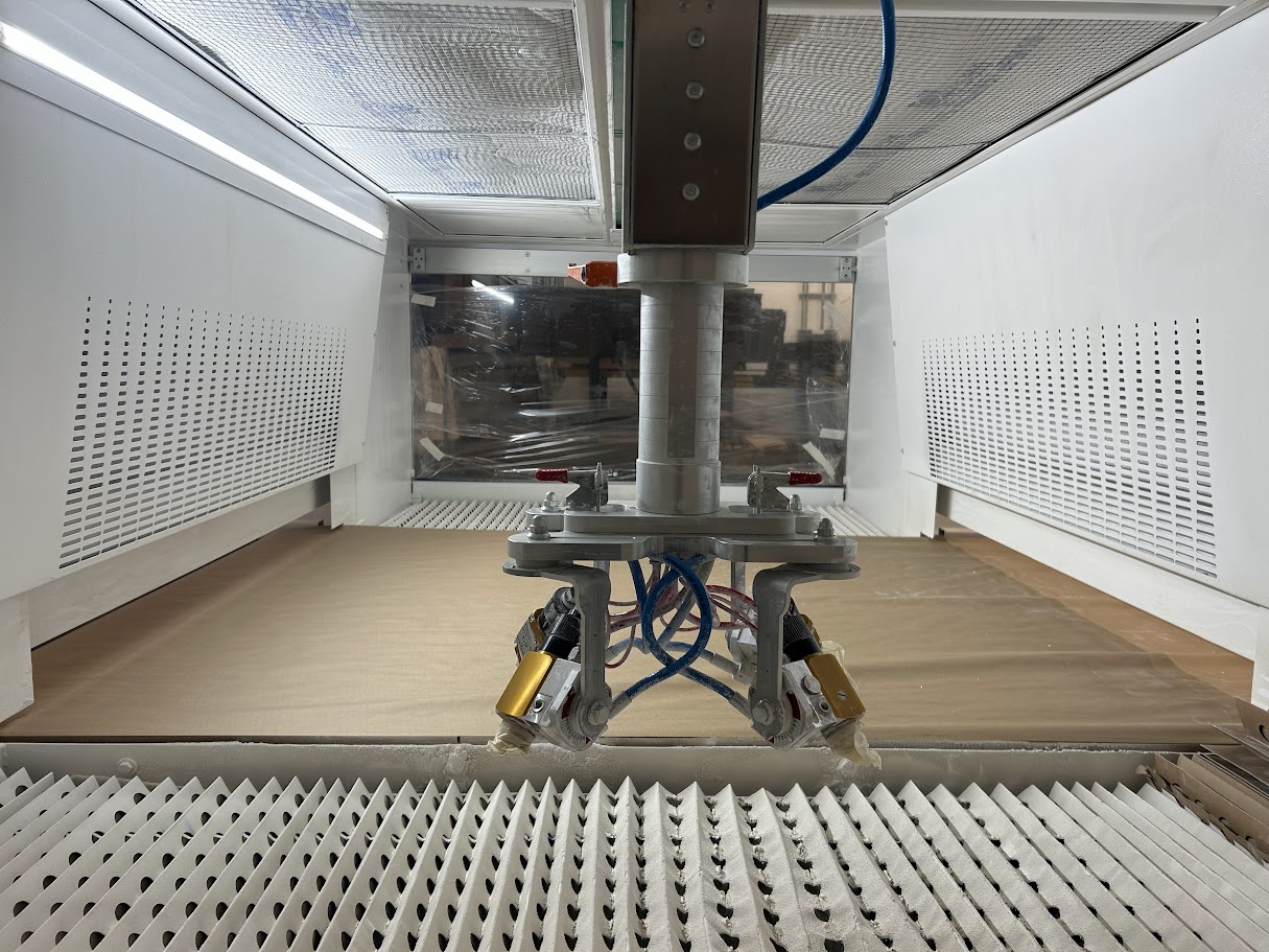 Dual Filtered Air and Frequency driven fans, keep pressurized spray cabin consistant for better uniformity in coating application.