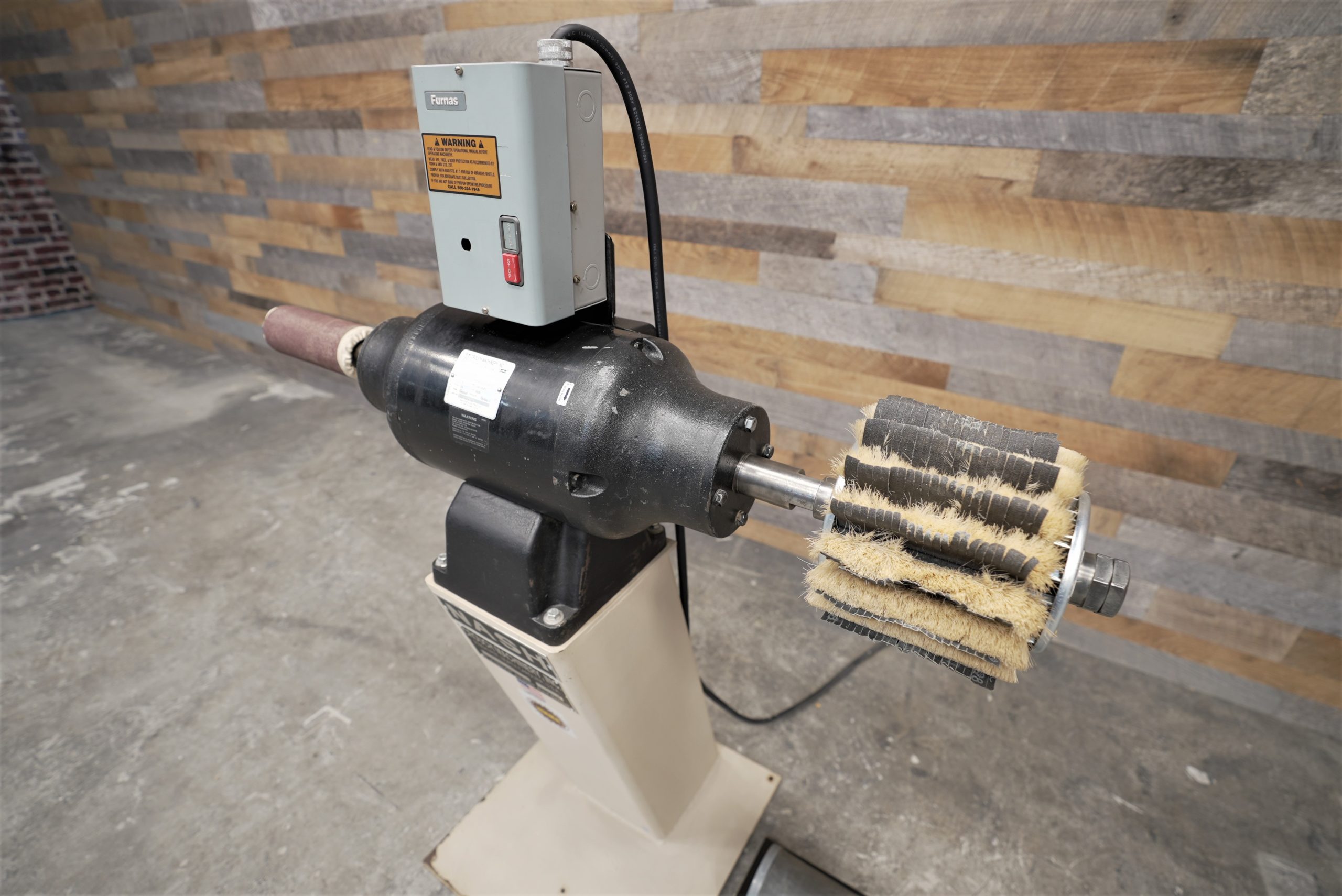 This Nash 180 double 9″ arbor sander comes with both balloon and flap wheel heads. It’s powered by a 3 HP, 208-230/460V, 3 phase motor with a top mounted start/stop switch. An extra 6″ balloon head is included, but it needs a new bladder. The balloon head mounted on the machine is 3″.