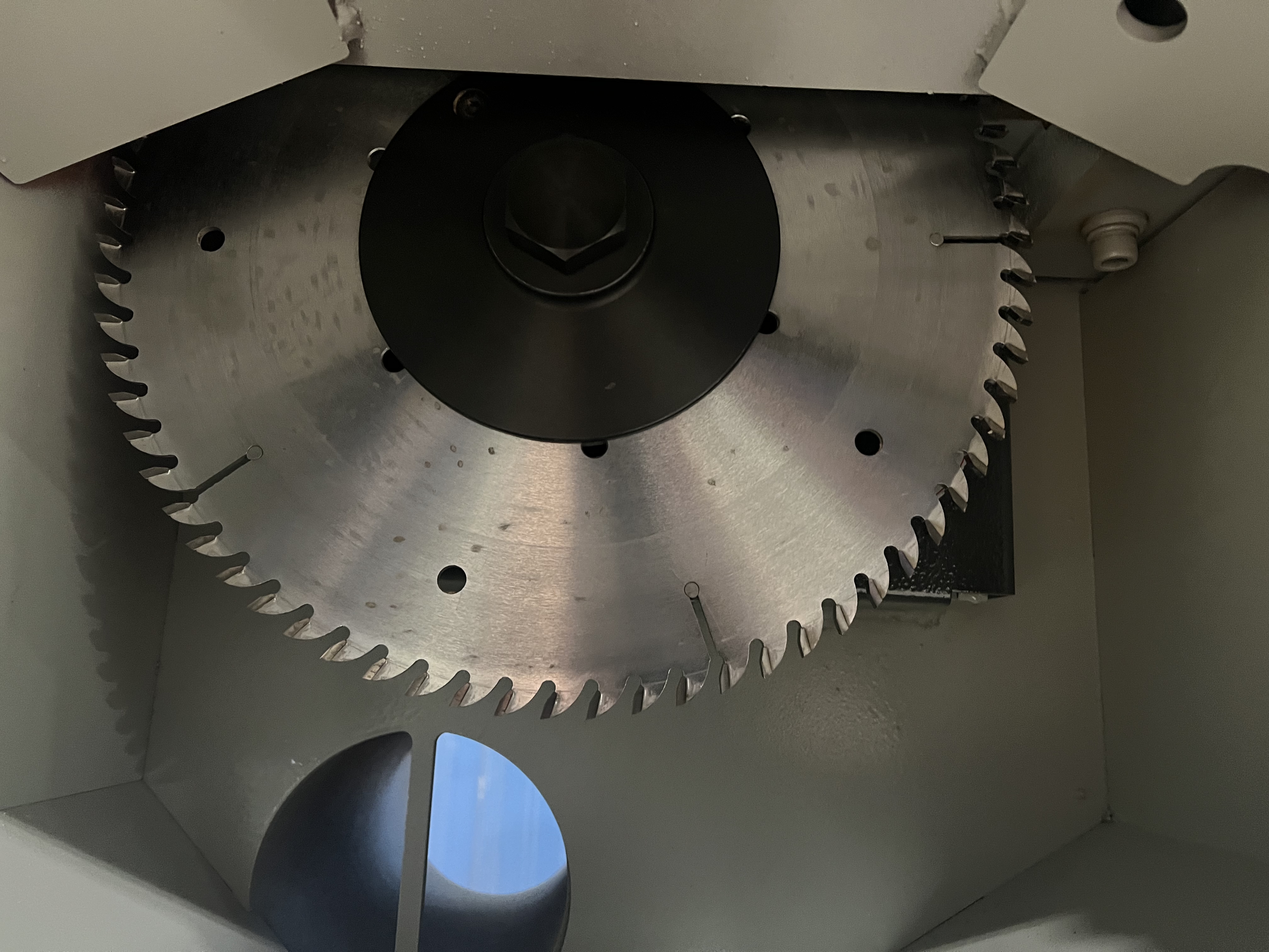 Safety interlock on blade access door preventing operator entry while blade is spinning