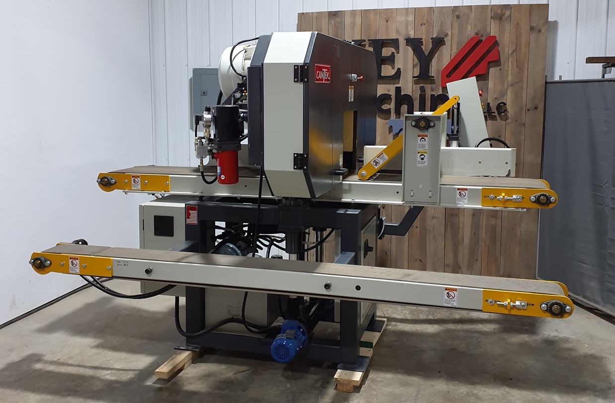This used Cantek HR400PB horizontal band resaw was purchased new in 2023 and is in like new cond. The Cantek HR400PB Horizontal Band Resaw is a heavy-duty resaw with a robust machine design capable of resawing large timbers with precise results. With its powerful 30HP variable speed saw motor and variable speed hydraulic feed system the HR400PB can be optimized for any job. Equipped with a large cutting capacity up to 15 ¾” wide and up to 9.8” thick. The saw assembly is raised and lowered electronically using a digital input controller for precise thickness setting. All controls are conveniently located next to the infeed conveyor for operator convenience.