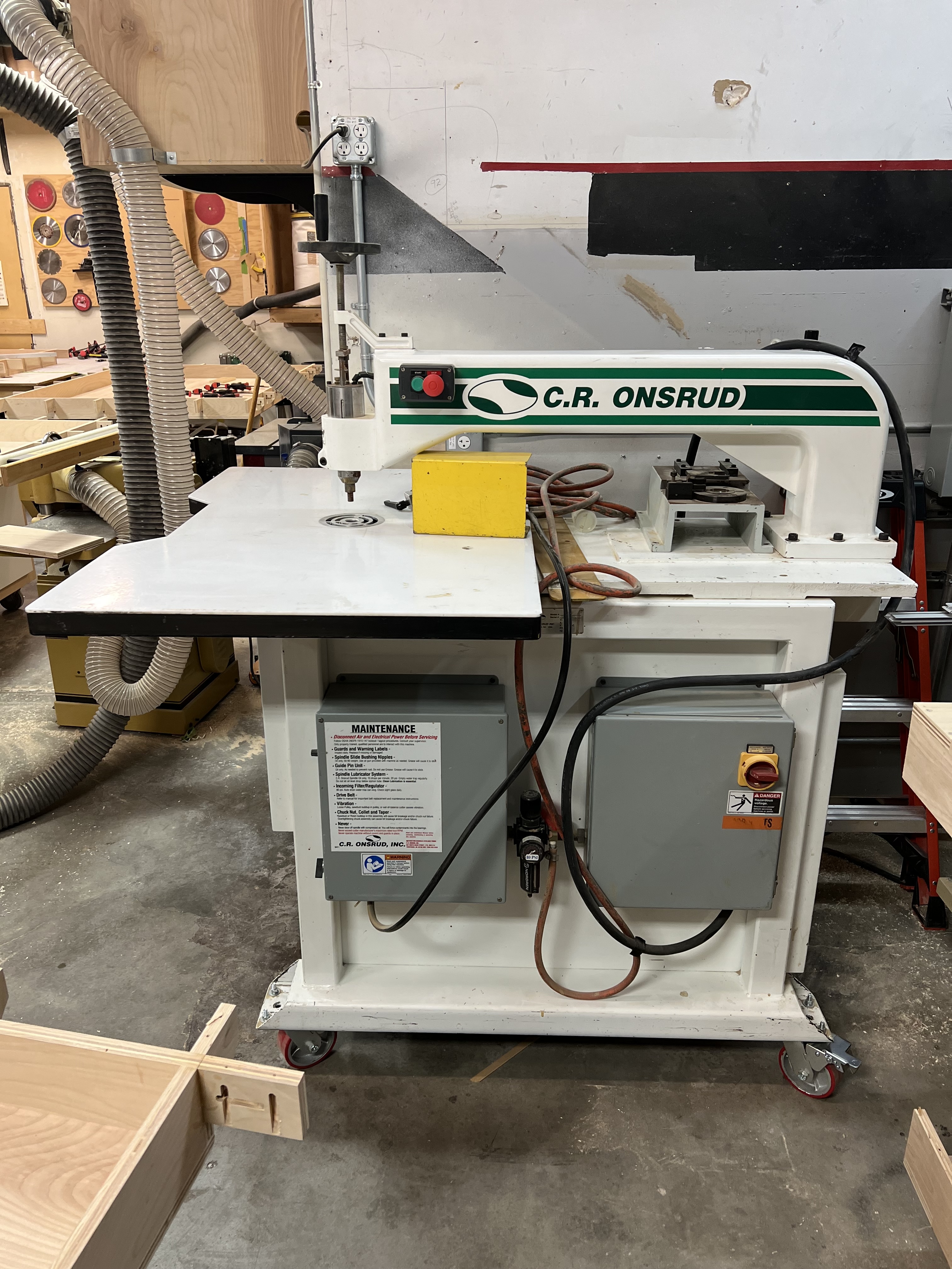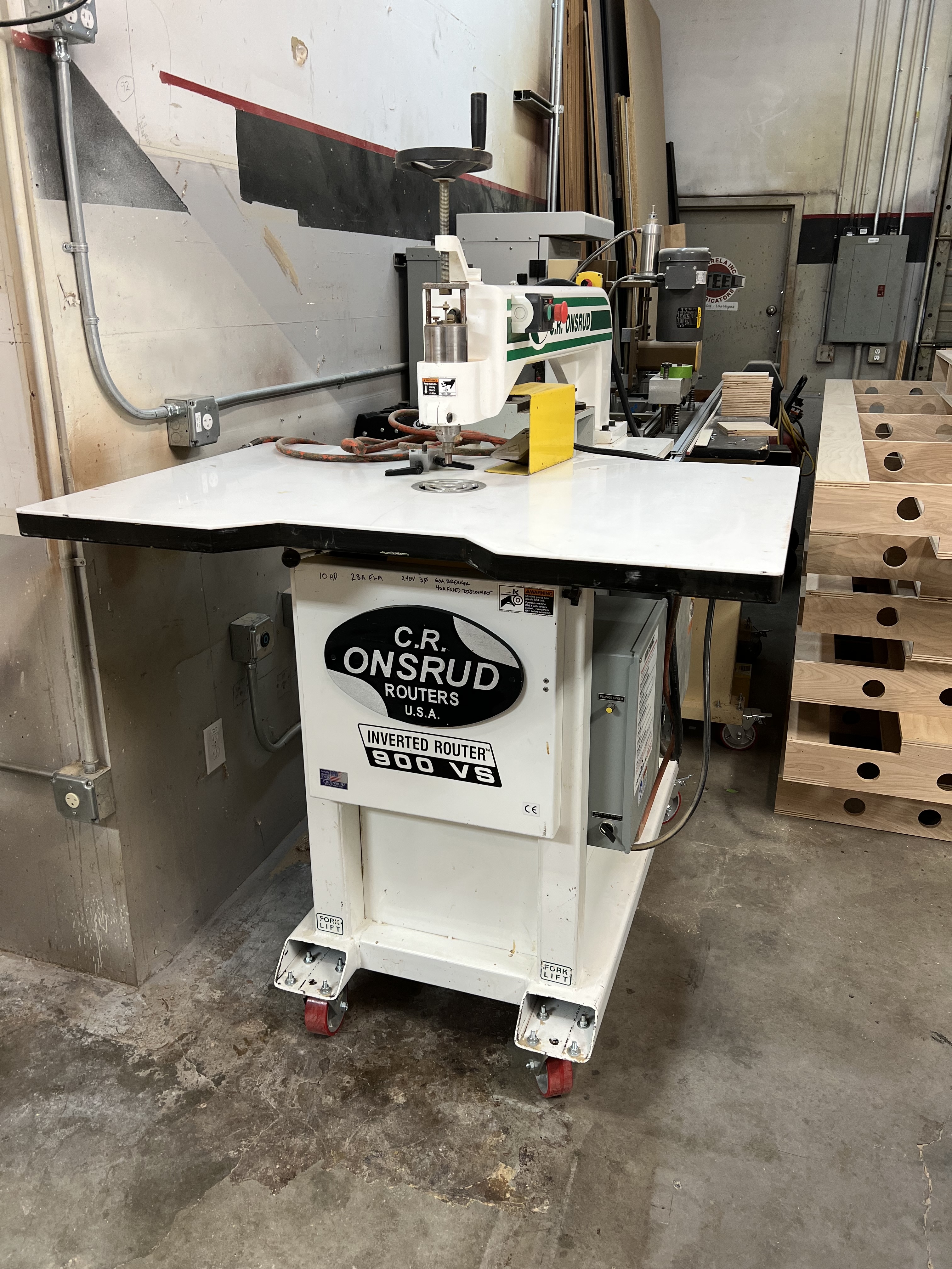 The C.R. Onsrud 900 VS Inverted Router is a robust, industrial-grade machine engineered for continuous, heavy-duty production across up to three shifts per day. Its inverted design enhances precision and safety by positioning the router spindle beneath the worktable, allowing for improved visibility and control during operations. This router is adept at plunge routing and profiling both internal and external cuts in materials such as hardwoods, softwoods, engineered woods, non-ferrous metals, aluminum, and various plastics and composites.