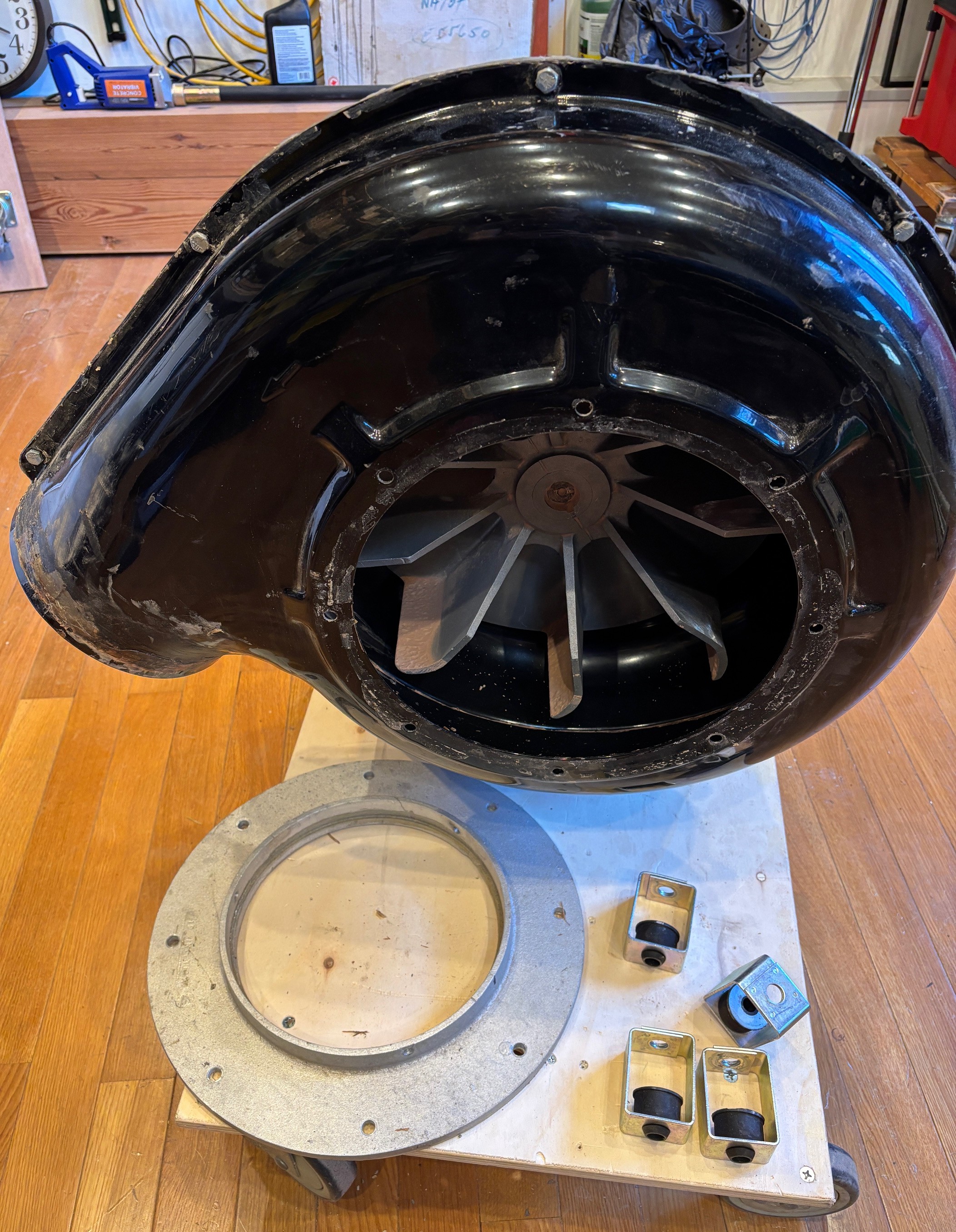 Similar to Cincinnati Fan PB 15 15.5" x 5" backward curved impellor. 8" diameter exhaust. Intake is 12" diameter. Internal diameter of aluminum ring is 10". It is from another blower- holes don't line up with the steel shroud but it would be easy to drills holes that match. Also includes vibration reducing hangers. I ran the blower on top of a clearvue cyclone. It provided excellent dust collection for misc woodworking equipment (wide belt, 12" table saw, panel saw, etc) with an 8" main trunk and 6" drops (one blast gate open at a time).