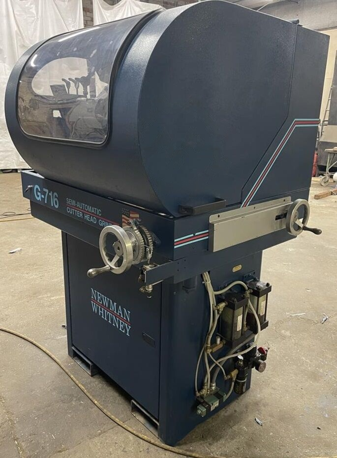 The G-716 Semi-automatic Cutterhead Grinder is used to sharpen 178mm to 406mm diameter eased edge, milled to pattern, and fingerjoint cutterheads. Worktable traversing is automatic and has adjustable stops. Cutterhead indexing is manual. Each knife is held against a positive stop while being ground !!!