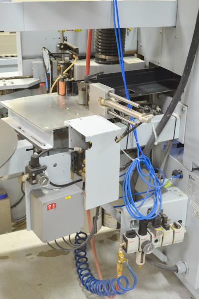 End trim, flush/bevel/radius trim & corner rounding stations have HF motors with electronic brakes; feed chain track speed 42 FPM, 2 HP feed drive.