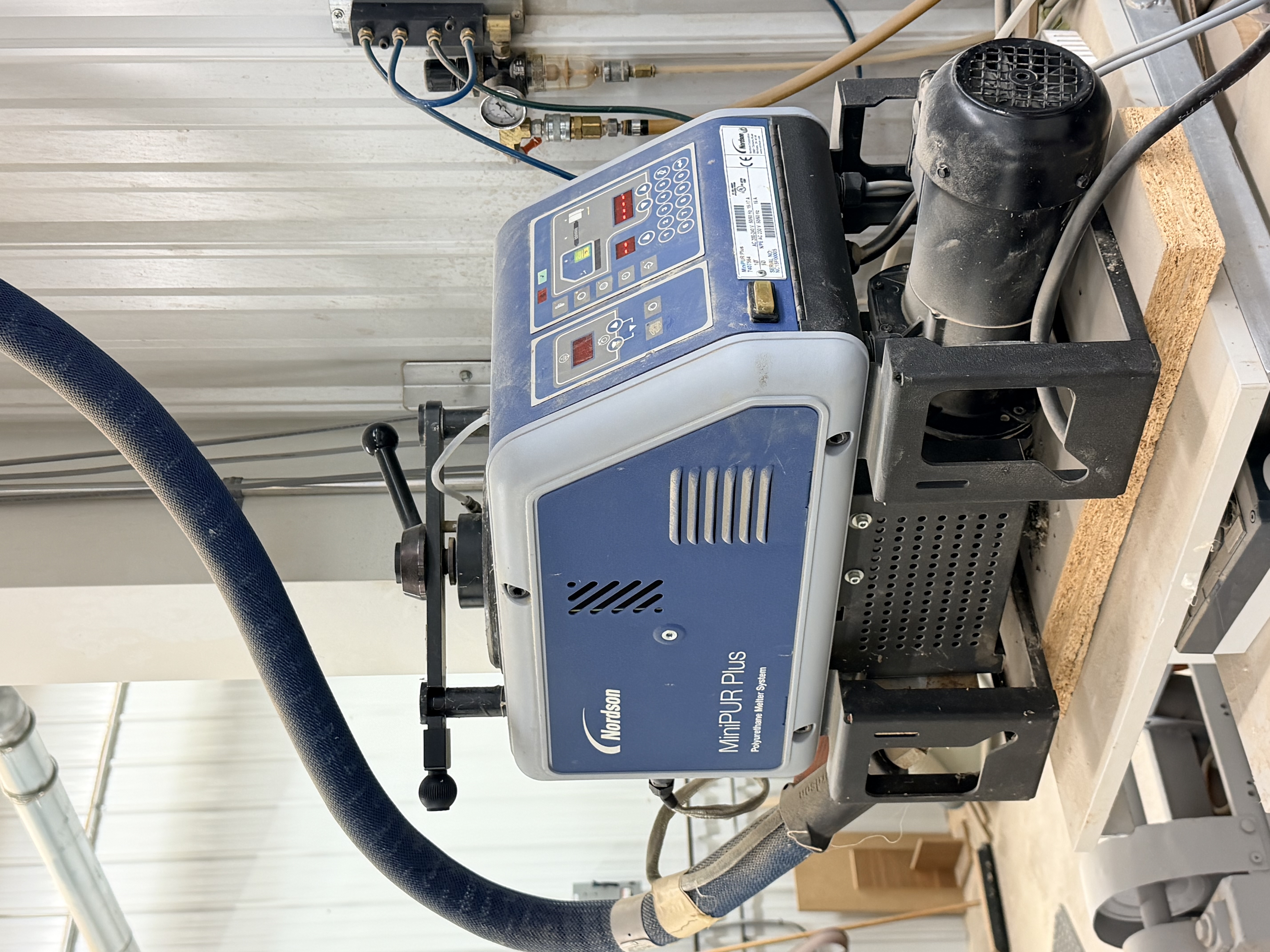 Machinery is equipped with Nordson miniPUR Plus system designed for precision application of PUR (polyurethane reactive) hot melt adhesives.