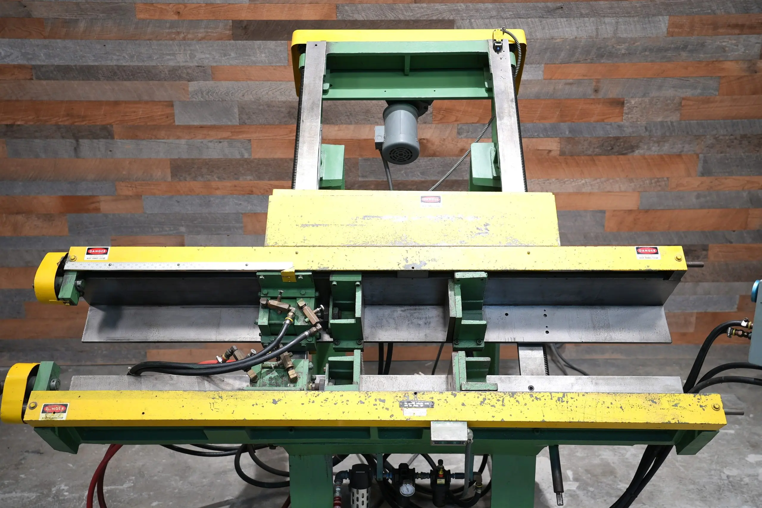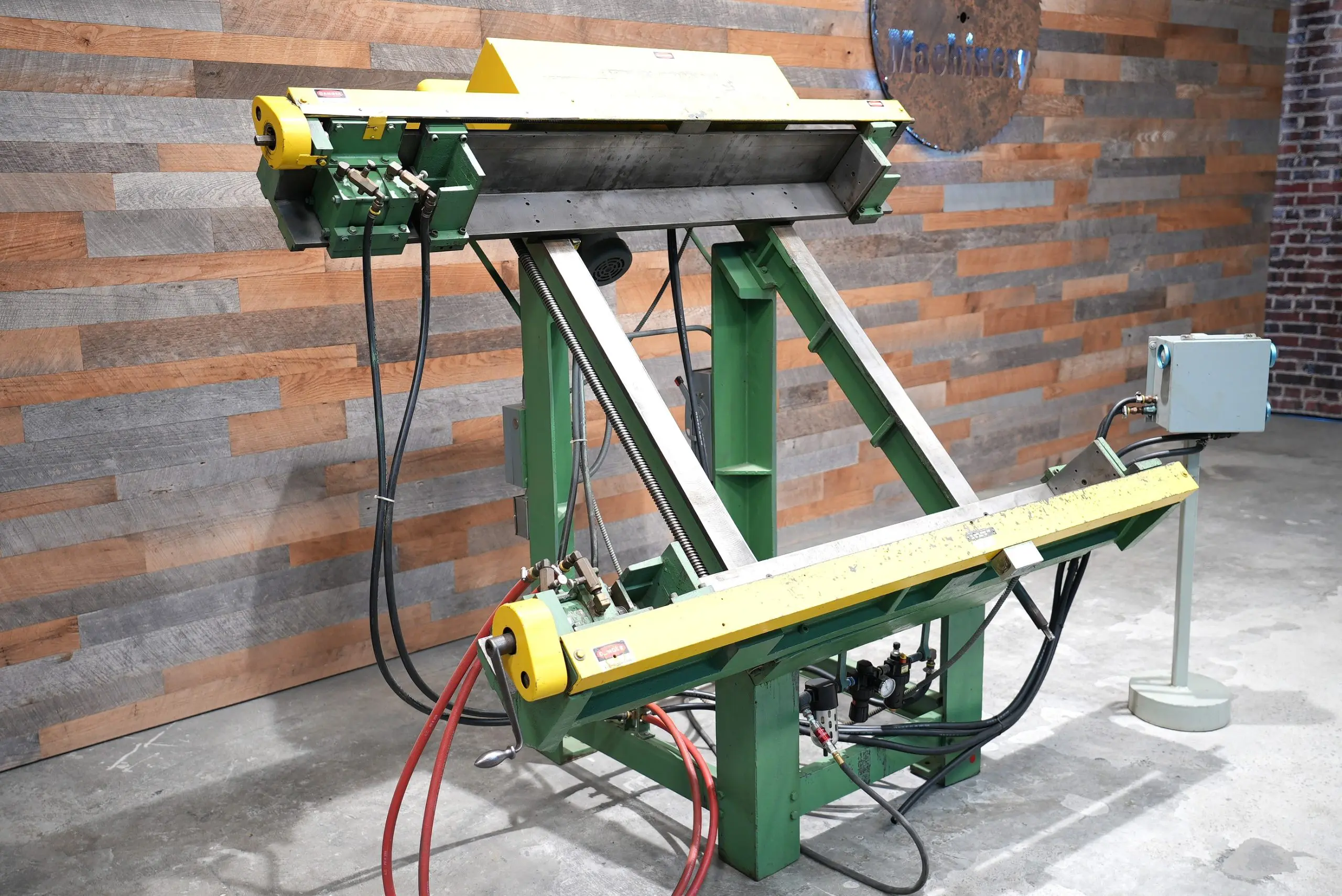 This Lancaster 1861-B Two Way Frame Clamping Machine features a 52″ tall X 56″ wide X a generous 8″ deep. (minimum 15″ tall X 11″ Wide) It’s hard to find clamps that are this deep. The horizontal adjustment is motorized by a quit running 1/2 hp 208-220/440V/3_phase motor. While horizonal clamps are hand driven at both ends. Meaning they both move at the same time so adjustment time is halved. This clamp has a 30 degree working angle. Pedestal with double palms and speed controls for clamping. Overall nice condition for a Lancaster. Was refurbished and beds were re-ground at some point in it’s life.
