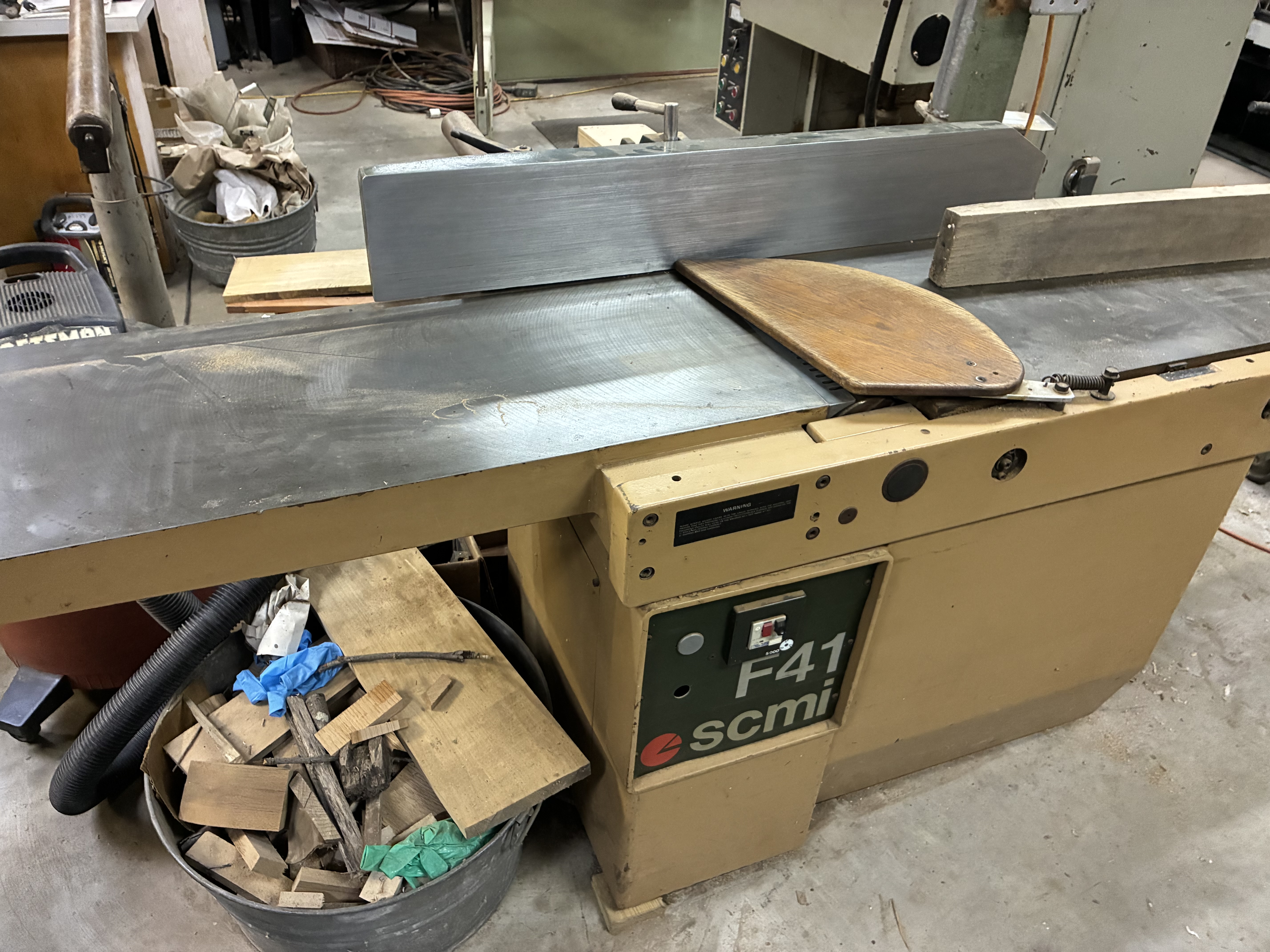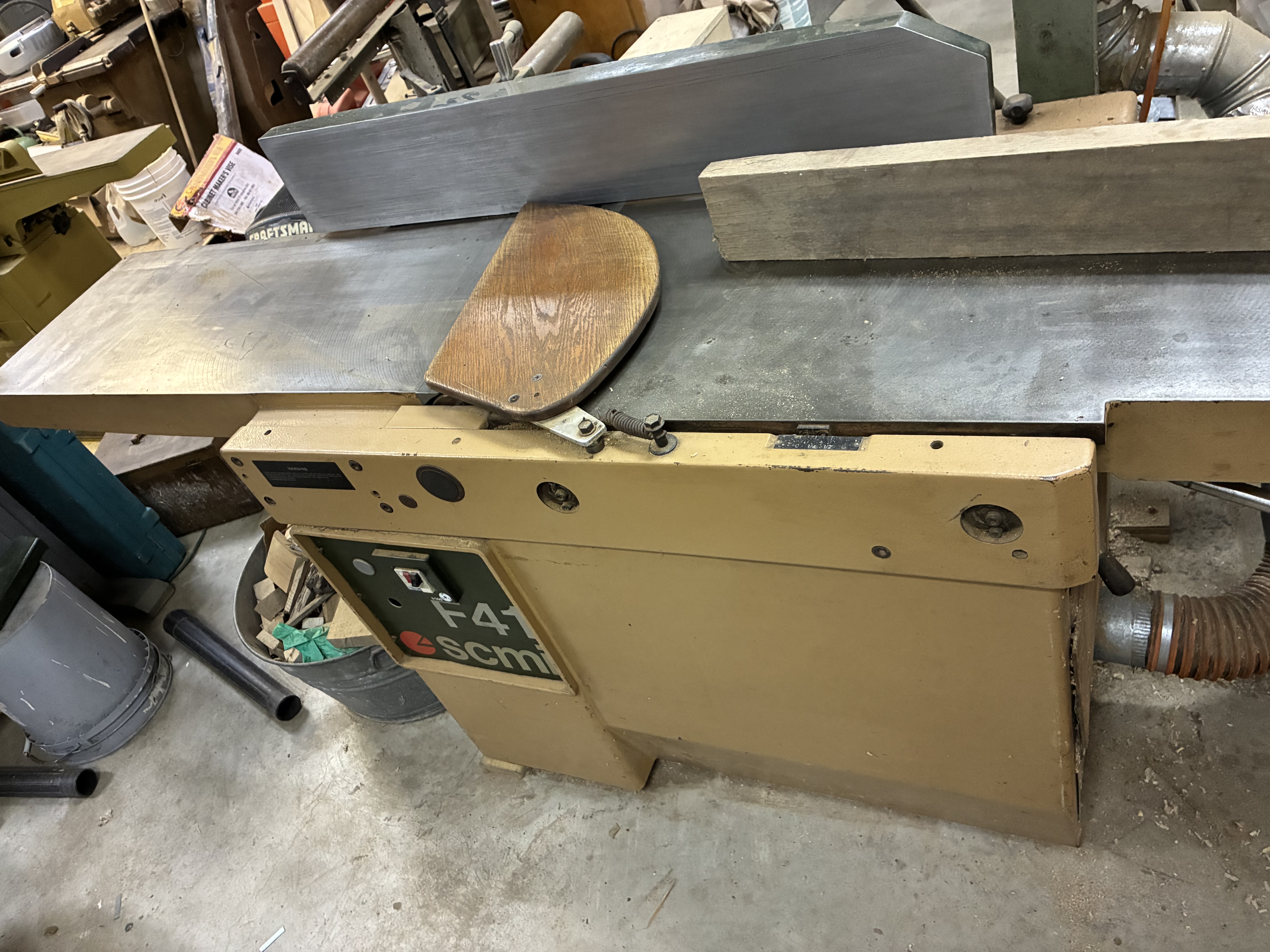SCMI 16" Jointer in very good condition. It's a 4 knife cutterhead and it's set up correctly and runs beautifully. It has a dust collection port on the end that works well. Tilting fence. Come prepared to move and I have a pallet jack and forklift to load.