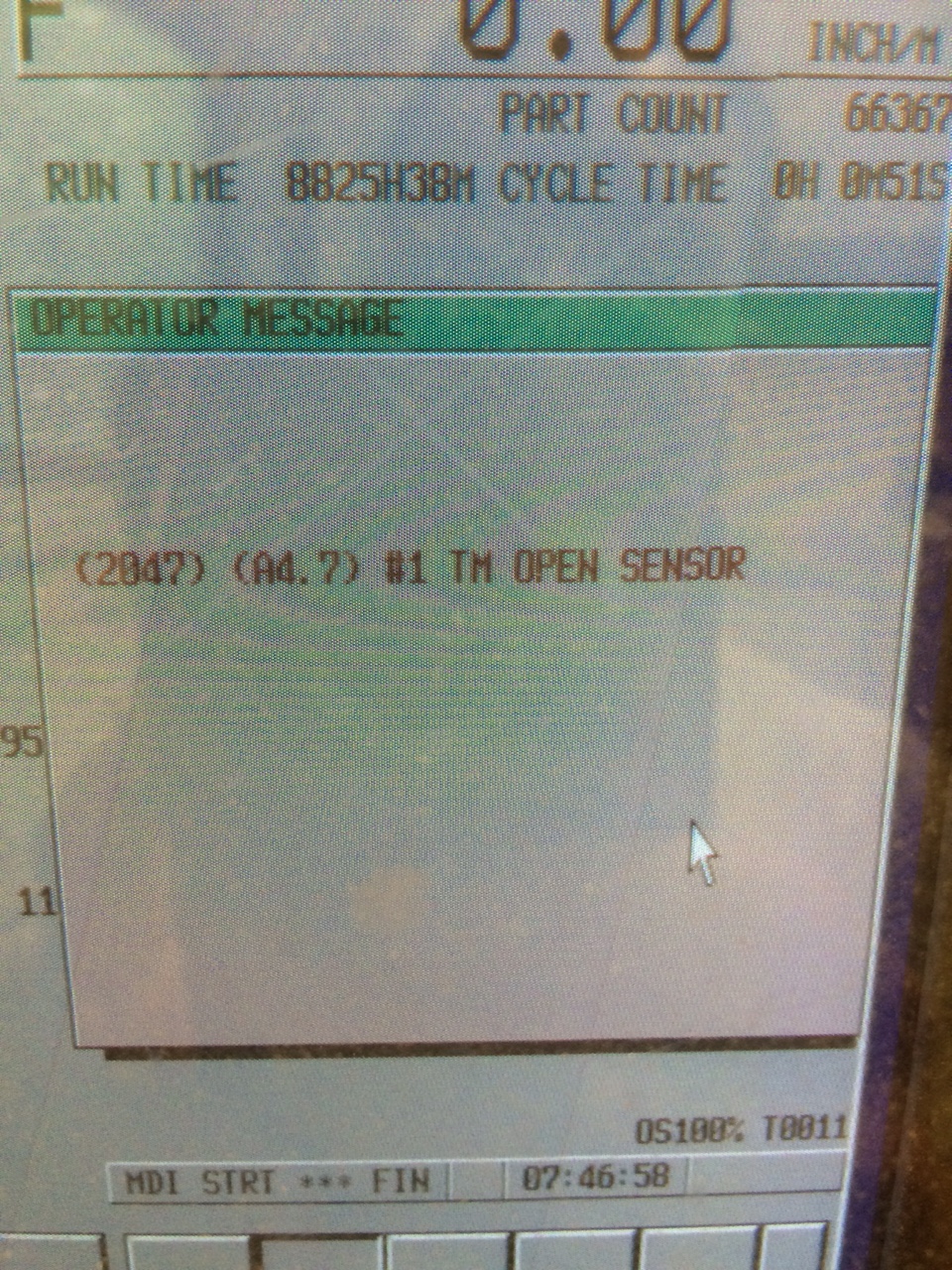 I have an Anderson SUP/Stratos with what appears to be a tool magazine/carousel problem. I think the problem is that there is some debris caught in the mechanism that rotates the carousel but im not sure. I'll attach a picture of the alarm displayed. The alarm says (2047) (A4.7) #1 TM OPEN SENSOR. Any help is greatly appreciated!