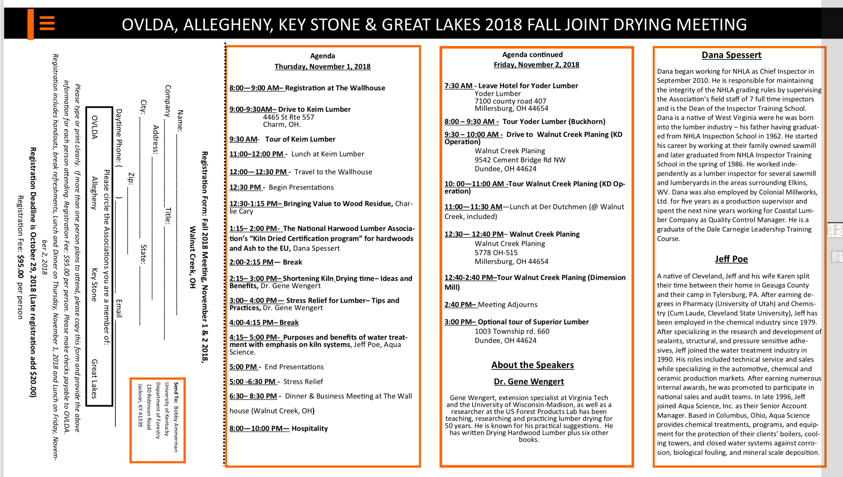 The Ohio Lumber Drying Association (DA), the Keystone Kiln DA, the Allegheny DA, and the Midwest DA will hold a combined meeting with tours and technical presentations at Walnut Creek, Ohio. I can send you a brochure about the meeting...send me a personal email.