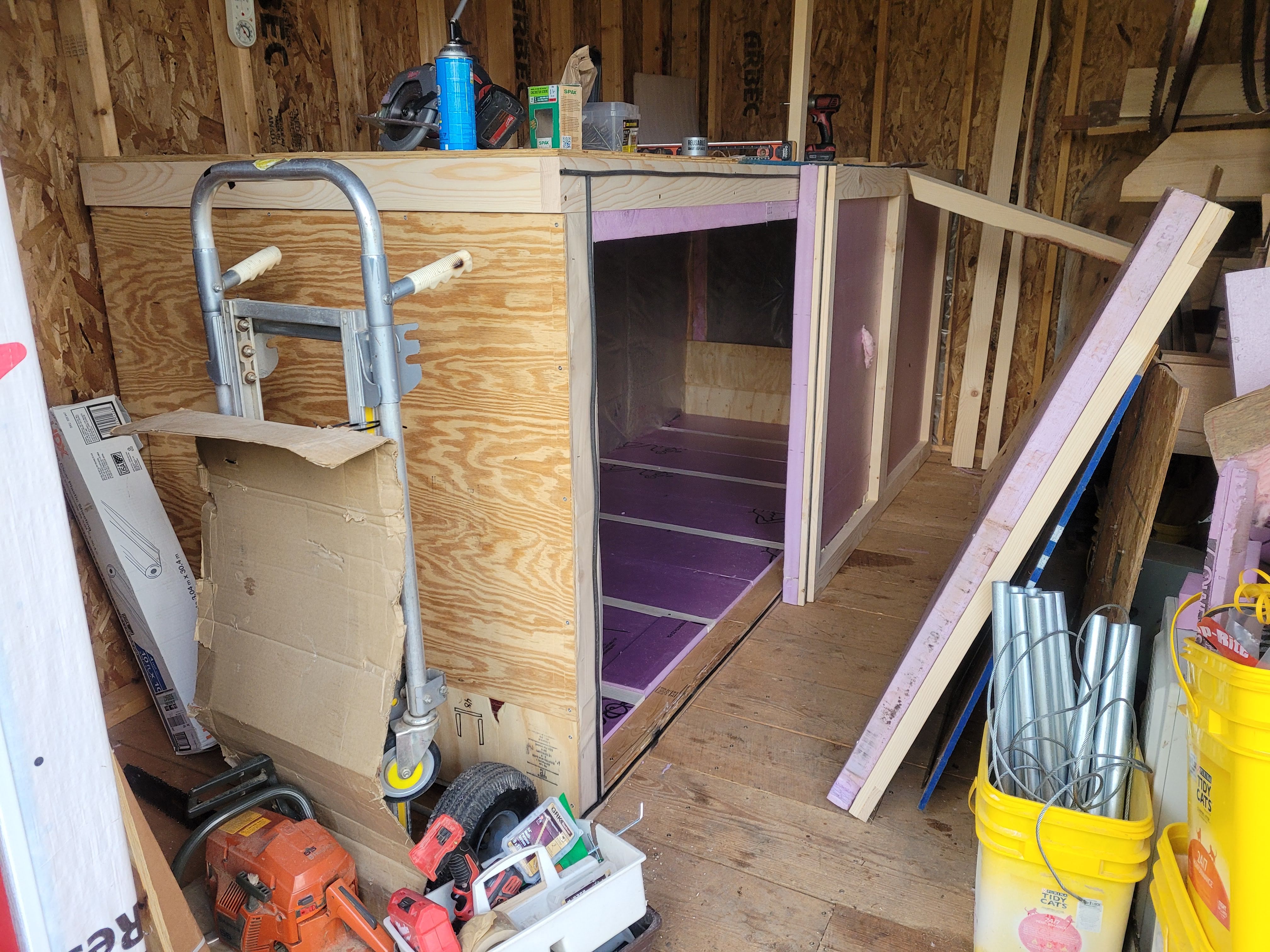 I built an electric kiln in my wood storage shed. I use it to KD wood that I first AD to below 20%. I can also bring the load up to 140F after it's dry should I need to kill any bugs, though I have rarely needed to do so. All that's needed is a fan or blower to recirculate the air and an oil filled room radiator if the box is insulated well enough. The photo shows the kiln. It's 4 feet high x 4 ft deep and 10 feet long. It holds about 400 bf of stickered wood with enough space at the front and back for the 600 cfm blower to circulate air through the stack. The door and floor is just 2" thick foam. The walls and ceiling have 3-1/2" fiberglass with a vapor barrier over it, then 2" of foam insulation over that.