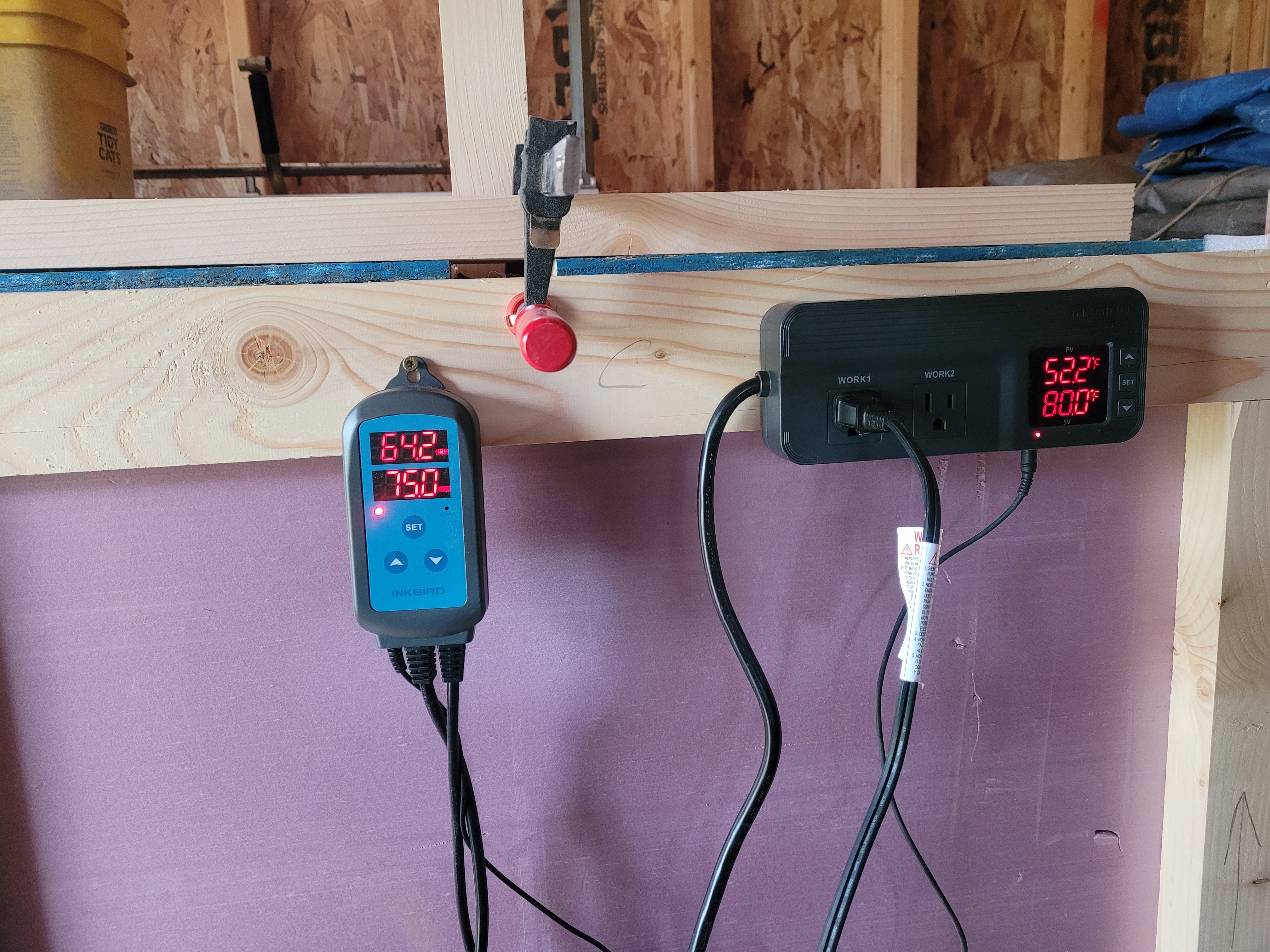 Another photo shows the RH and temperature controllers. Inkbird brand from Amazon. The RH controller is just there now so I know what the RH is inside so I can decide how to adjust the vents. The oil filled radiator is plugged into the temperature controller and controlled from the outside by it.