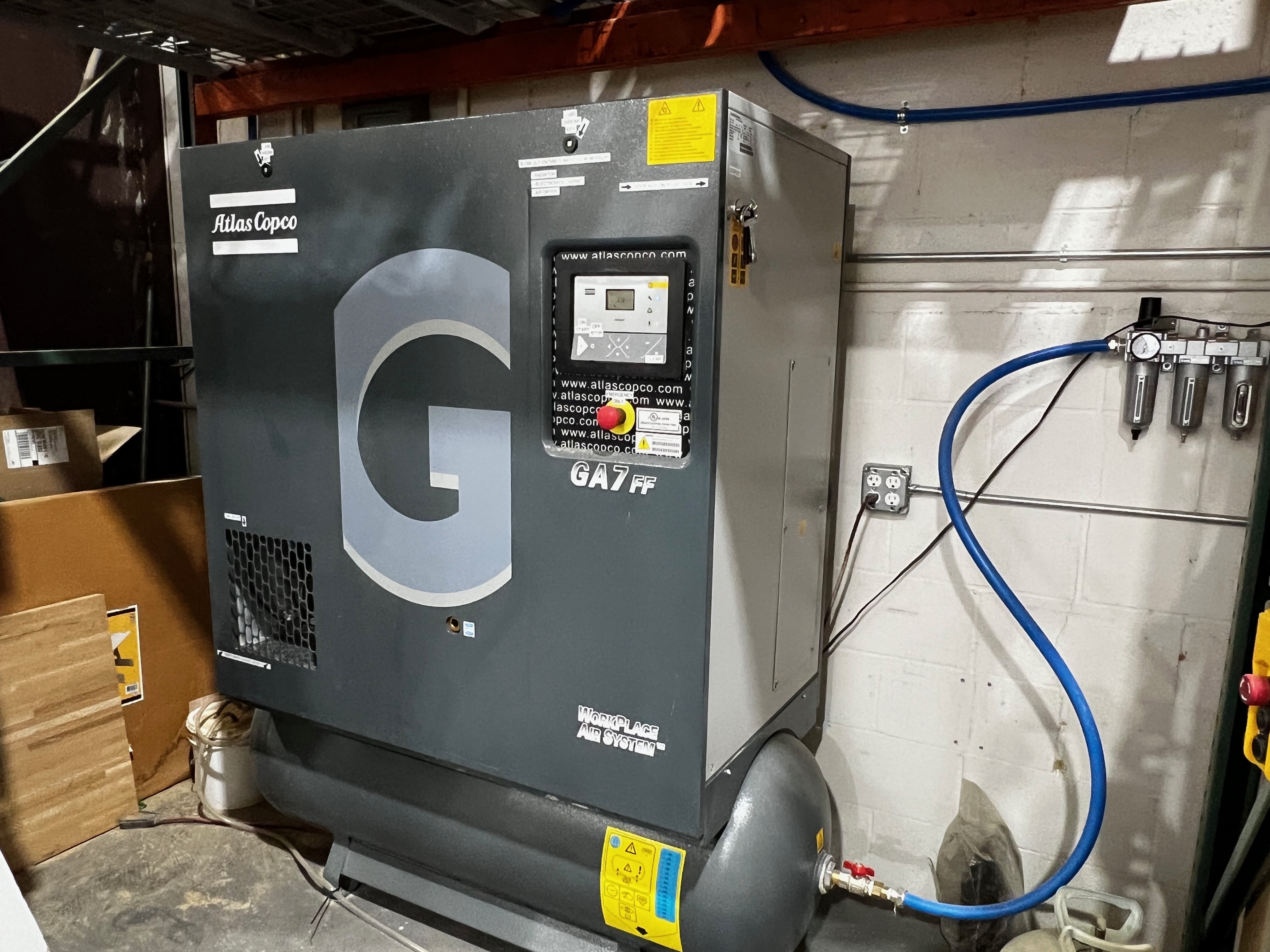 Selling a 2022 Atlas Copco GA7FF-125 rotary screw air compressor in excellent working condition. This is a 10 HP, tri-voltage (208230/460V) machine designed for continuous-duty operation in demanding shop environments. Fully enclosed, quiet-running cabinet with Elektronikon controller and built-in refrigerated air dryer.