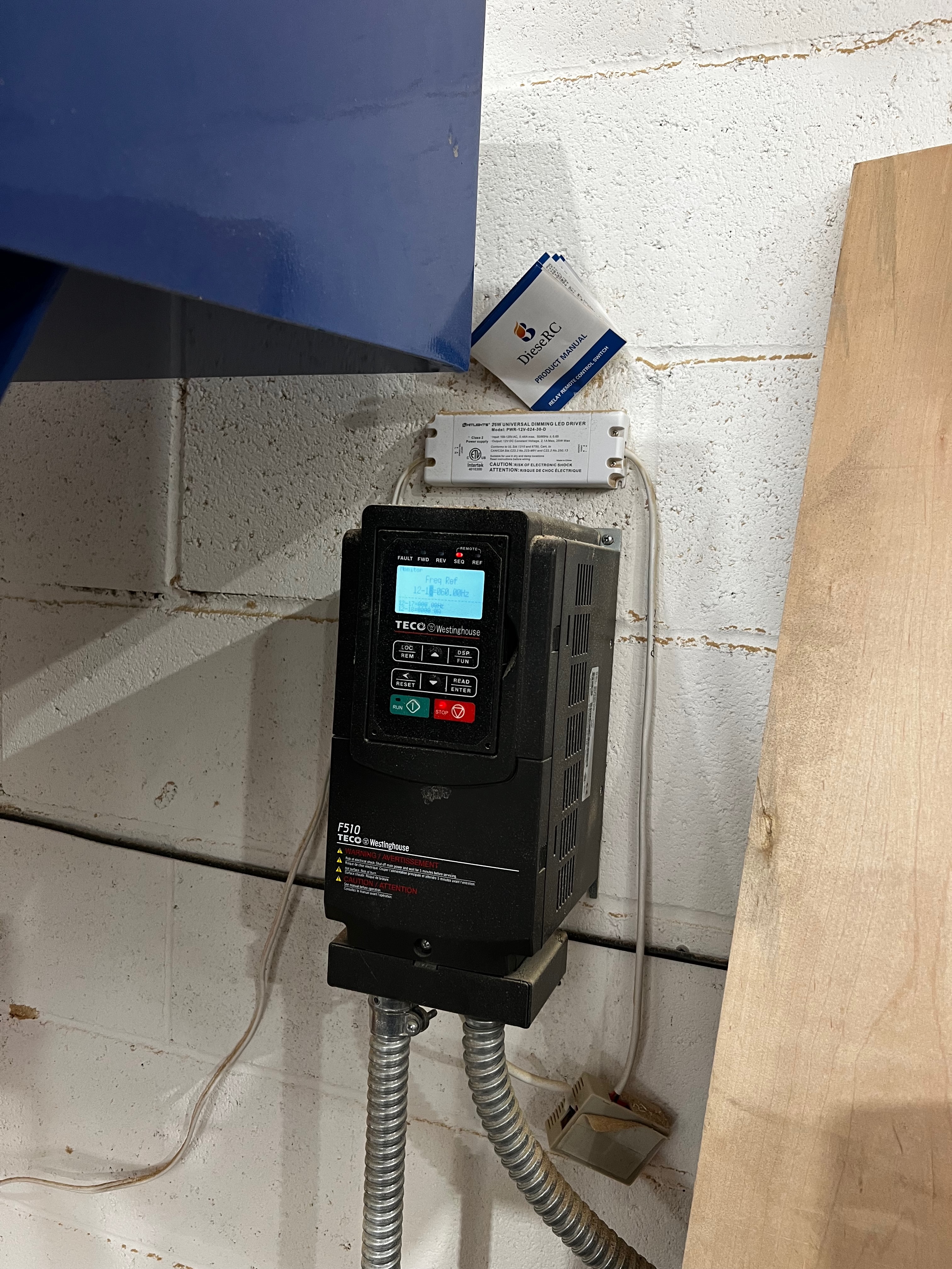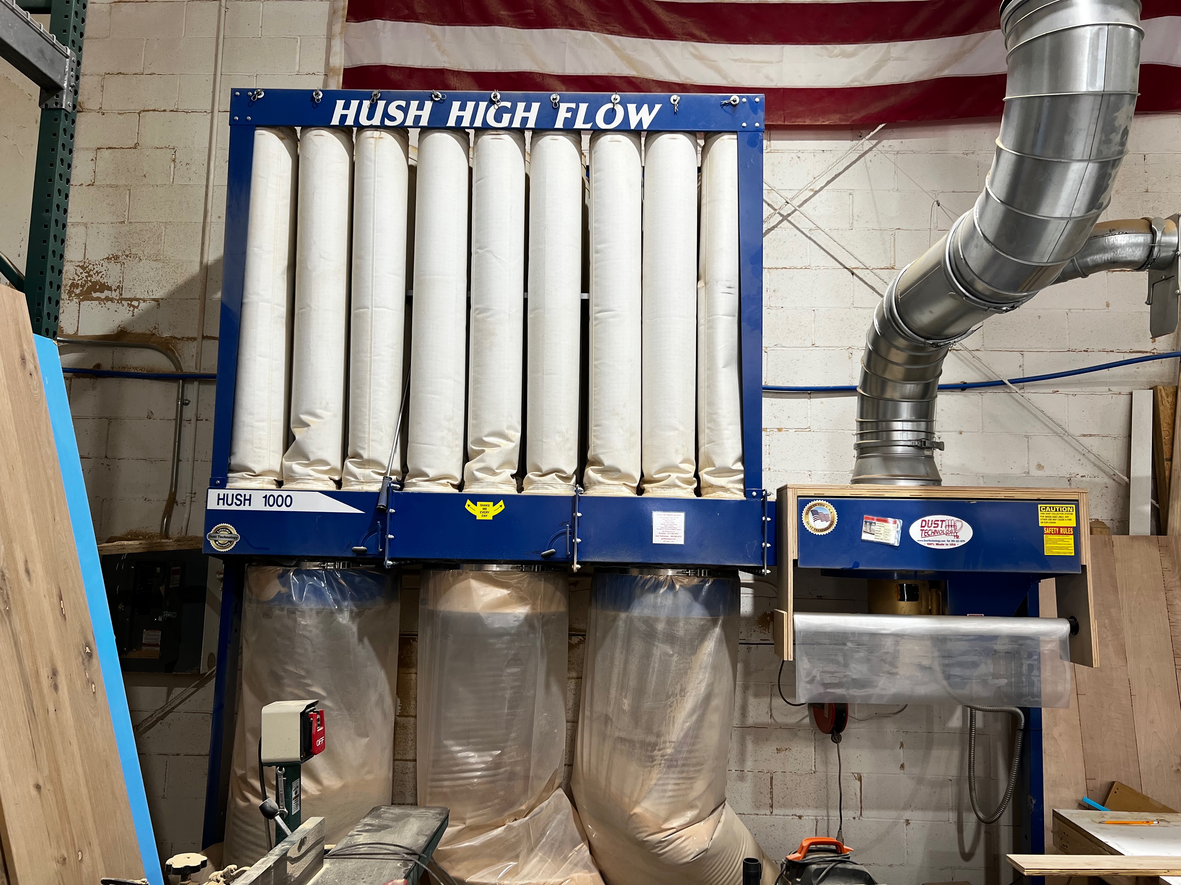Dust Technology DTHHF-1000 HUSH series high-performance dust collector. Delivers 4,450 CFM at 16 W.G., powered by a 10 HP Baldor motor and controlled by an integrated VFD for remote soft-start. Designed for quiet operation with a noise-reducing impeller and baffled airflow for even bag fill. Excellent for CNC routers, widebelt sanders, edgebanders, and multi-machine setups.