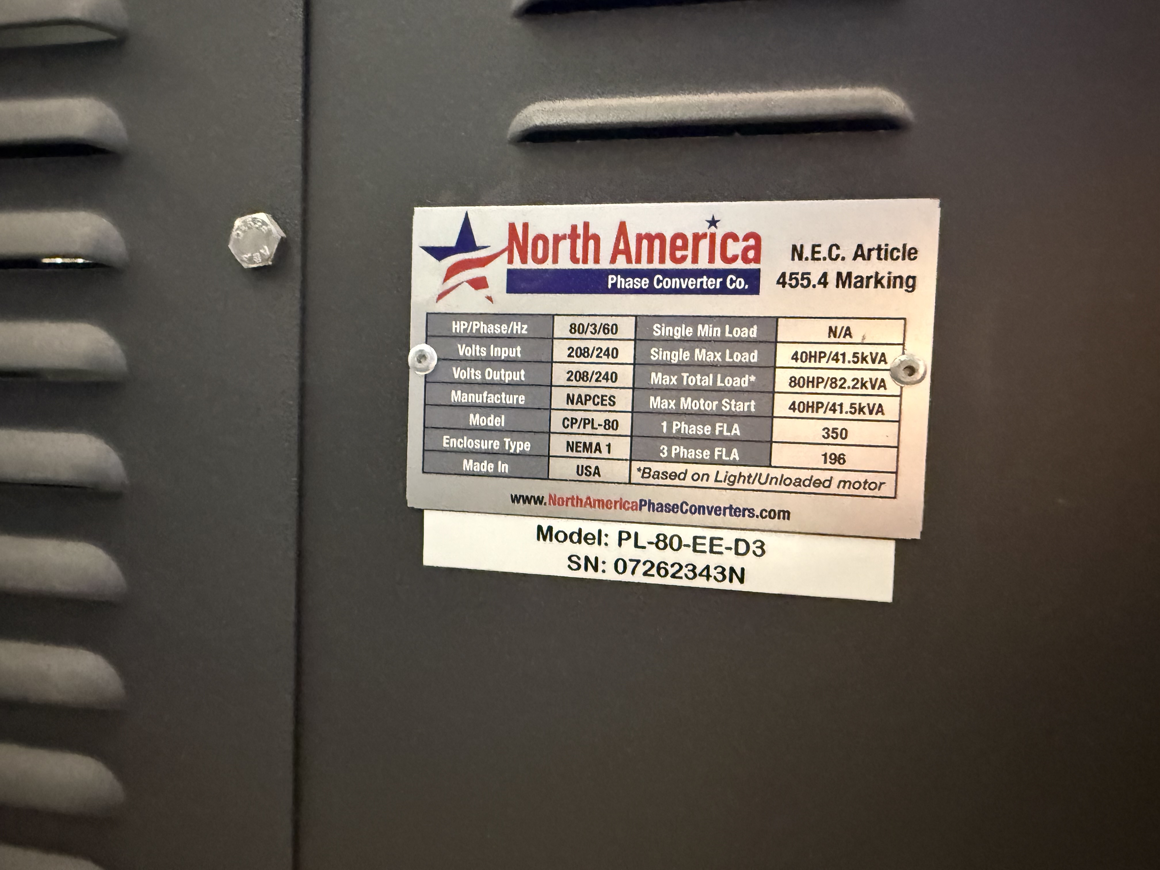 North America Phase Converter Co. Model PL-80-EE-D3. Converts 208/240V single-phase to 3-phase. Runs up to 80 HP total load, 40 HP single motor start. Heavy-duty, made in USA, NEMA 1 enclosure. OBO brand new never been used