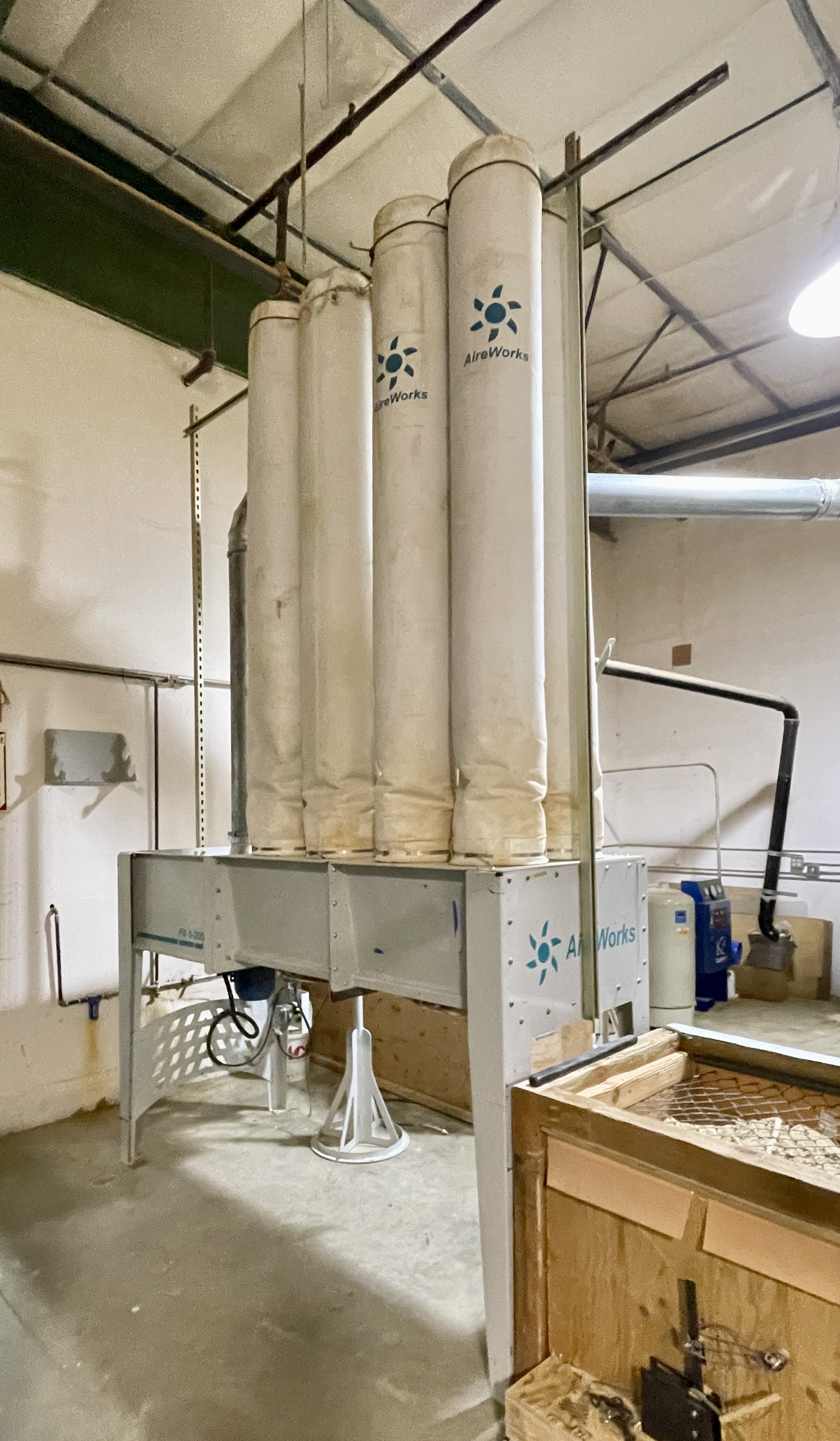 Aireworks FX-5-2000 dust collector. 5HP, 2,000 CFM, with six 12"x 8' High Efficiency filter bags up and (2) plastic dust collection bags. The filter bags have 125 Sq. Ft. of cloth filter area and 16.7:1 air to cloth ratio with 40 Gal. of collection capacity. WEG 5HP TEFC motor with Heavy Duty machined & balanced impeller, 230 / 460 volts three phase. Measures 95"L x 40" W x 13'H. The collector is ready to load.