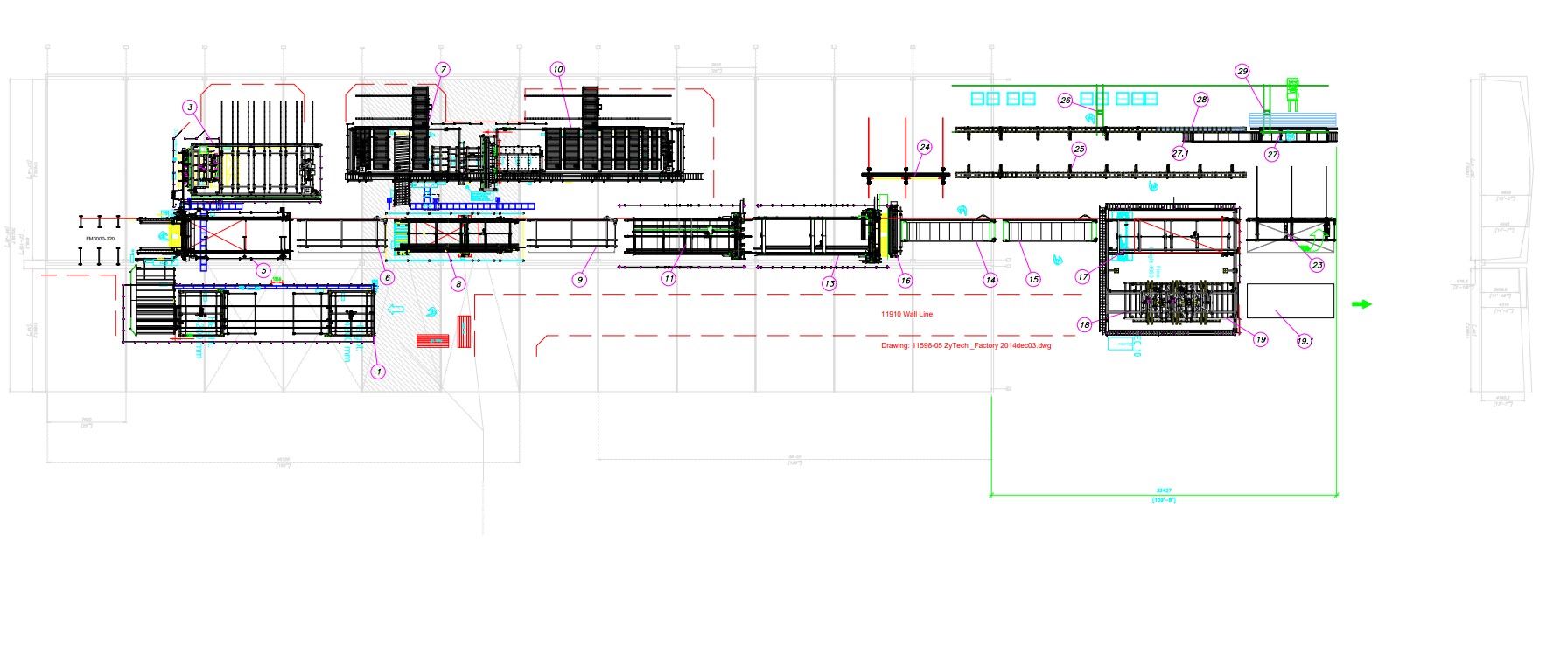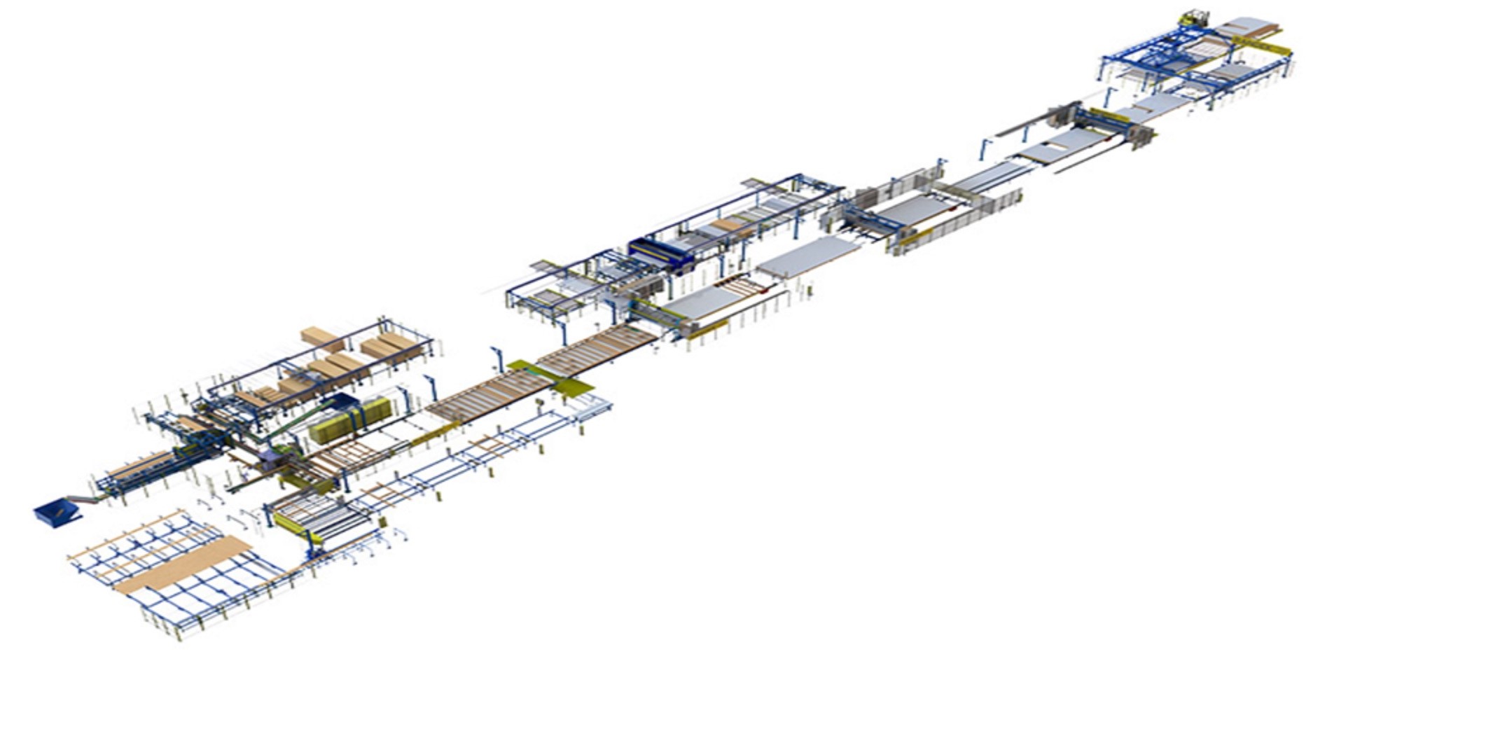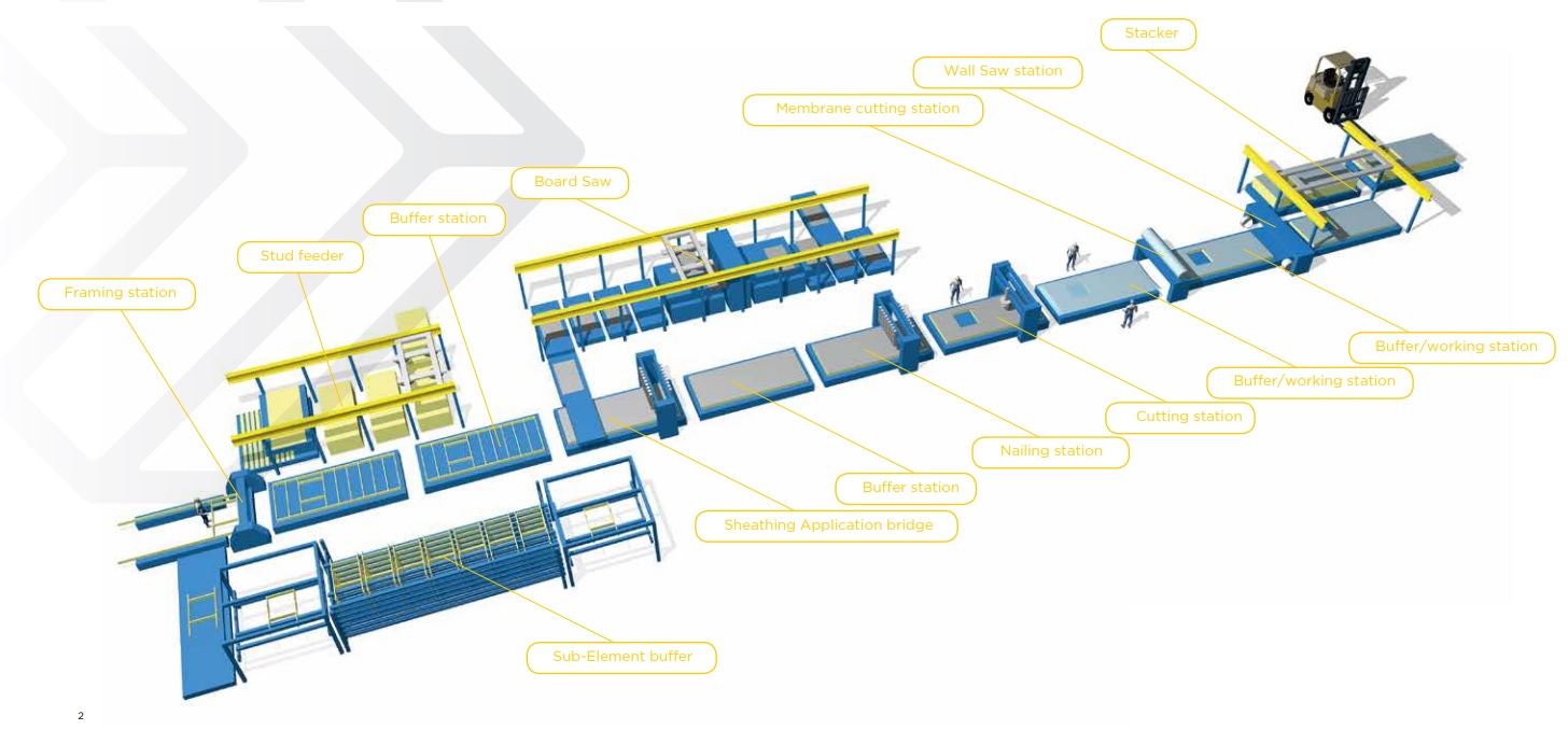 The S3000 Auto Wall System is a wall production line for production of wall frames with sheathing and optionally breather membrane on one side. The production line is completely CAD-controlled which means that it’s controlled from automatically generated computer files. The walls are produced with maximum length to maximize usage for every station. In the end of the line the walls are cut to size, before stacking.