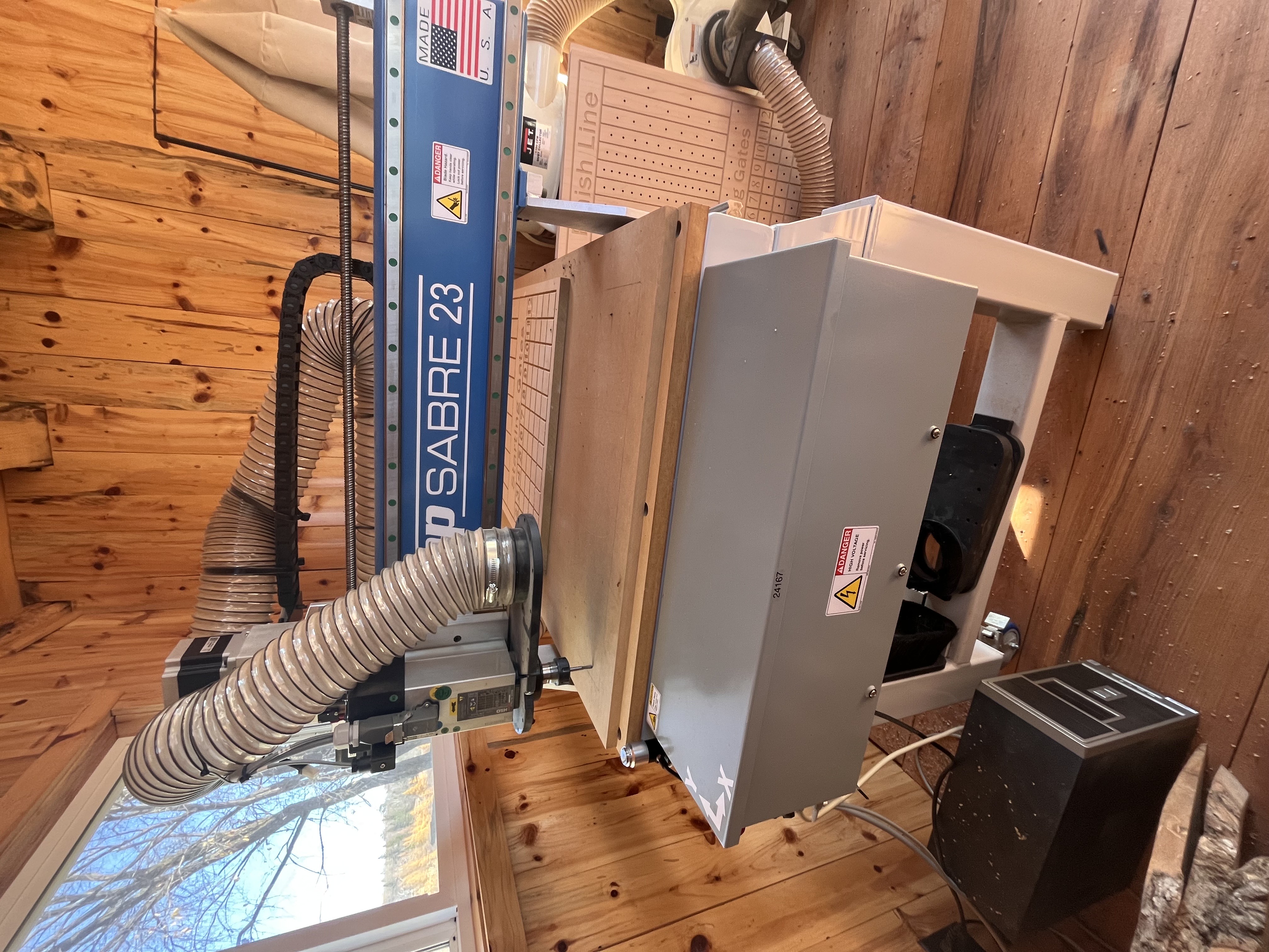 I am selling our shop saber 23 equipped with vacuum hold down. I have attached the original order sheet as well. This machine comes with the tooling on the list as well as other bits from Vortex tooling. The machine only has 40-50 hours on it. It also comes with the computer with VCarve on it to run the machine. Shipping would be an extra cost