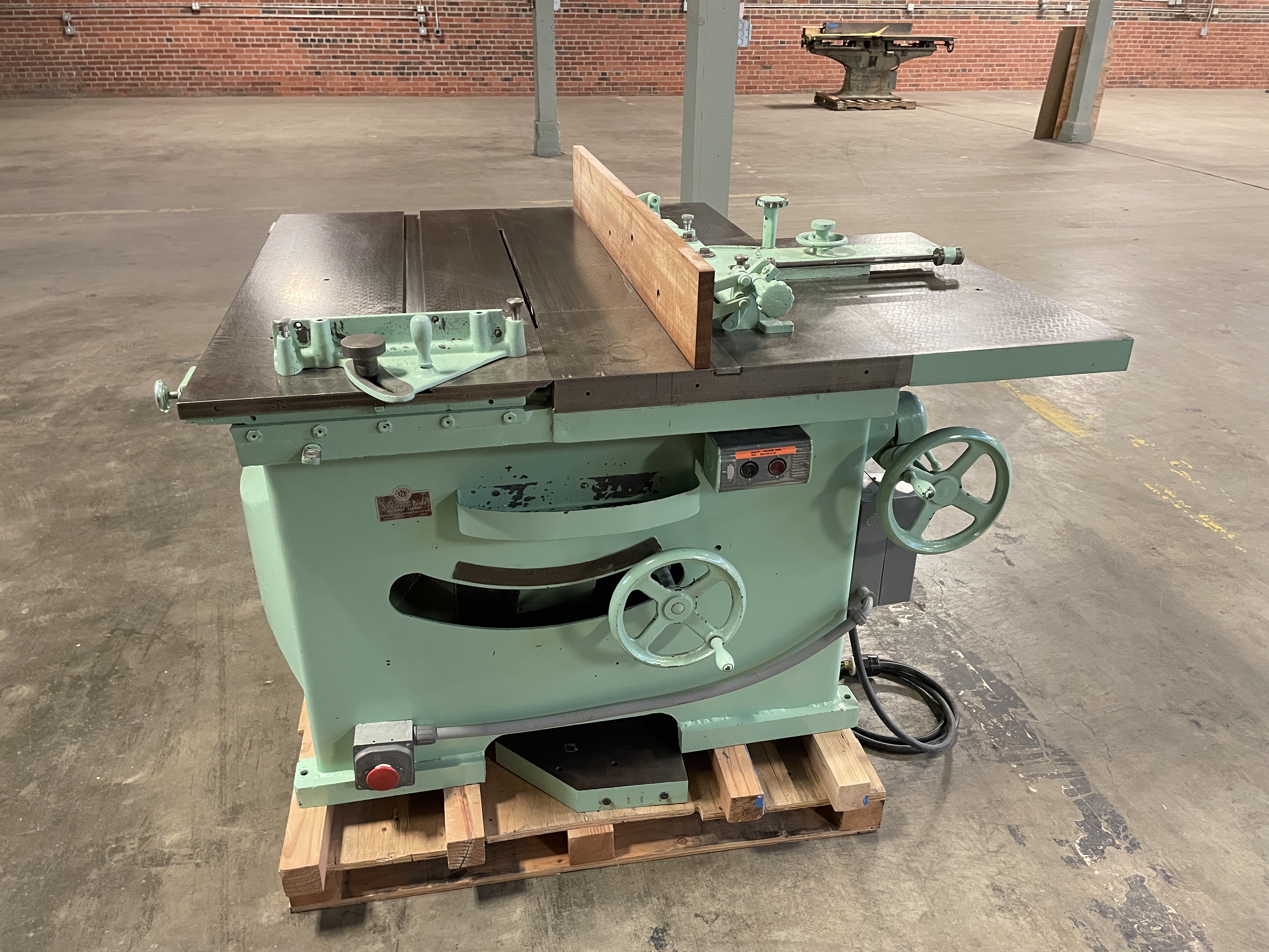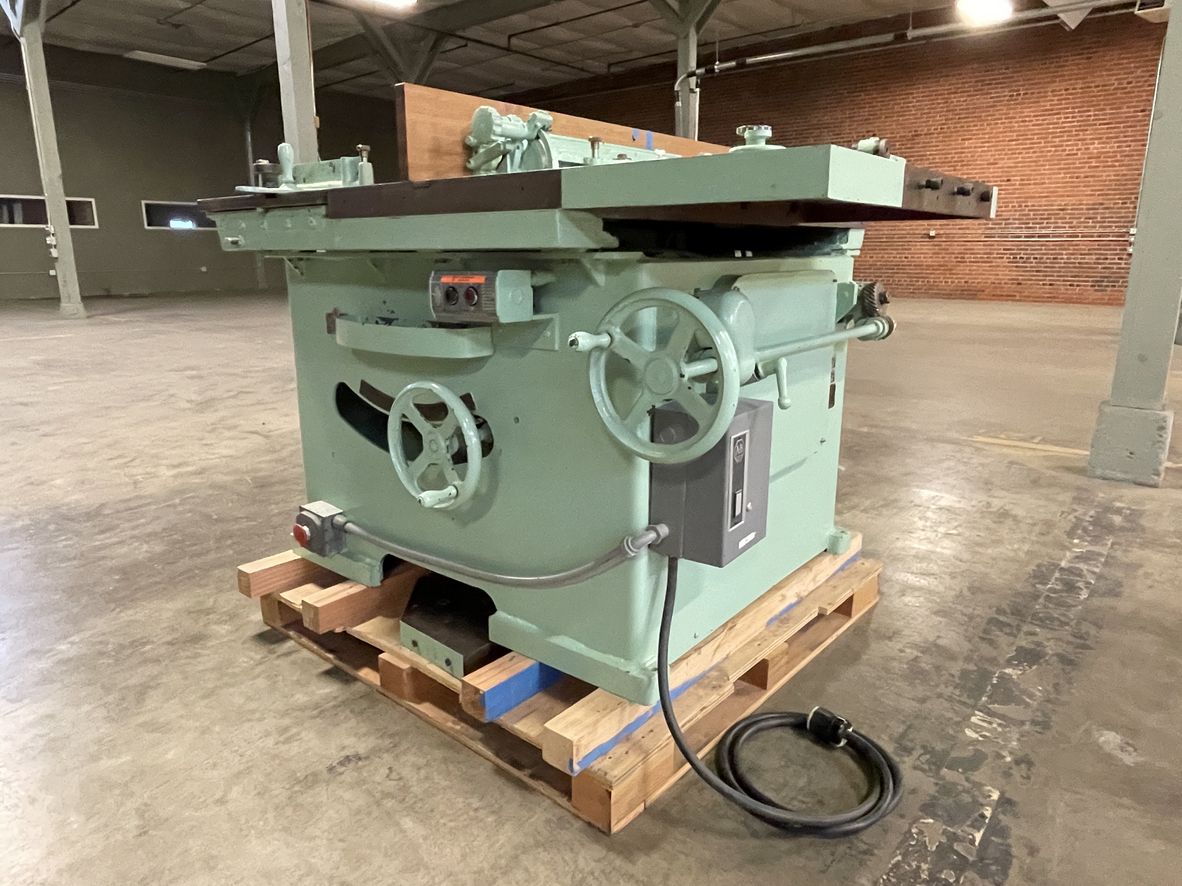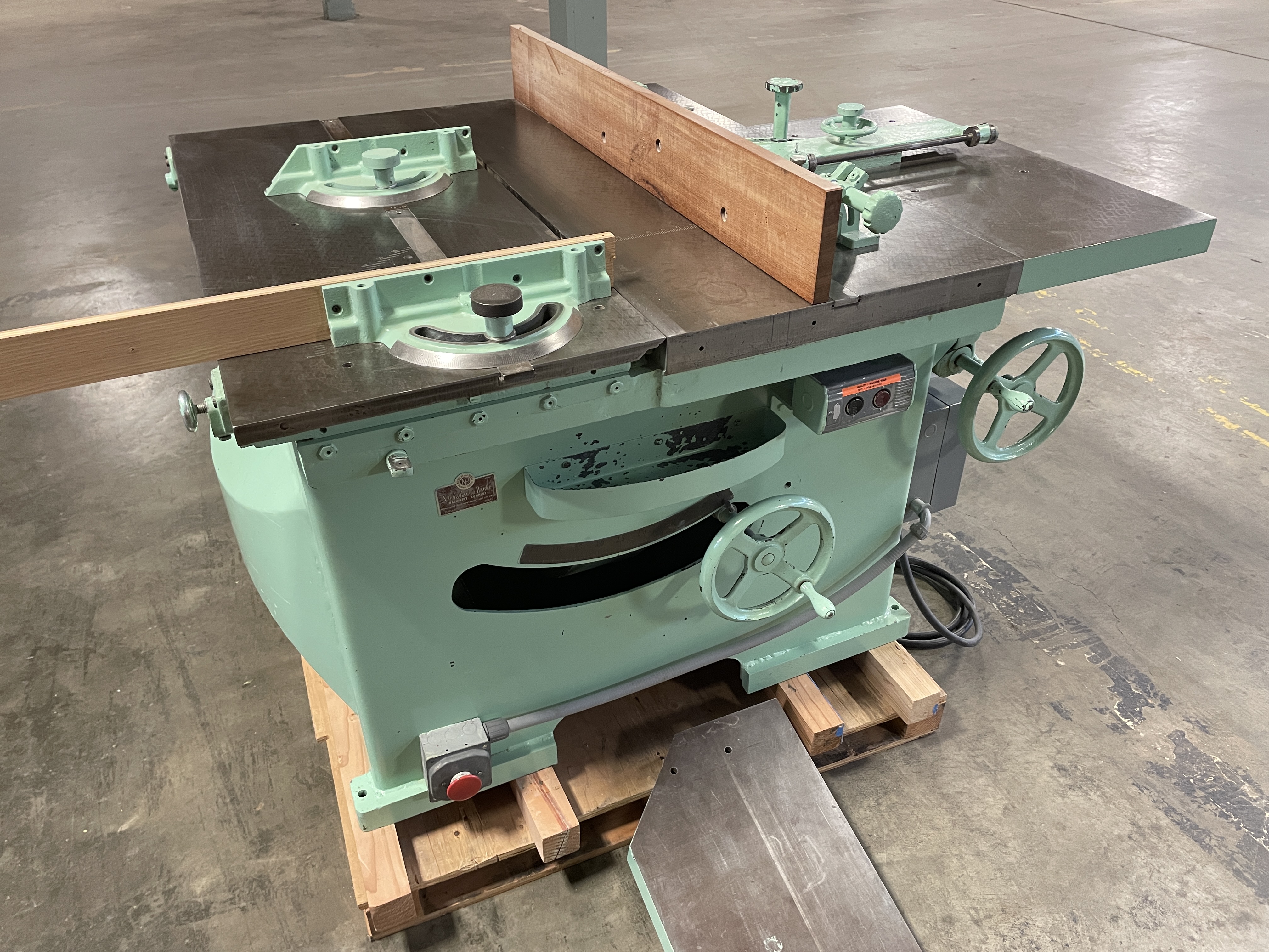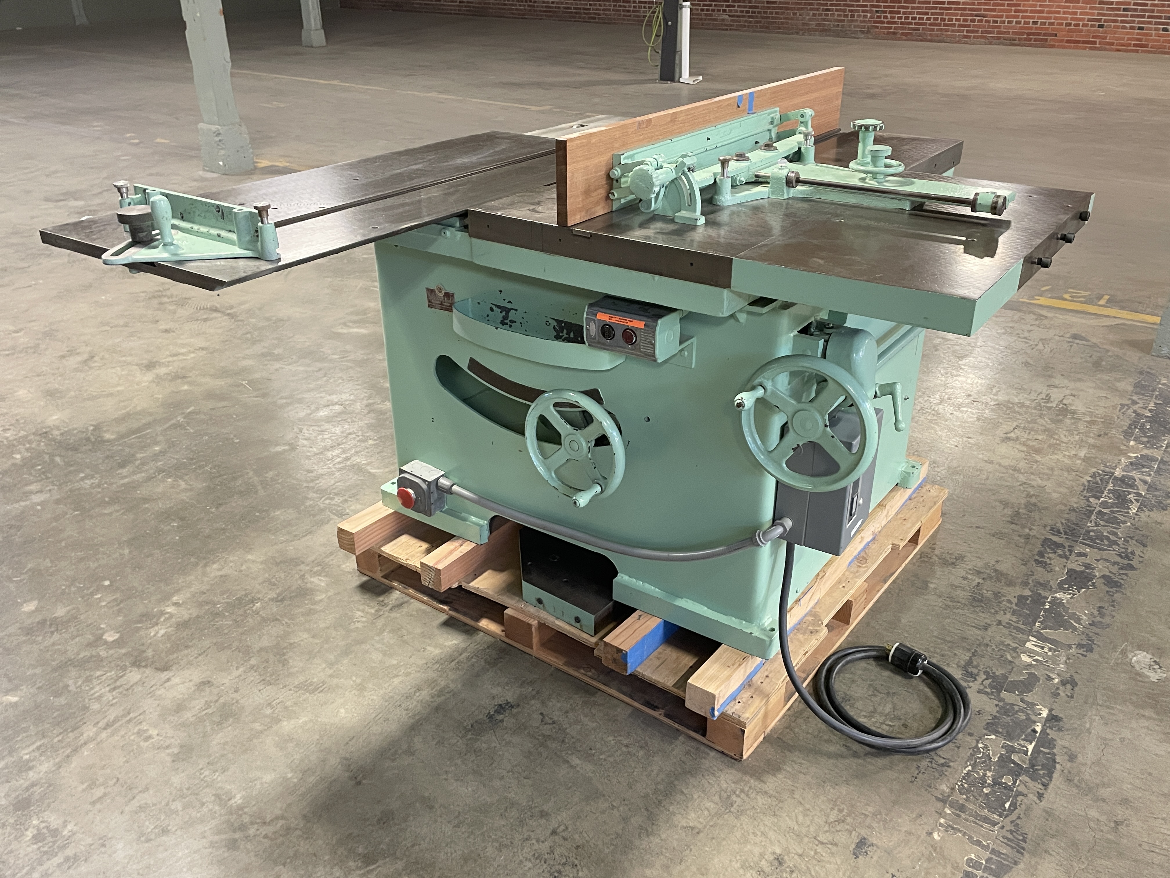1955 Tannewitz JDR dual arbor sliding table saw. Twin 5 hp Woods 220 / 440 three phase motors. Includes quadrant, two miters gauges and tilting rip fence, tapered quadrant and fence pins. The gauges are all original to the saw and factory stamped with the saws serial number. Complete photo gallery coming.