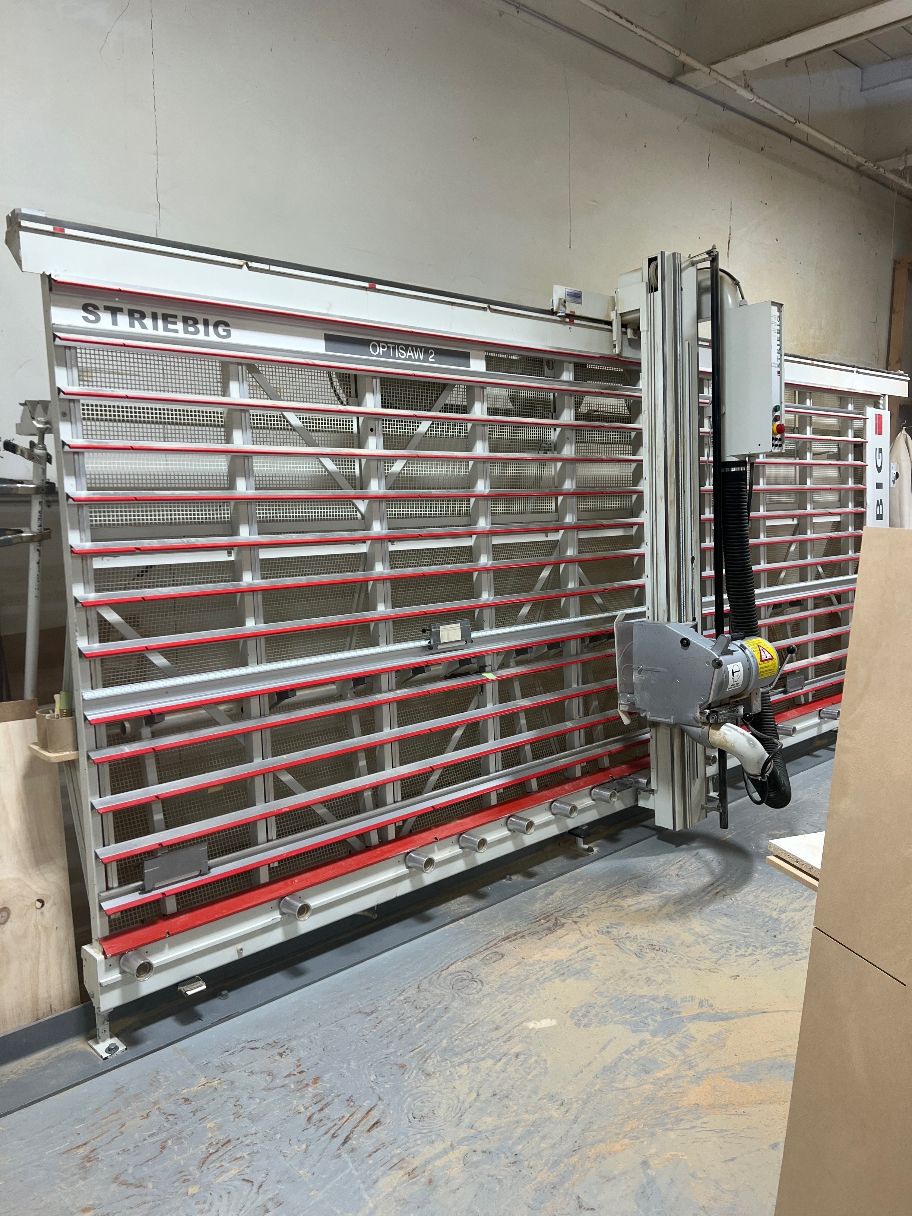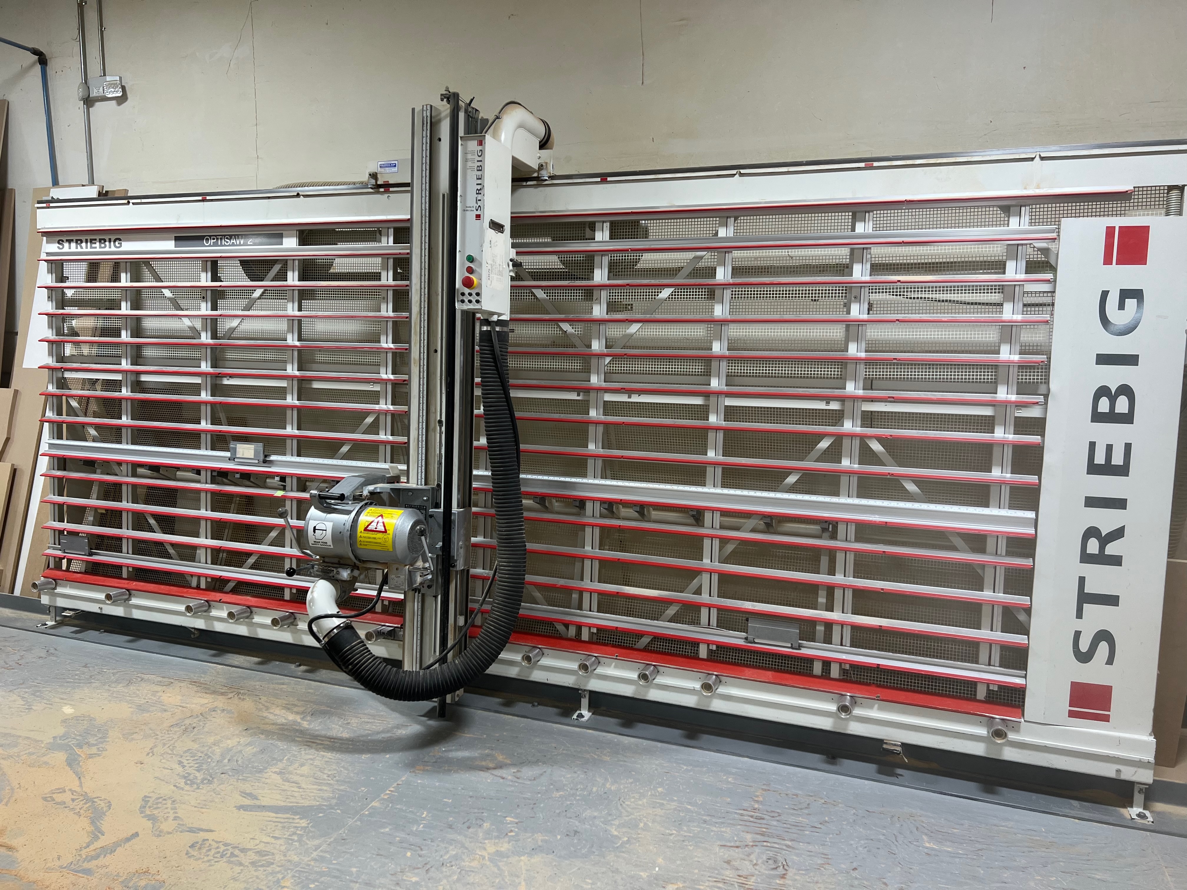Striebig Optisaw 2 vertical panel saw. 169" x 75" capacity, Opti-scoring unit, auto-shifting grid, panel rollers in base for easy loading. 7.5HP 220v 3ph. 12" blade. Features full length mid-shelf with scale and stop for processing small parts. TYPE 5192 Standard II Call or email for price