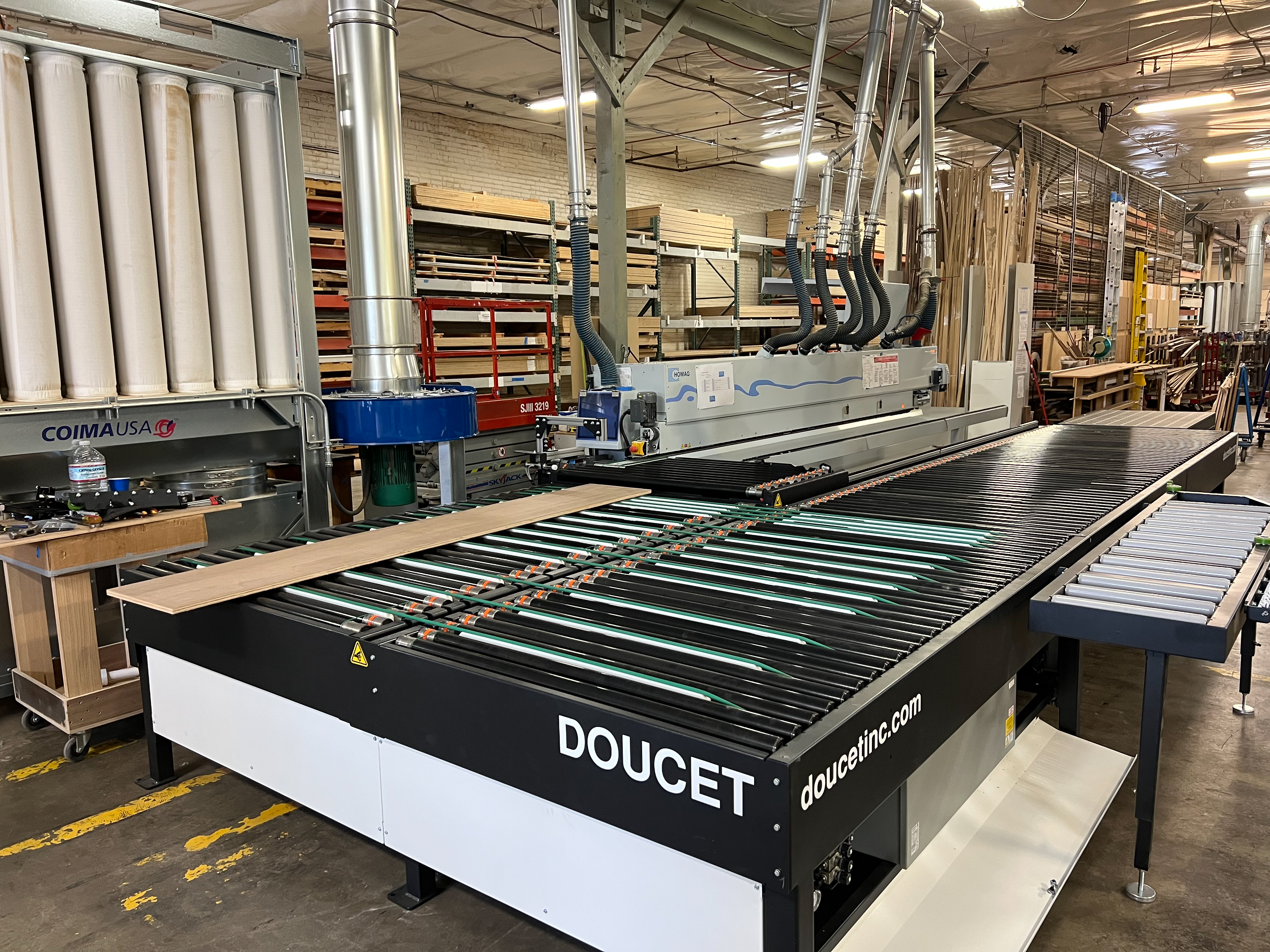 2022 Doucet SRH-48L-31-T left hand return conveyer. Equipped with pneumatic actuated downstroke transfer belts which raise and lower to transfer the receiving panel to the return conveyor rollers. The return conveyor was taken out of service due to the replacement of the edgebander it was ordered for. The return conveyor is in very good condition and has been lightly used.