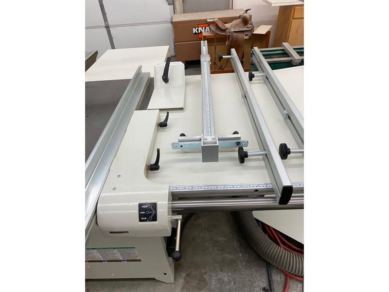 126" Stroke with scoring; telescoping crosscut fence with panel support; back squaring fence: (2) Flip stops; 3/4" dado capacity.