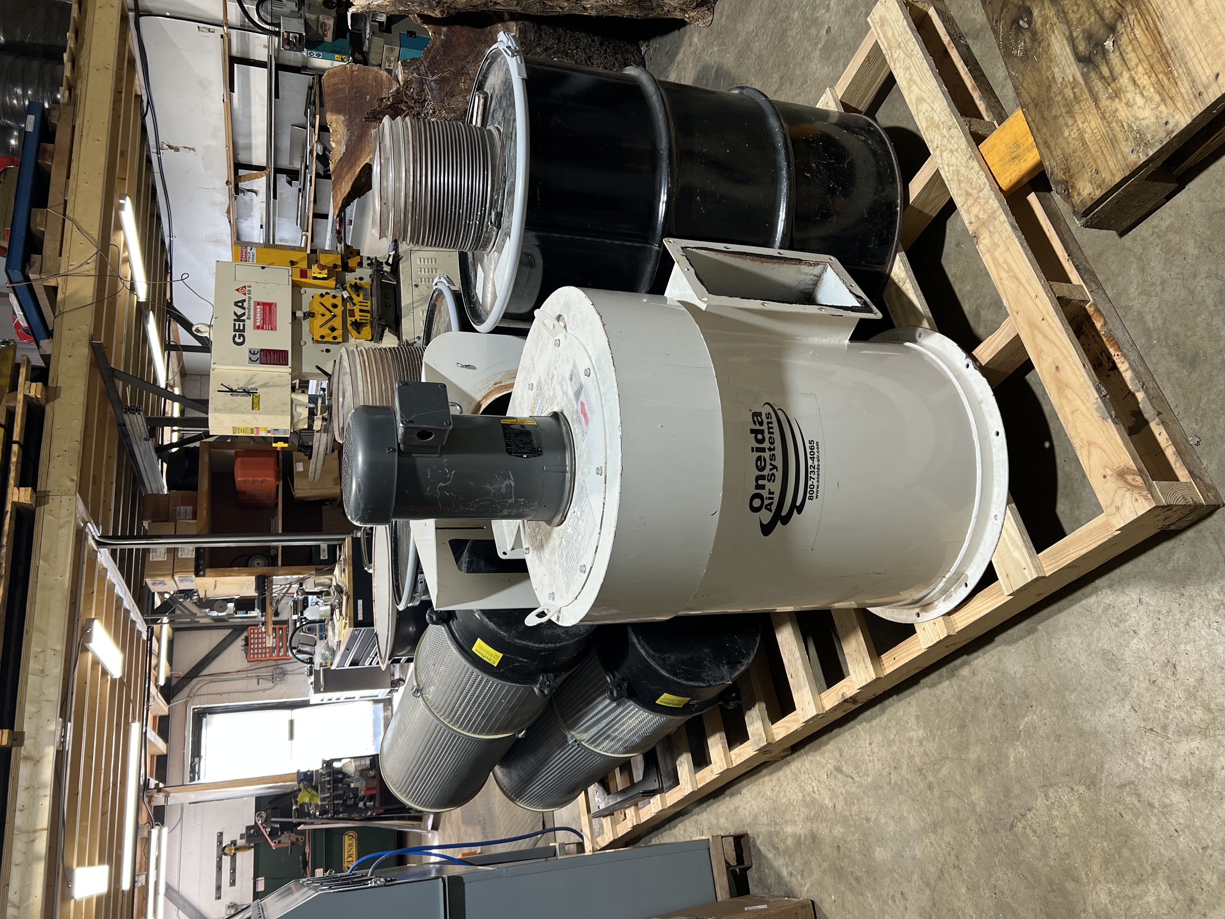 Oneida 7.5hp dust collector, 230v 3ph. Comes with stand, 2 filters, 4 55gal drums, bin sensor, magnetic starter. Low use, one man shop. Plug not included.