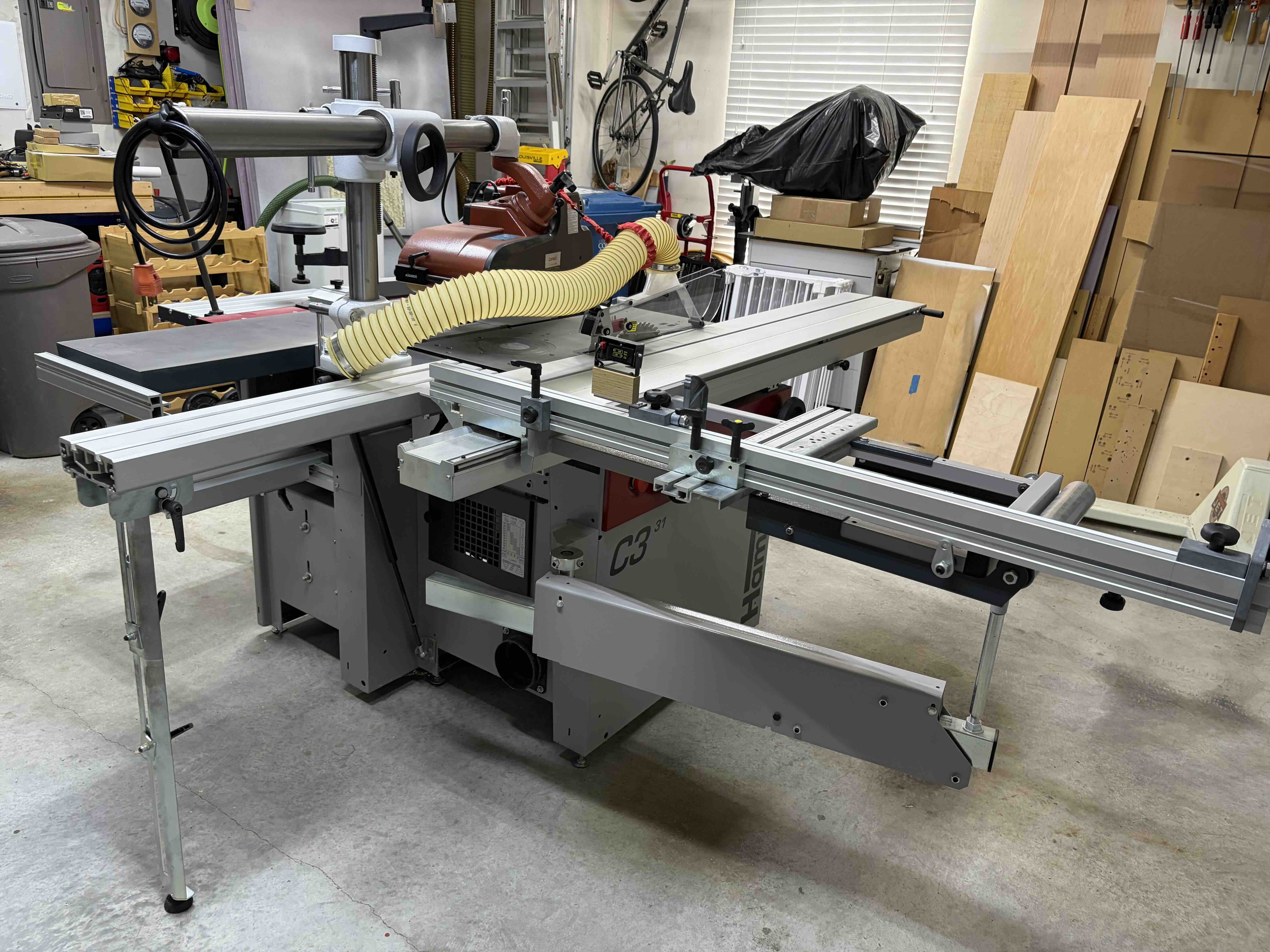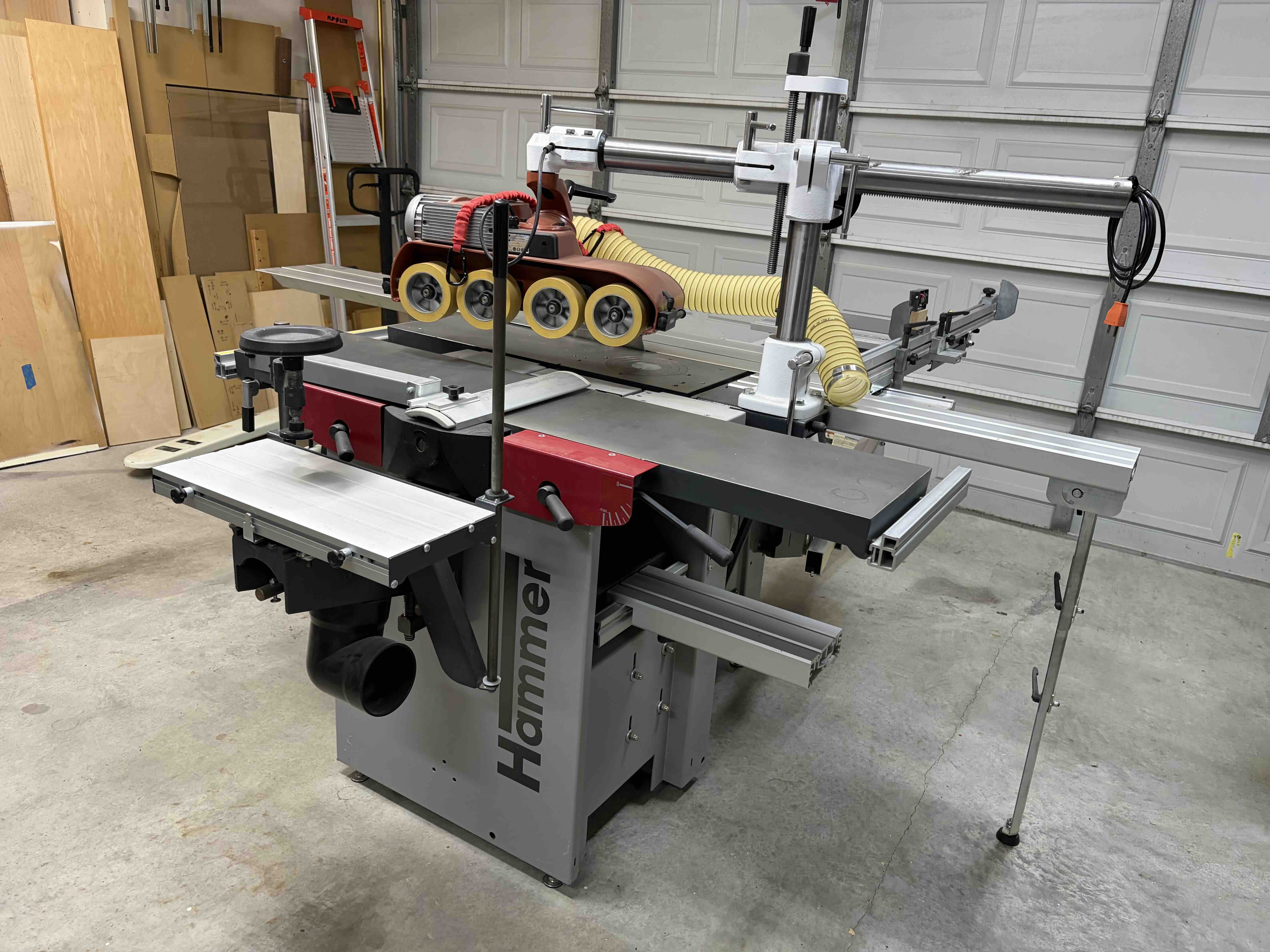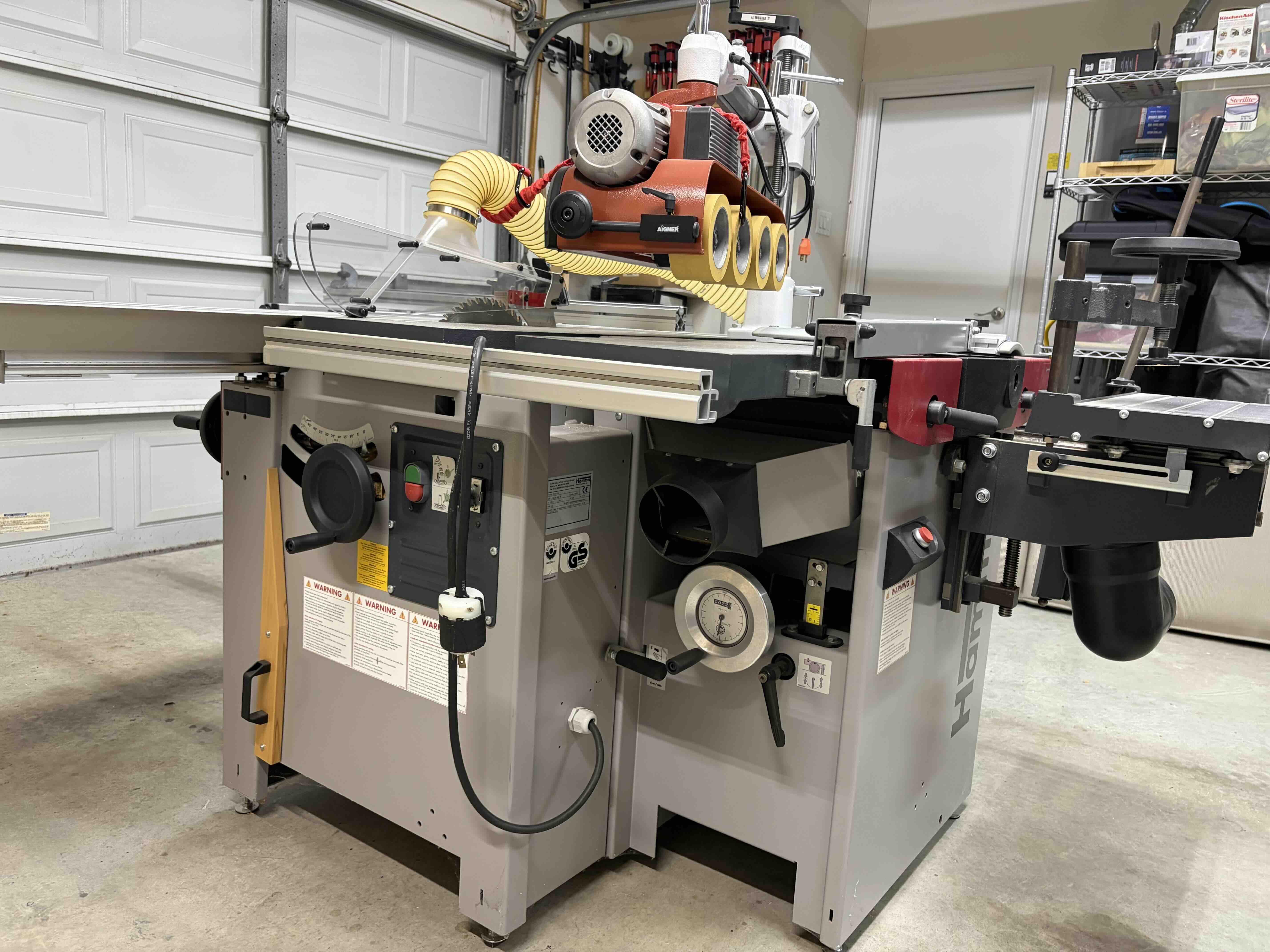 Purchased in 2016. Includes a Silent power helical head. Sliding table with cutting length 80 inches, dado capable. Added a digital readout for the outrigger fence, digital hand wheel for the planer, mortiser attachment, extension table front and back for the planer, extension table for the saw, upgraded the saw hood to a 3D printed unit with better dust collection, purchased a digital parallel guide from Lamb Toolworks, added a Comatic DC40 power feeder with tilt table and gas spring to make lowering/lifting into place easier, curved shaping guard, tenoning hood/attachment for shaper, shaper safety bar guides, Fritz & Franz jig, manual clamps. Instruction manual and documentation. These are included as a single item for sale $8,000.