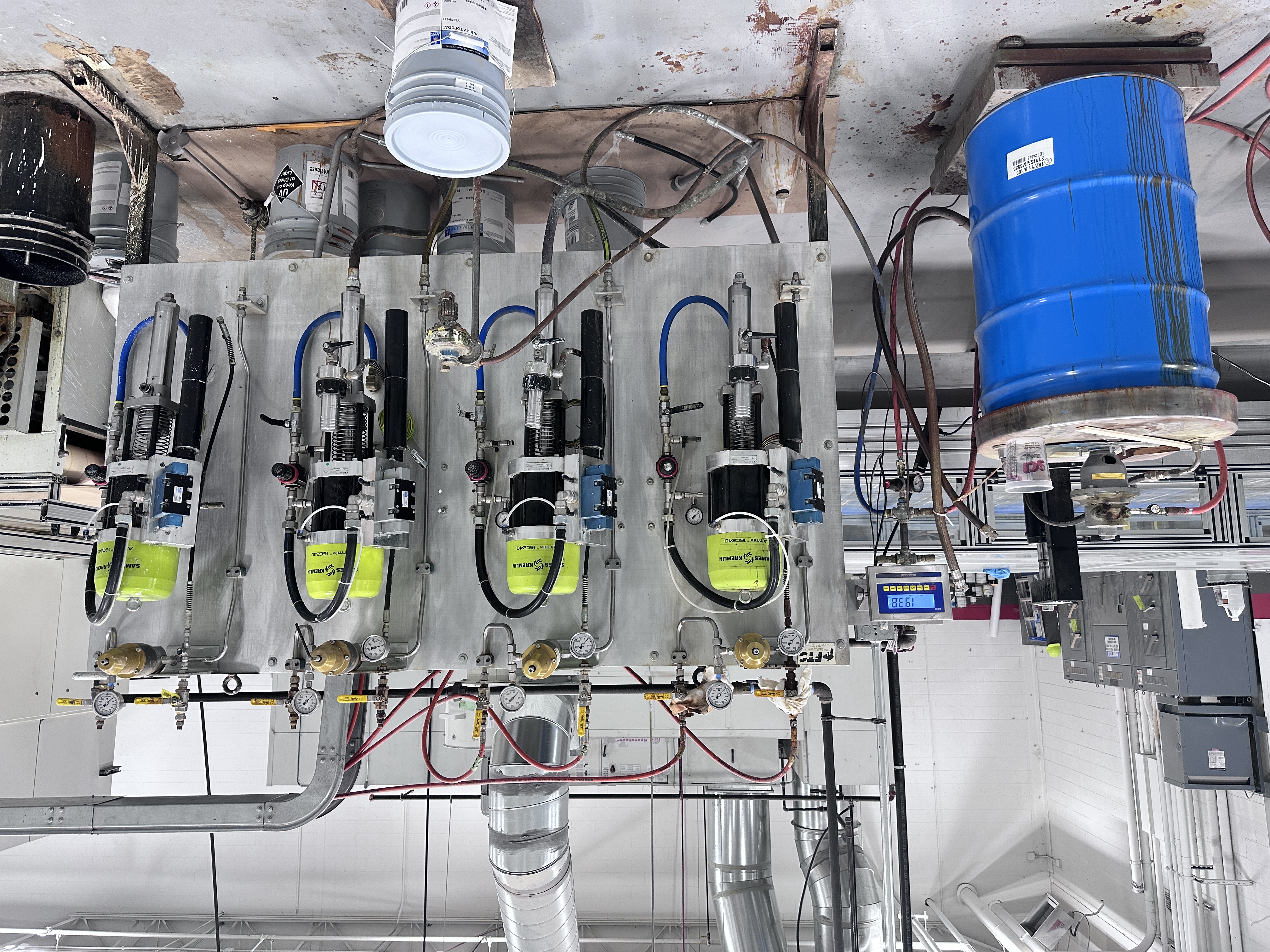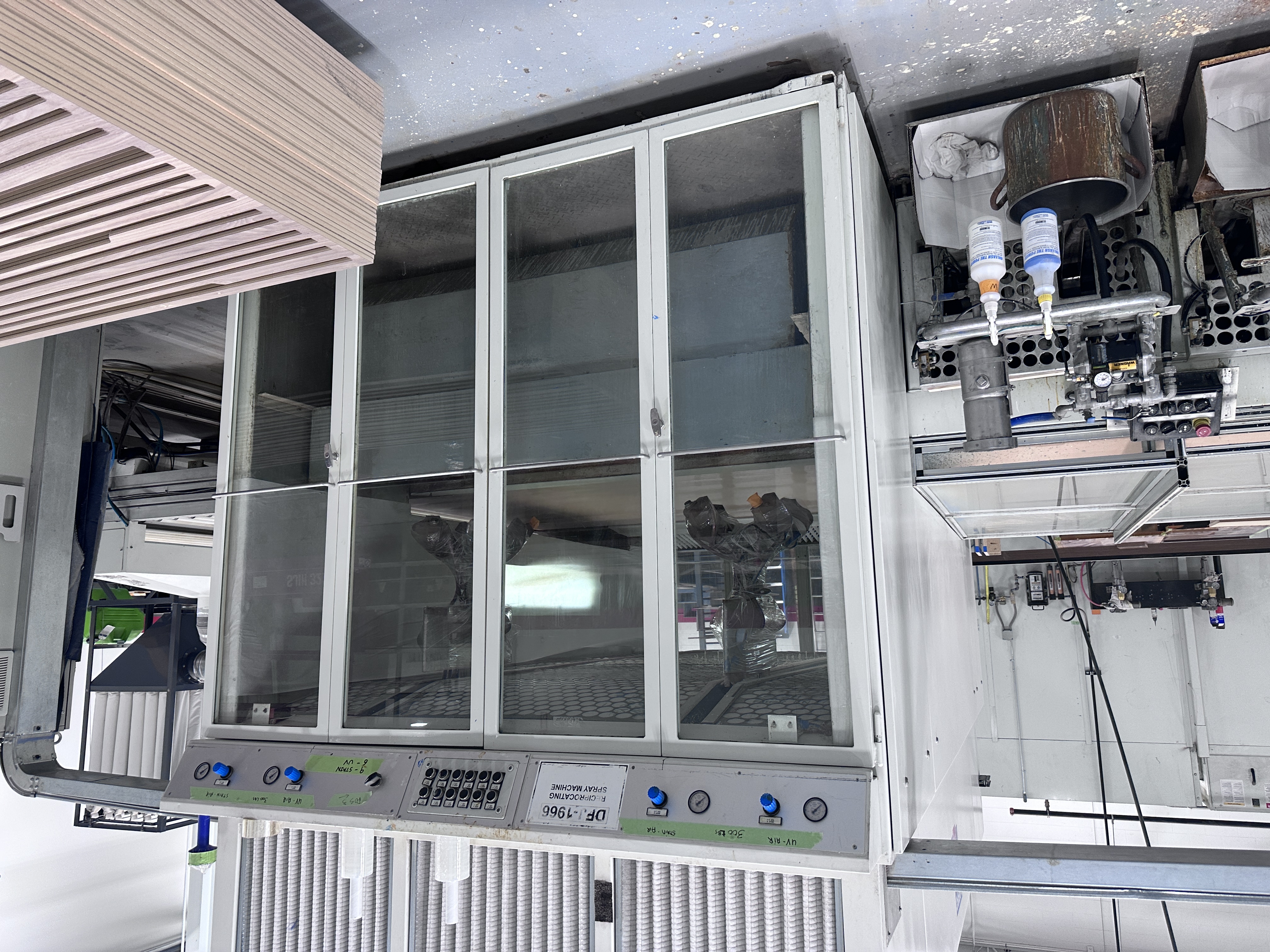 Superfici Finishing Line including but not limited to; Belt conveyor TT1 3500, Deionizing system, Twin Spray reciprocating sprayer, UMI UMA, Laminar Dryer, UMI UMA, UMI UMA, Transition Hoods, UV Dryer twin, Belt Conveyor TT1. Line is U-shaped