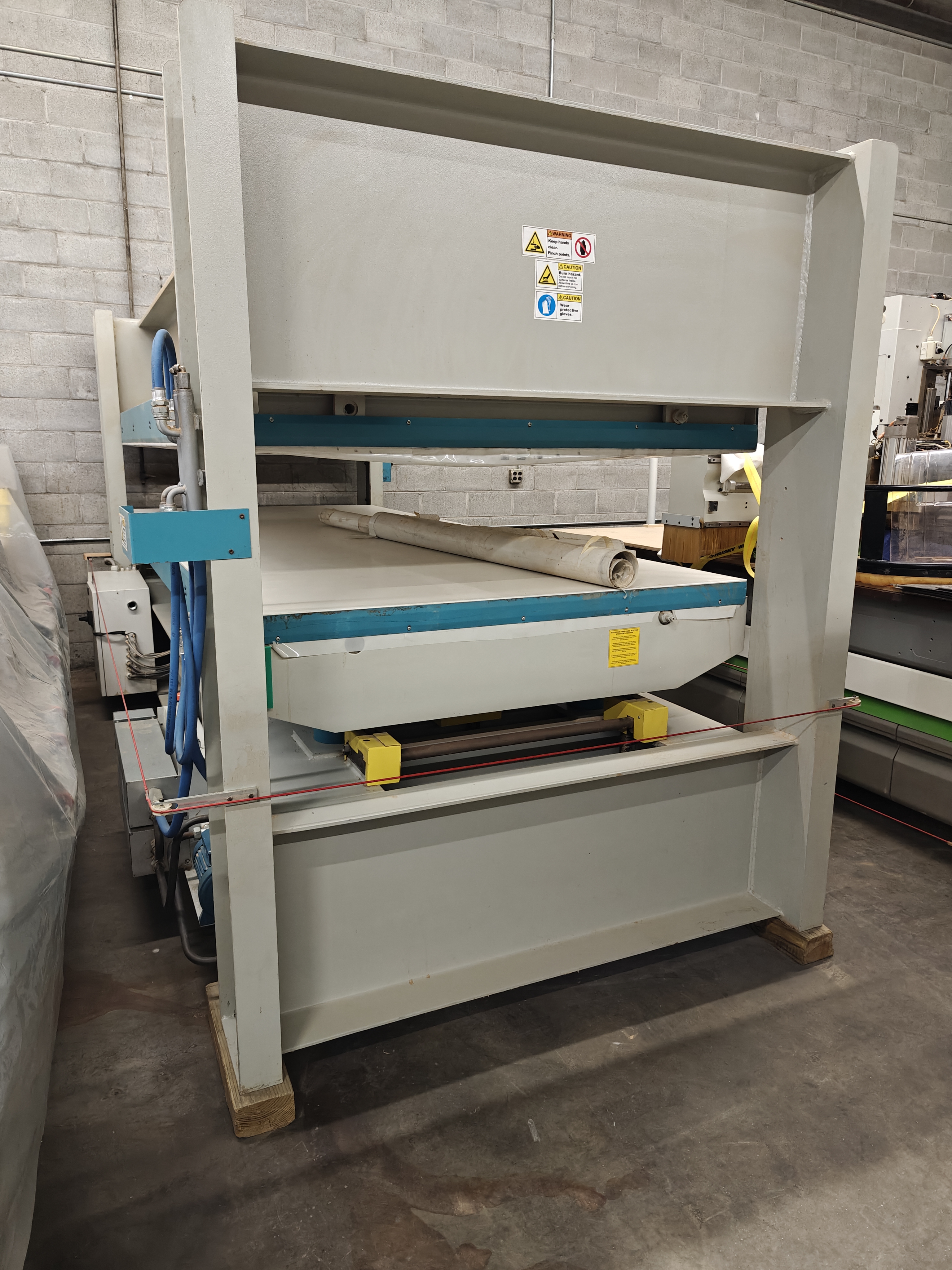 Platens covered with easy to replace, glue resistant Mylar film Self-lubricating corner guides and rack and pinion system to maintain parallelism of the press platens during opening and closing