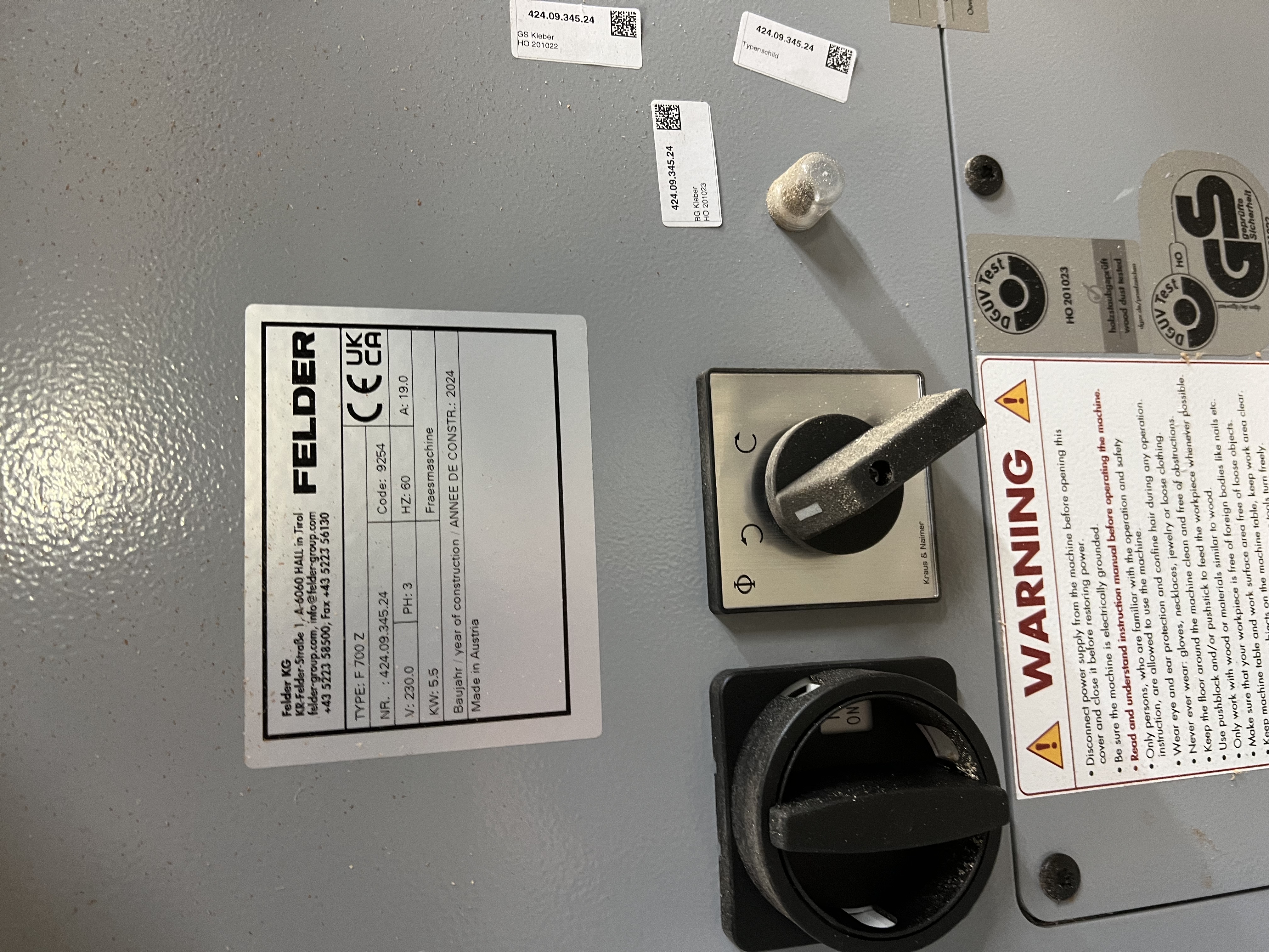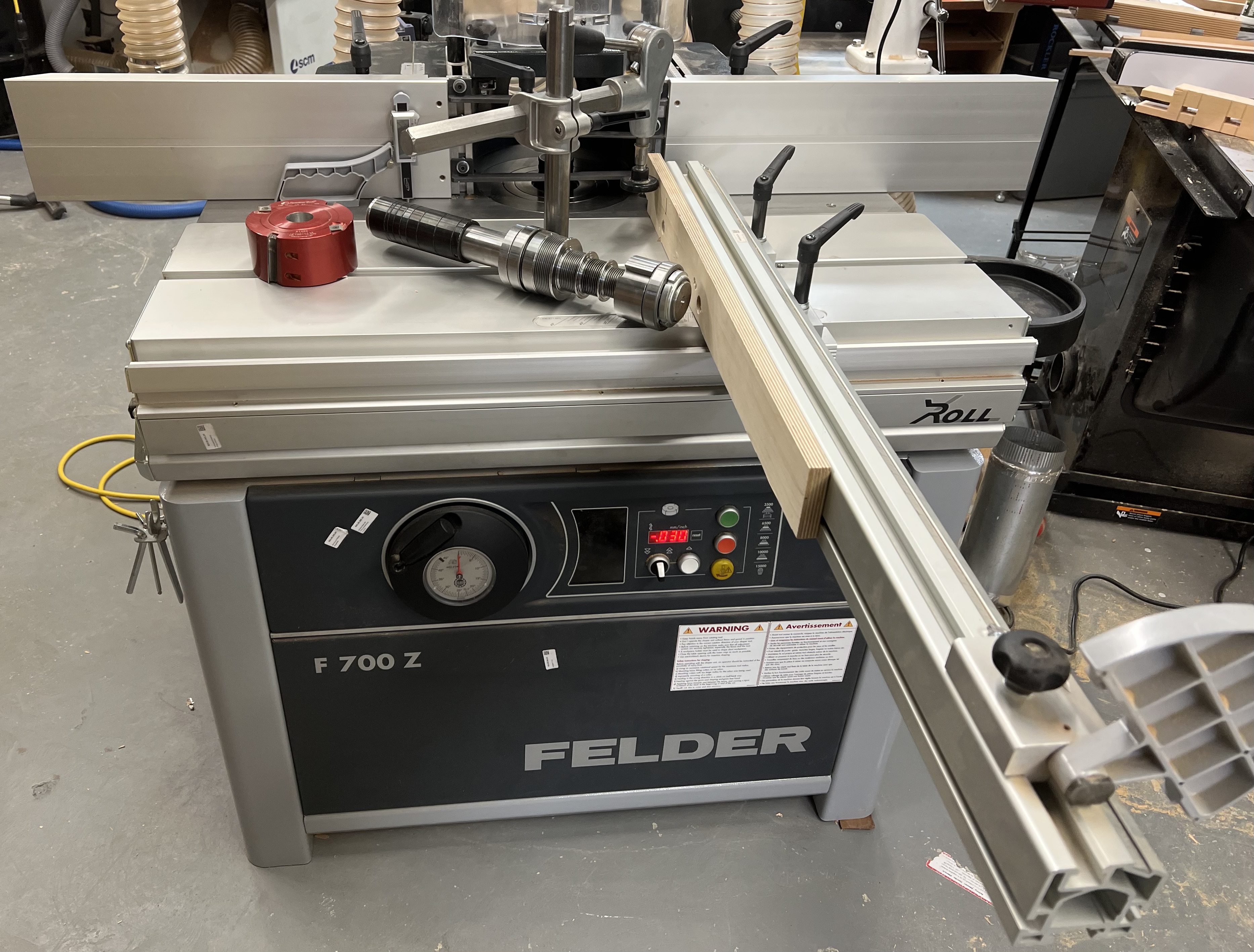 Felder F700z Shaper. Purchased fall 2024. Includes 7.5 hp 3-phase motor, 1-1/4 spindle, x-roll table, fine adjustment fence, digital height readout, analog tilt dial, 1100 crosscut fence. Extras include an additional 1-1/4 spindle, workpiece clamp, safety guard fence, and Amana insert rabbet cutter.
