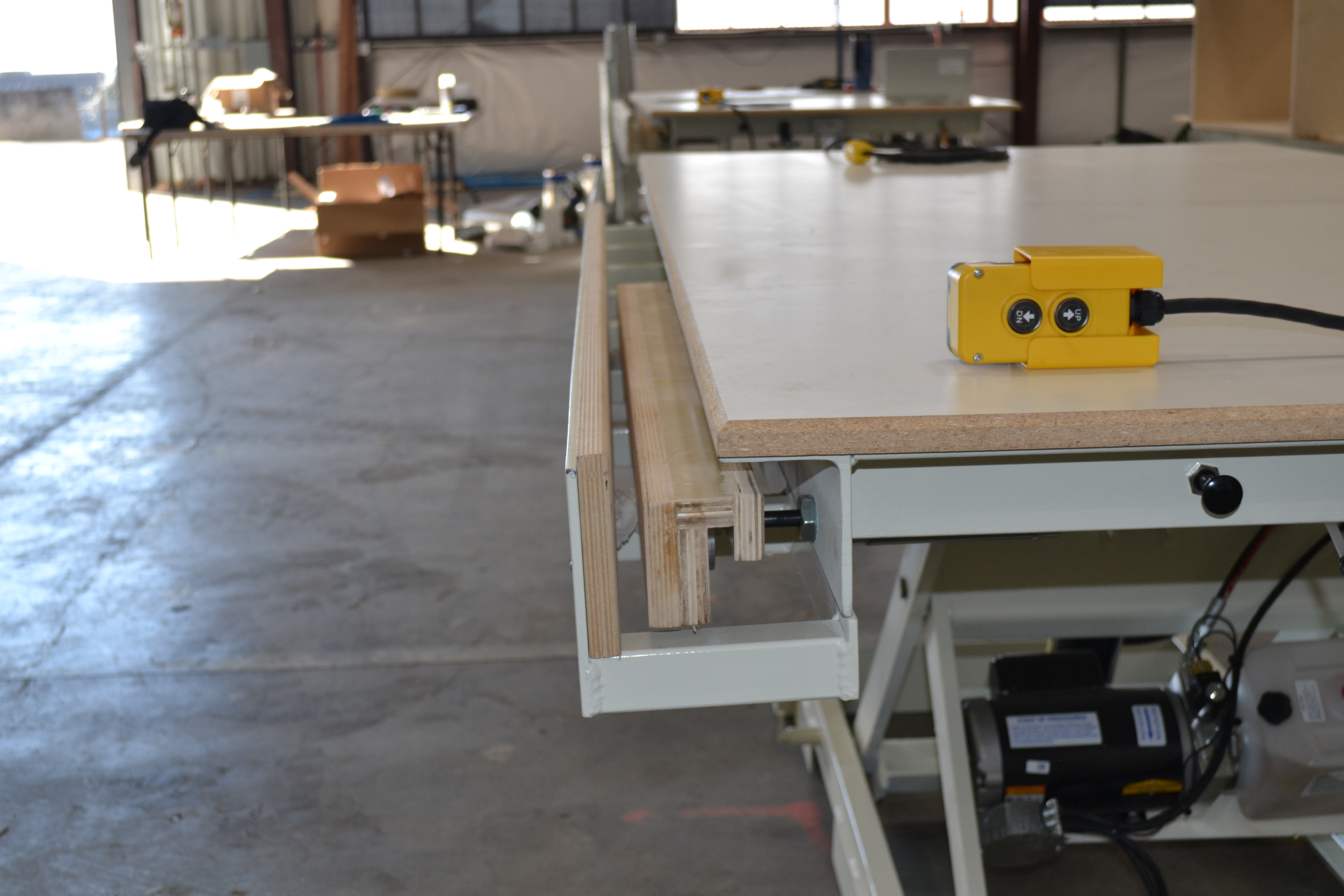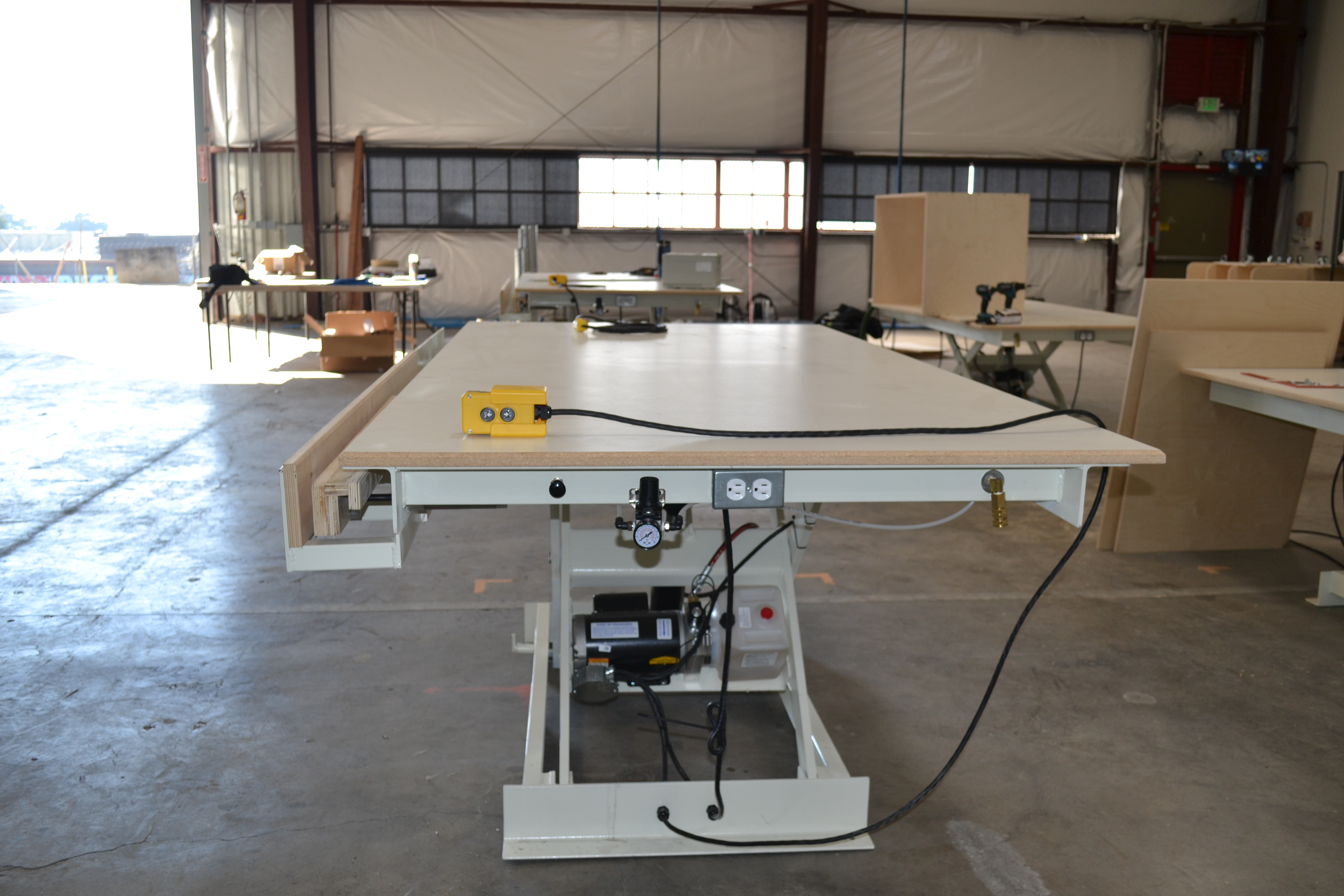 These new work lift tables are built in Northern California by a small specialty manufacturer and offer a unique solution not commonly found on the market. Designed for cabinet shops, assembly areas, and production environments that need ergonomic height adjustment with integrated power, air, and clamping.