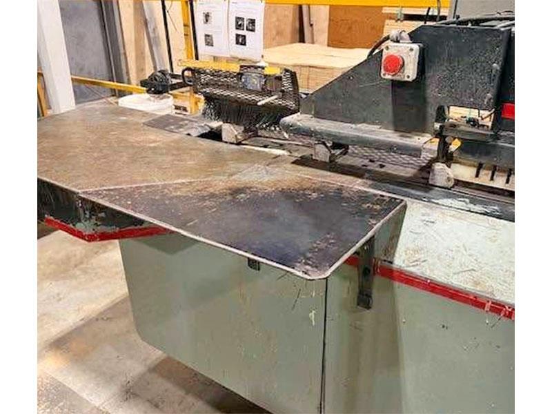 - Pieces are fed through with: Bottom & side chain through the Cutoff Saw to a movable limit switch and cut to length; 5 HP upcutting Cutoff Saw for continuous assembly; 2" x 9" cap. with: 14" Blade; finished lengths are pushed out by the next piece onto material outfeed arms.