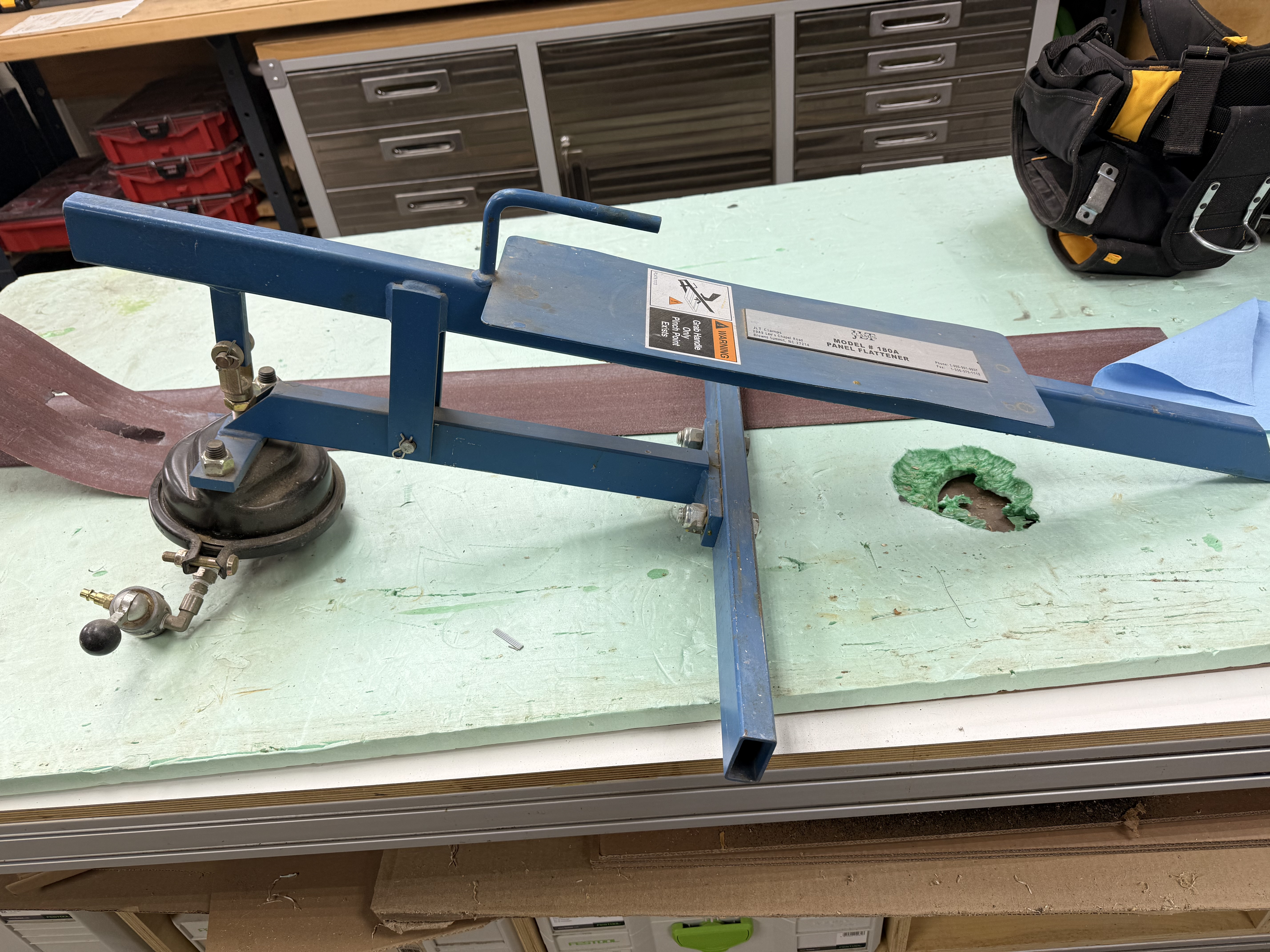 This is a JLT Panel Flattener, it has been in my shop for a few yrs but has rarely been used. No reason I just haven't used it much. Works fine as it should with no problems, included is a rack that it sits on while not in use. Works especially well when you have material that is not all the same thickness. One side of the glue up is always flat no matter what the thickness's are that are being glued up. JLT's website explains this along with its use. Original price was over $1800.00 for this item. This clamp is located in the Pittsburgh Pa area, it would be a large item to ship. I would be willing to drive to meet up if within a reasonable distance.