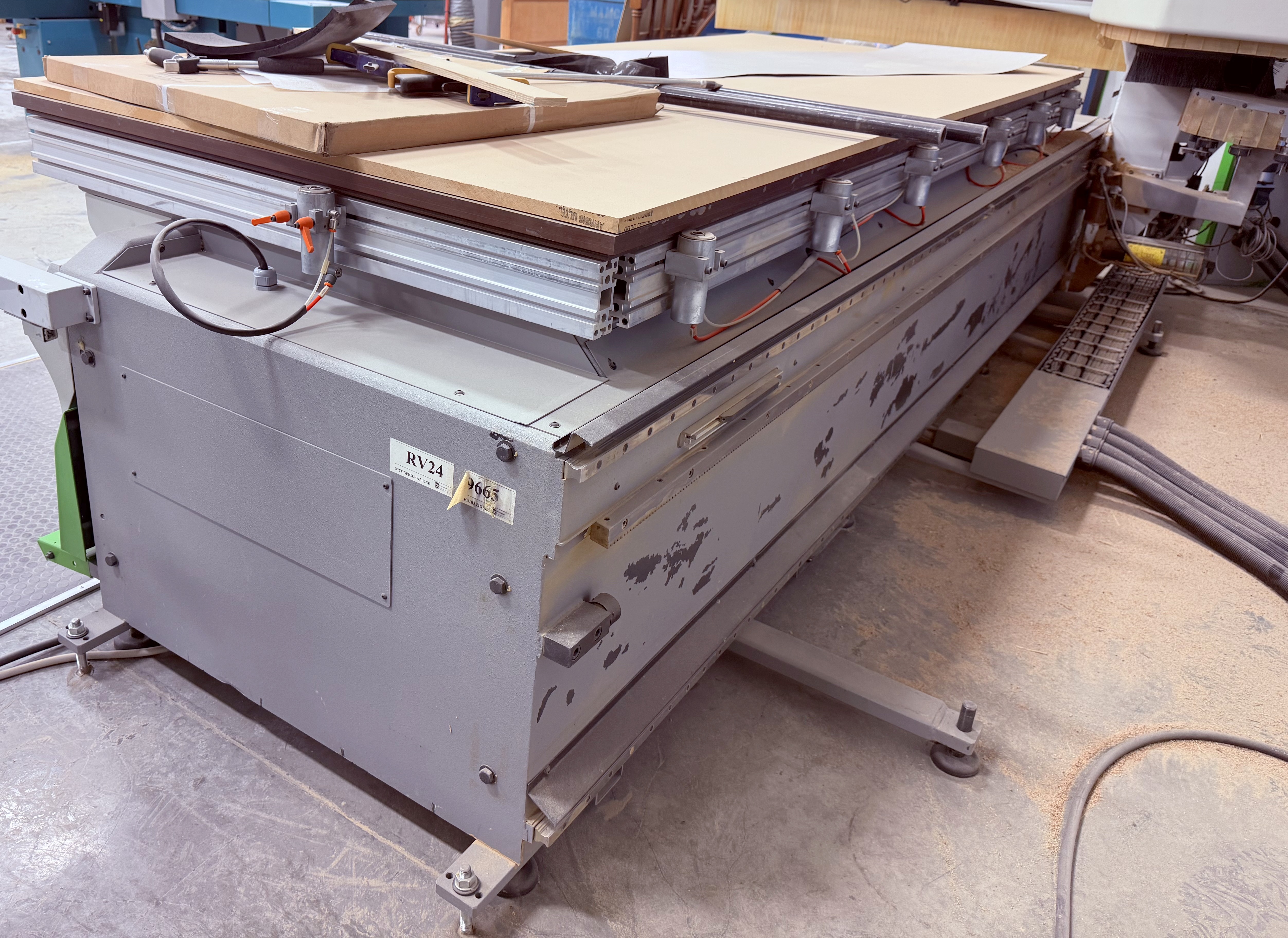 Biesse Rover 24 FT Router Series # 09665 Year: 2001 Power Supply: 20 KW, 480 V, 28 A., 60Hz., 110 24 Low Tensions Air supply: 7 minimum Bar Suction Air Speed: 30 M/1 Vacuum Pump Additional photos and details available Router is still hooked up and running. Price INCLUDES dismantling & loading! Freight rates are available upon request.
